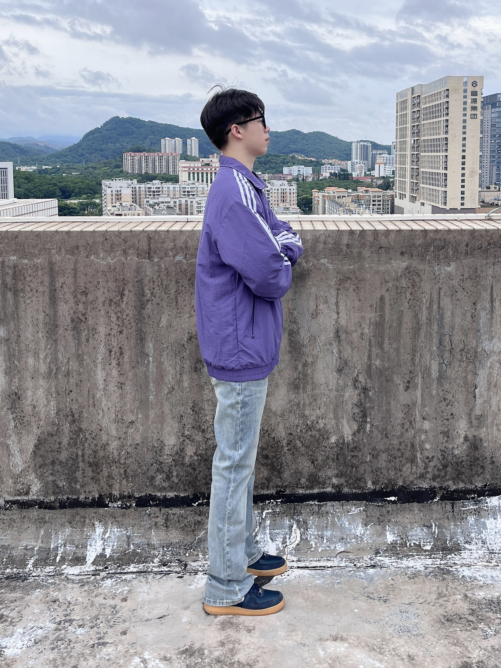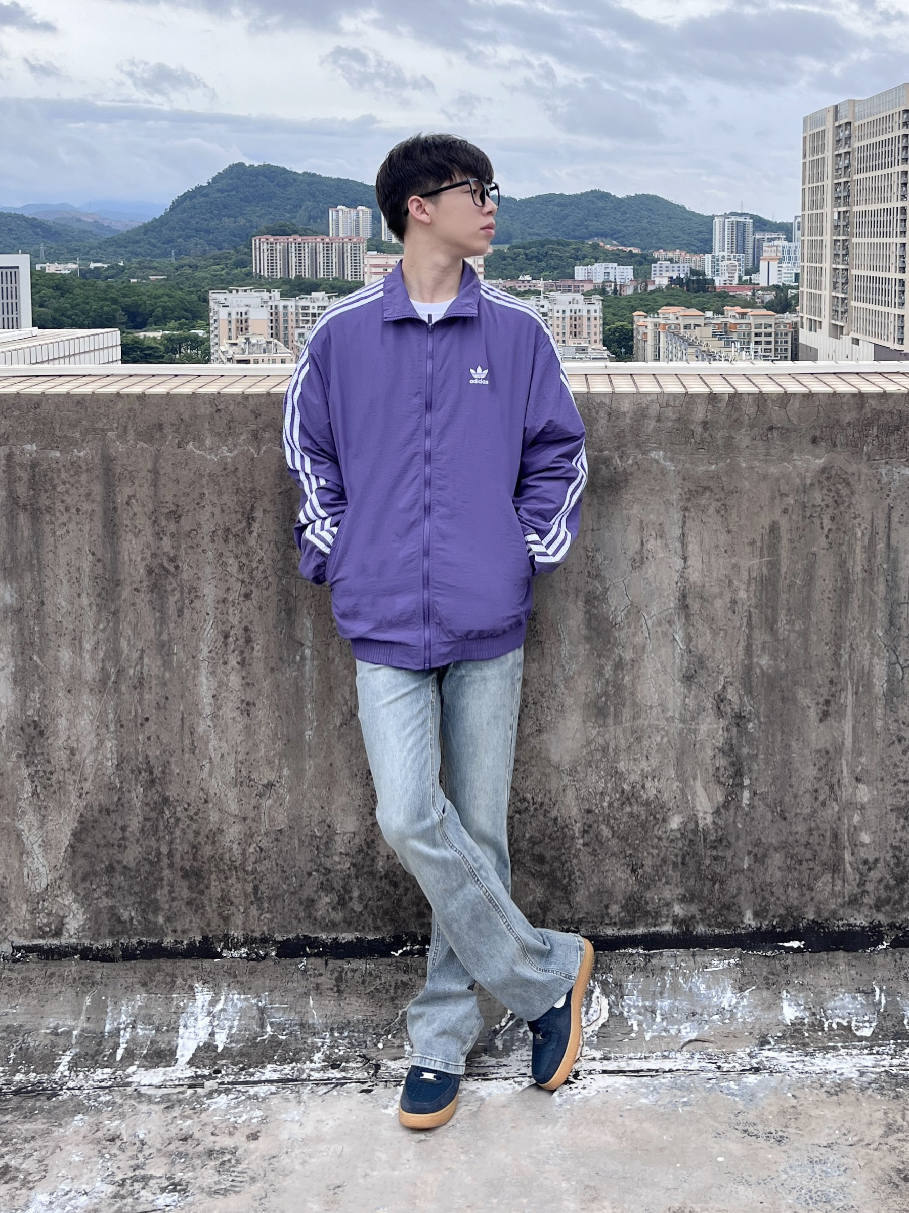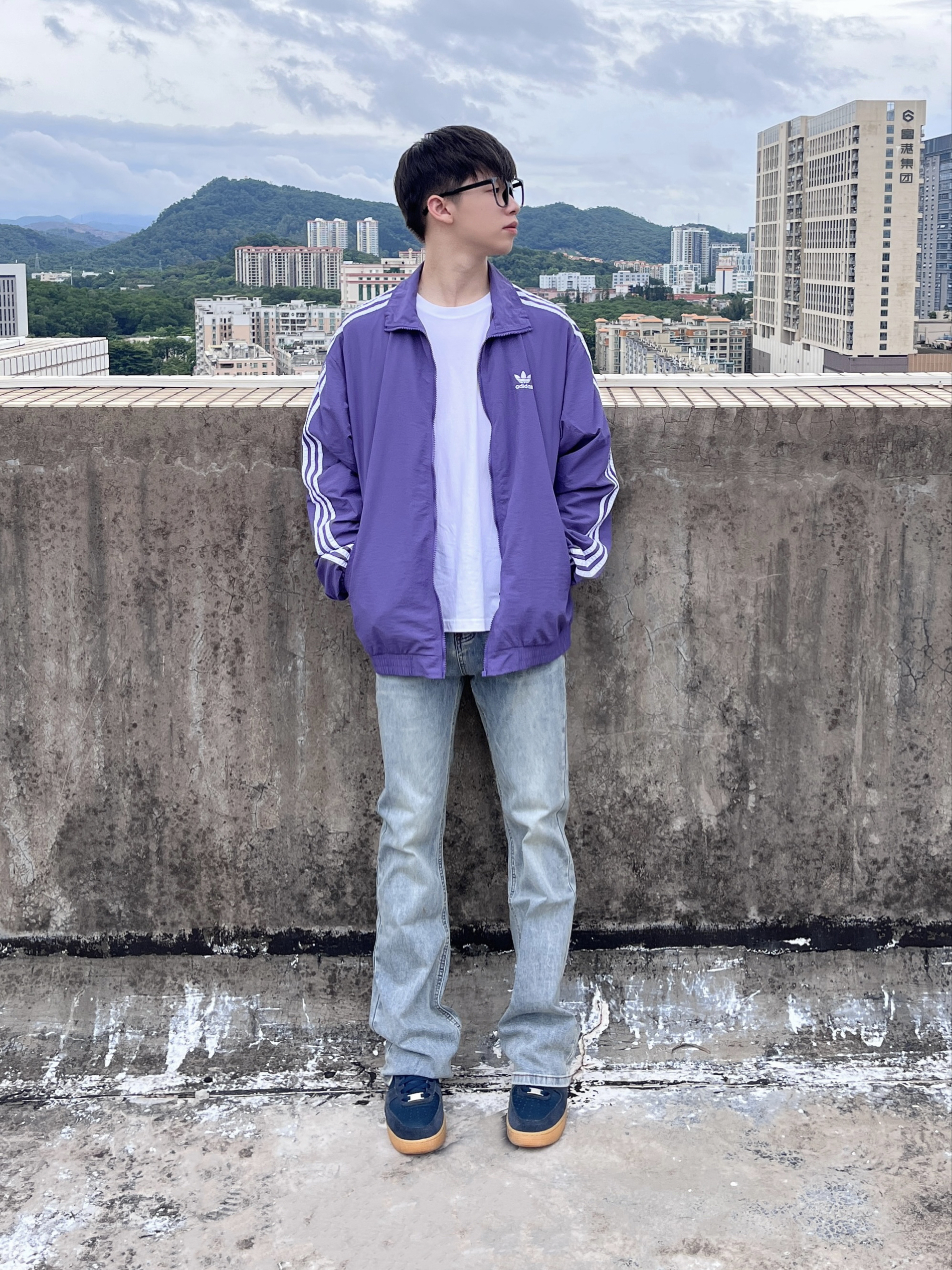 今日份穿搭分享look👀 衣服是紫色阿迪条纹外套👔 搭配上 COOLALPACA 的水洗蓝牛仔裤👖 颜值简约时尚 微喇版型宽松显腿细🔥 一套搭配下来 早秋出街百搭又好看