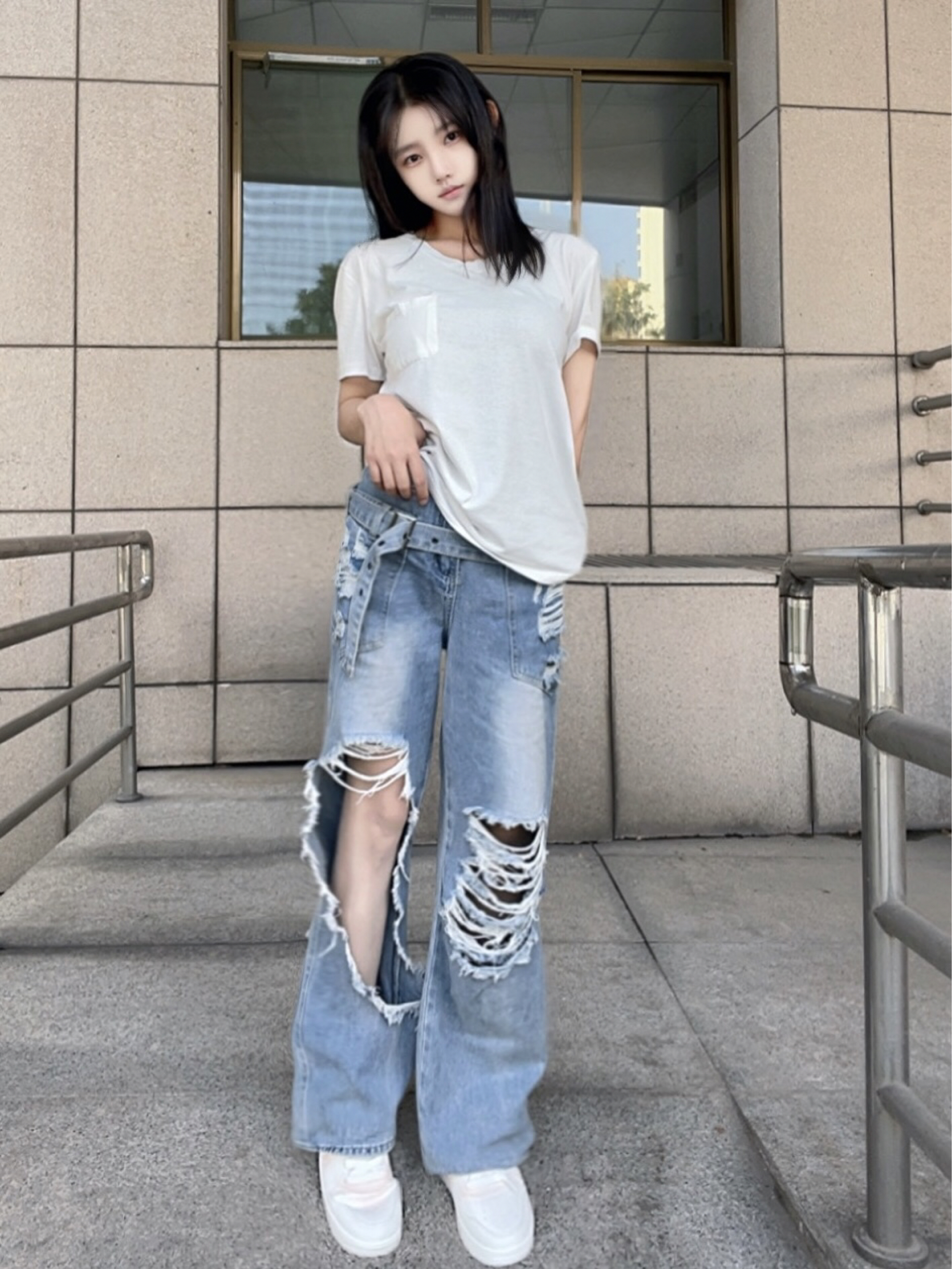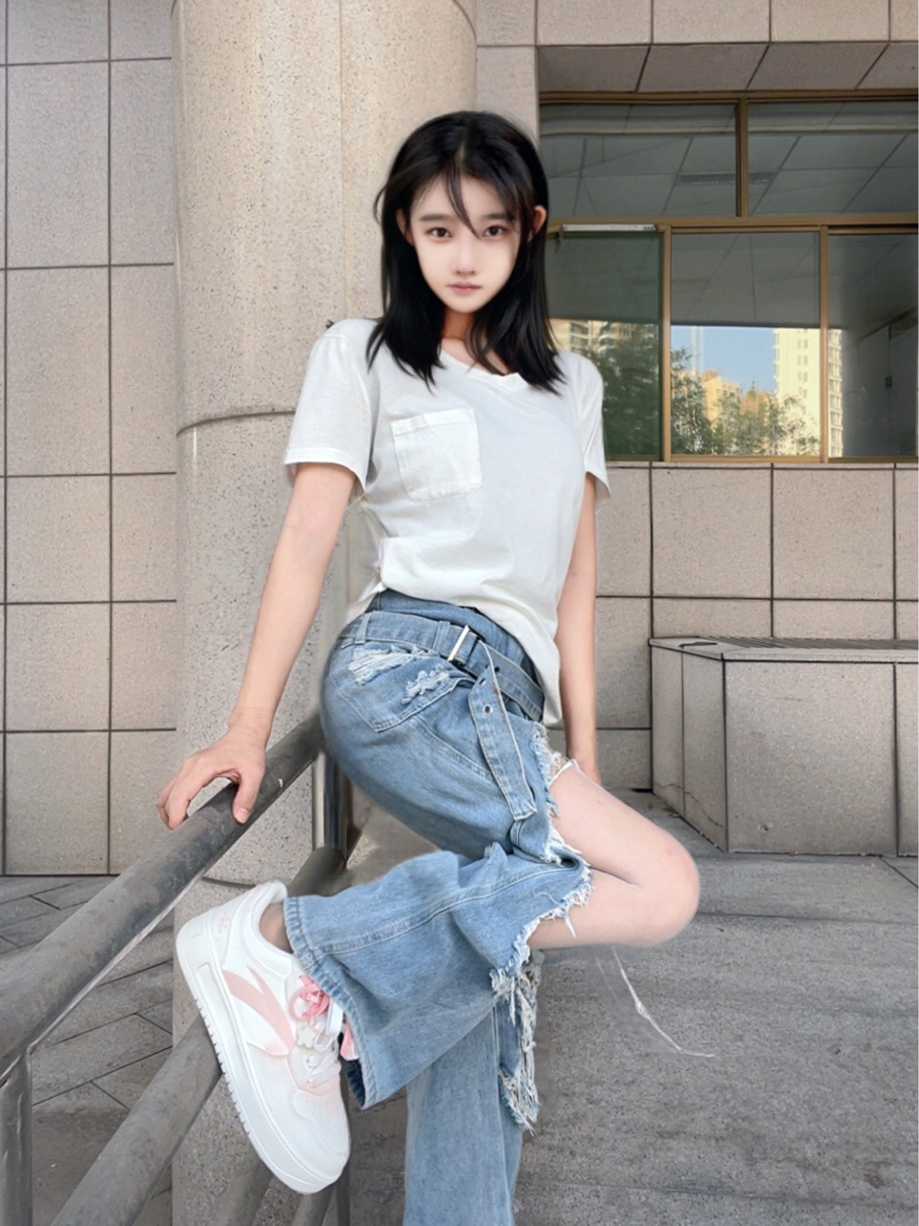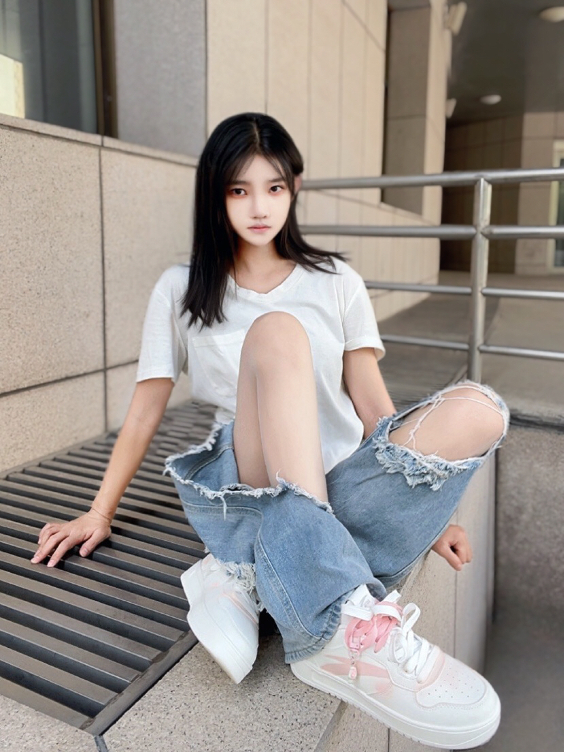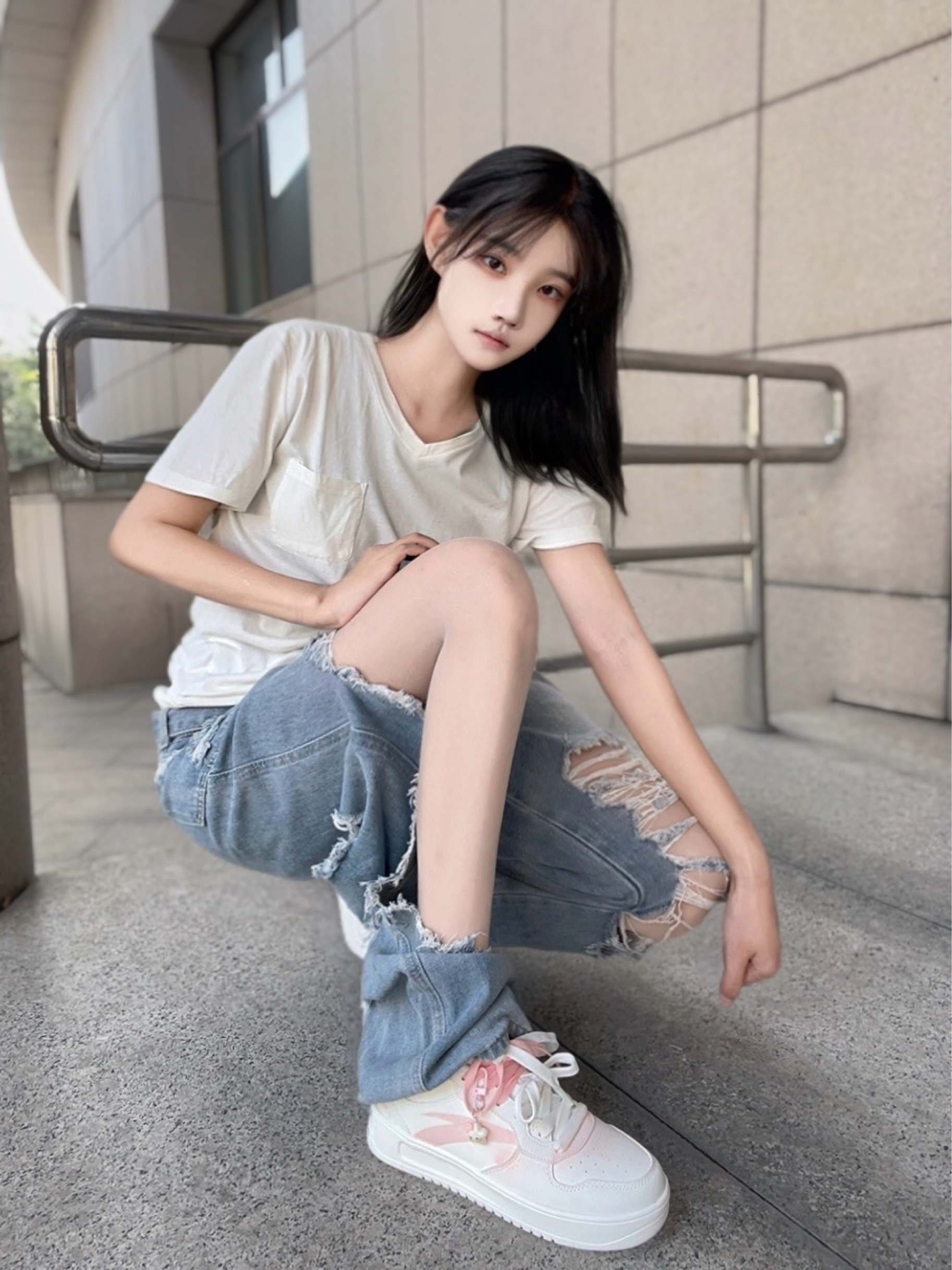 *傅傅今日设定🪪: 帅气不分性别,风格自有态度! 酷酷的长发女生出街😎看似随意实则讲究~ *搭配灵感✨: 纯色t恤+破洞牛仔裤 柔软舒适和不羁个性的碰撞👀妥妥的“懒人帅感” 脚踩一双经典板鞋 很正的奶粉色💕一点也没有色差 穿着脚感也很轻,整体LOOK里最出其不意的风格锚点,平衡一身的清冷,帅得更有层次! *造型利器👟:安踏