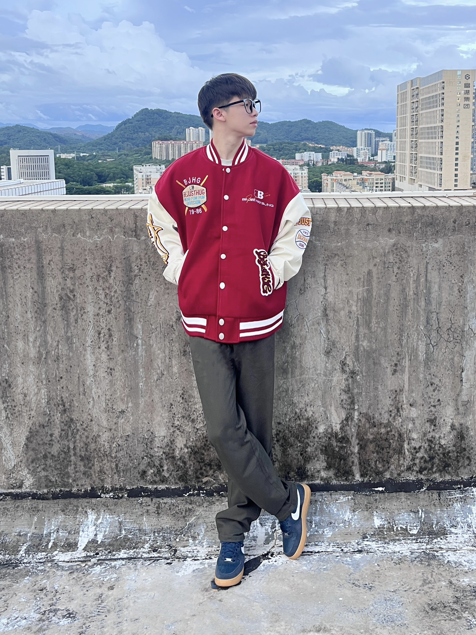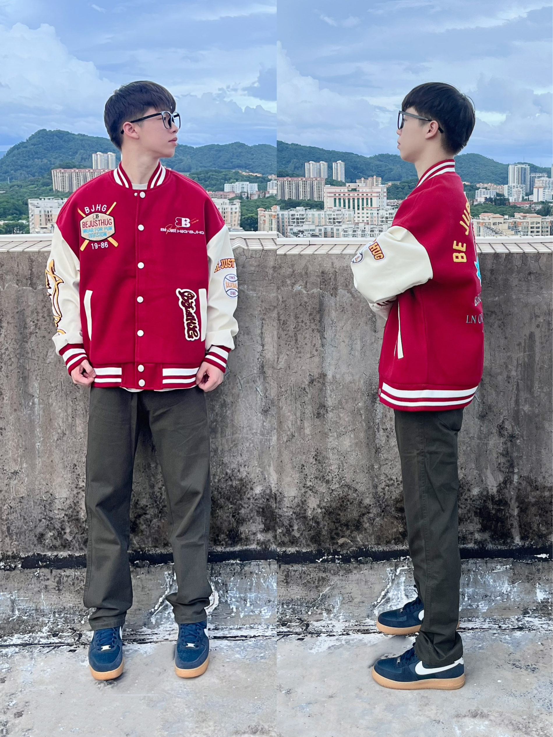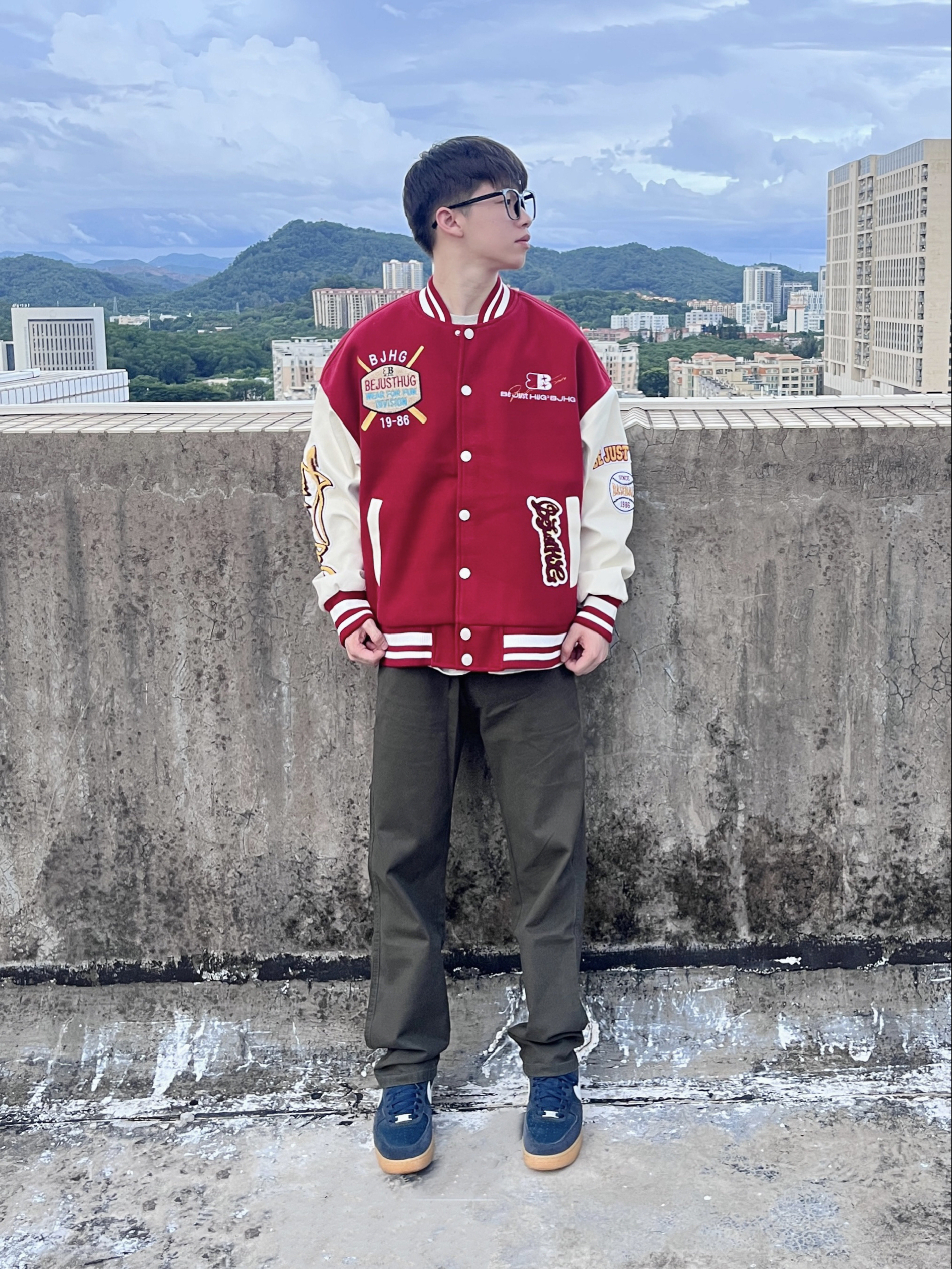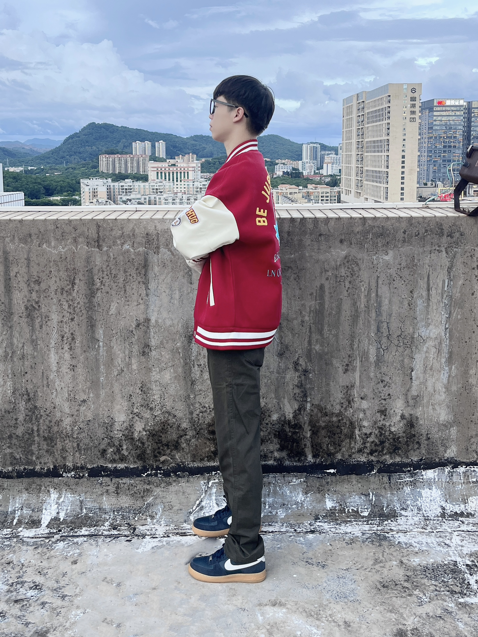 今日份穿搭分享look👀 衣服是红色美式棒球服👔 搭配一条 [dme] 的军绿色直筒休闲裤👖 颜值简约时尚 中腰版型宽松显瘦 一套搭配下来 早秋出行街头风拉满🥰