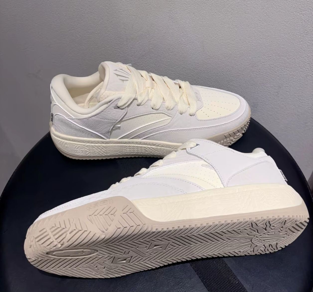 安踏欧文系列,质感拉满! 从鞋盒就开始惊艳的开箱体验,打开是米白主鞋体,皮质鞋面透气孔设计 春夏穿也不闷脚, 鞋跟处11号刺绣和太阳图腾细节鞋底交叉纹路增强防滑性能,搭配西裤意外好看 从球场到办公室无缝切换!