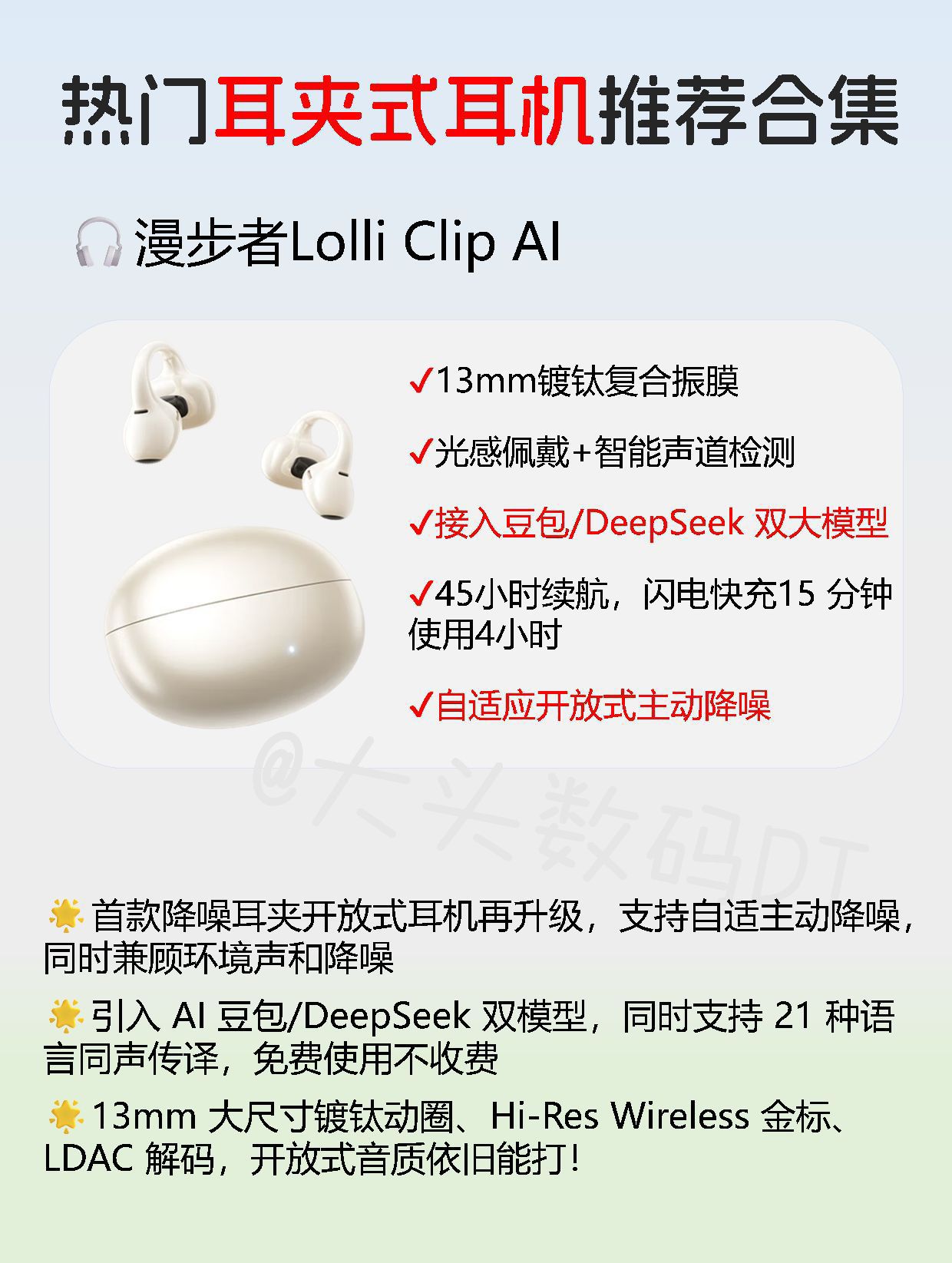 耳夹式的耳机开放的佩戴方式令很多人喜欢,因为在耳道外面,不闷耳,佩戴舒服! 但是市面上产品五花八门,让人眼花 如何选到性价比高,音质不错,带起来不容易掉落又不漏音的耳夹式耳机呢? 今天!带来三款我精挑细选的三款不同价位的耳夹式耳机 从百元到千元,应有尽有,总能找到适合你的一款! 1⃣漫步者QQ耳夹 ✨千元耳机的功能仅200 多的漫步者也能做到!对标千元耳夹有的不区分左右耳、入耳检测功能!让你花...