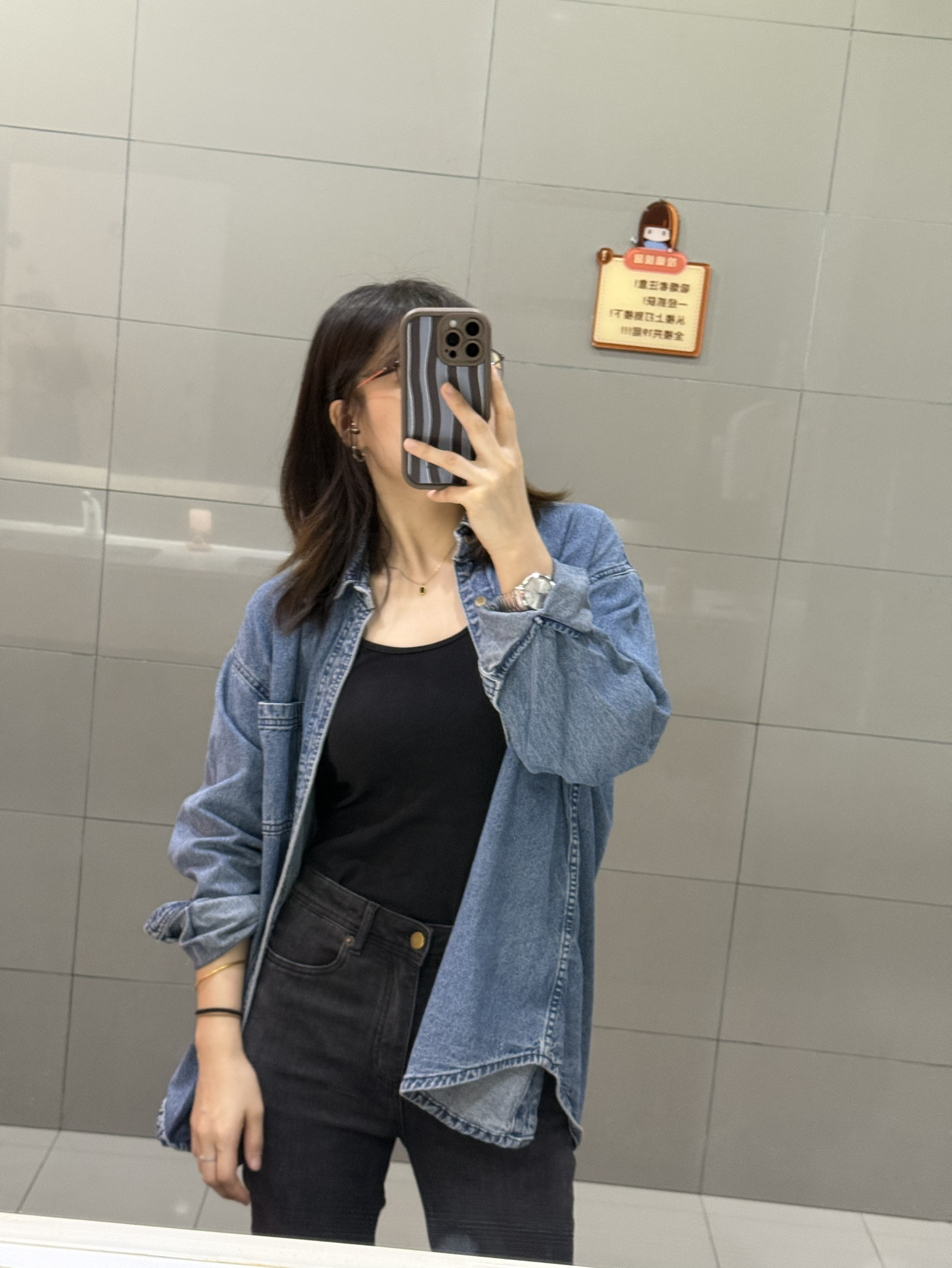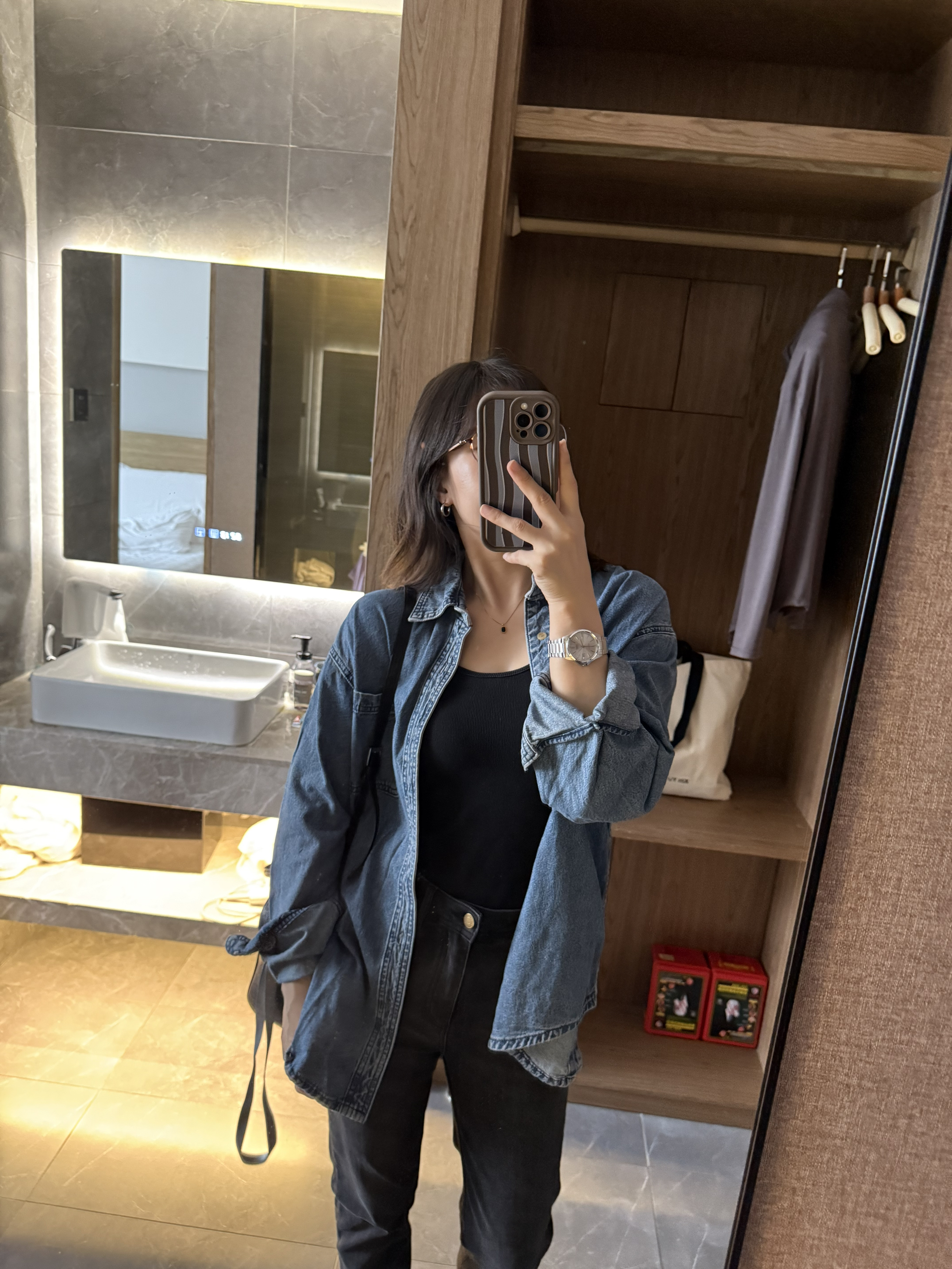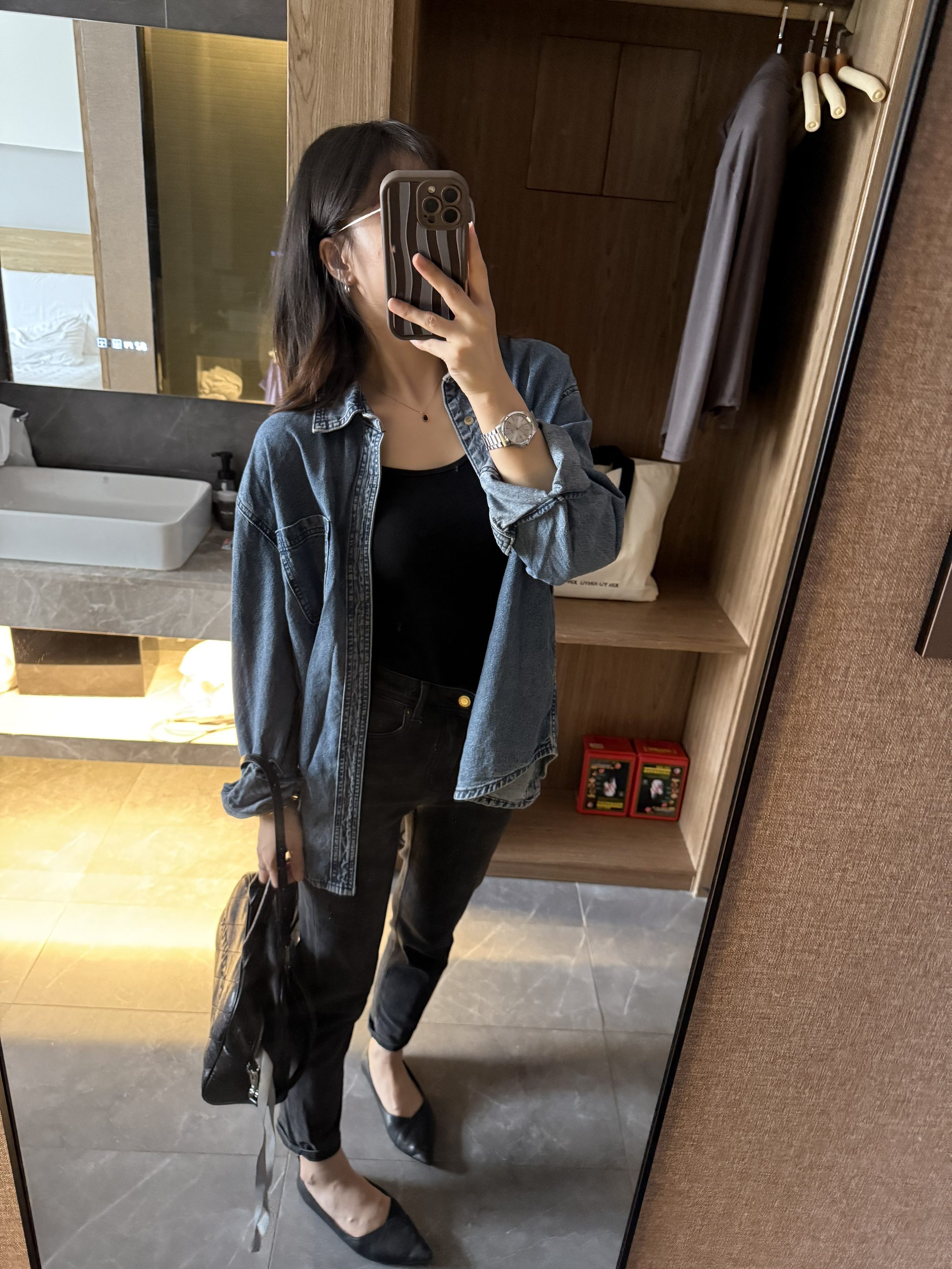 1️⃣ 宽松衬衫+牛仔裤,不强调曲线,却可以穿出洒脱优雅~ 2️⃣金色项链轻搭锁骨,牛仔蓝与配饰的搭配,即精致又不会过🤓🤓 3️⃣经典的牛仔永远不过时,高品质牛仔衬衫是你衣橱中的必备单品~ 4️⃣ 总结:牛仔衬衫+黑色内搭+深灰色牛仔裤+黑色斜挎包:黑色内搭与深灰色牛仔裤相搭,沉稳又时尚,整体造型低调而有质感