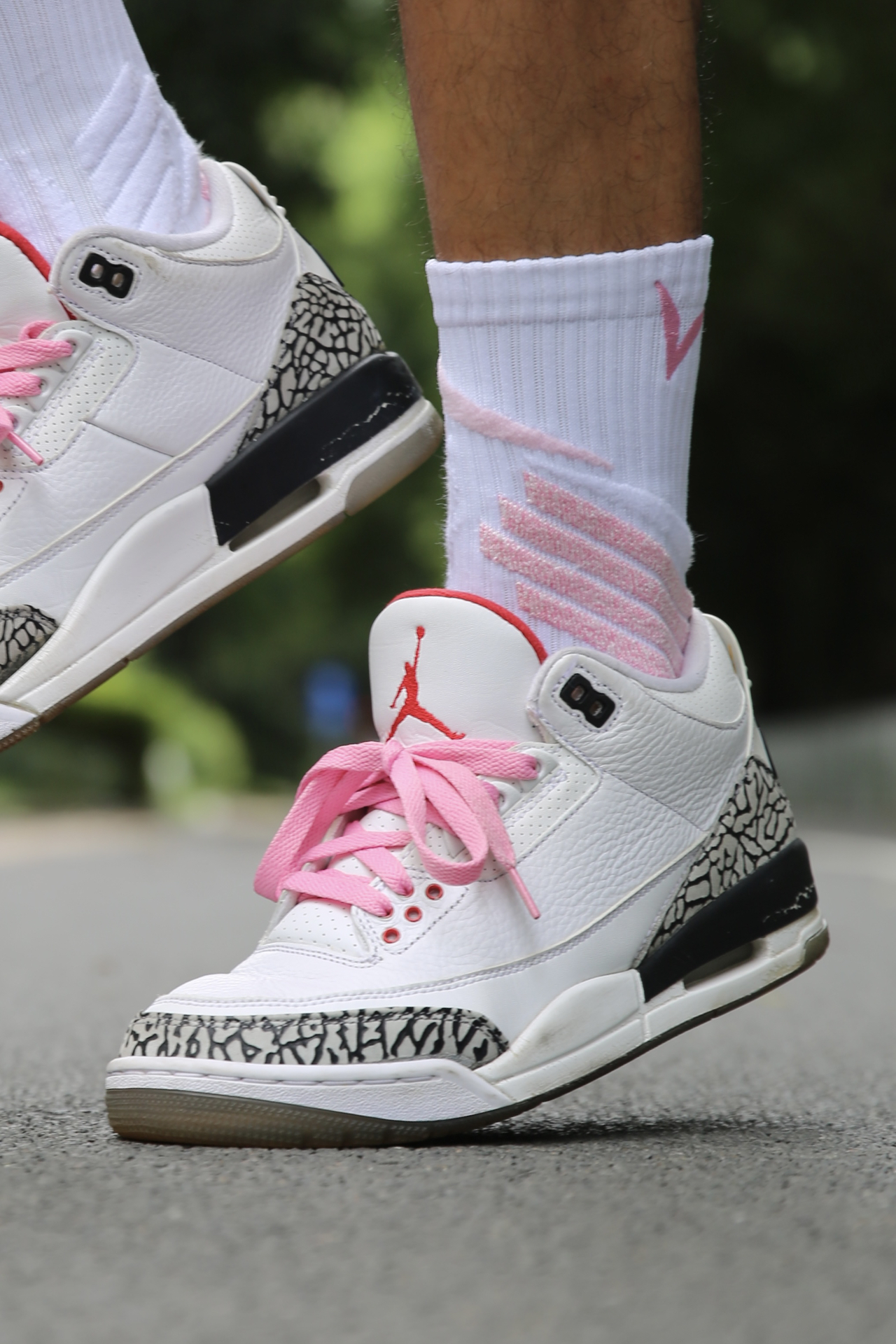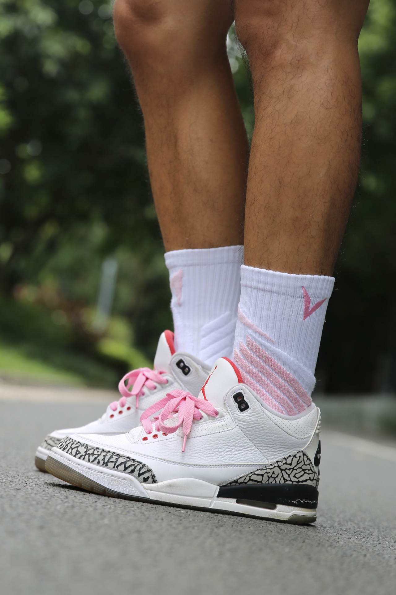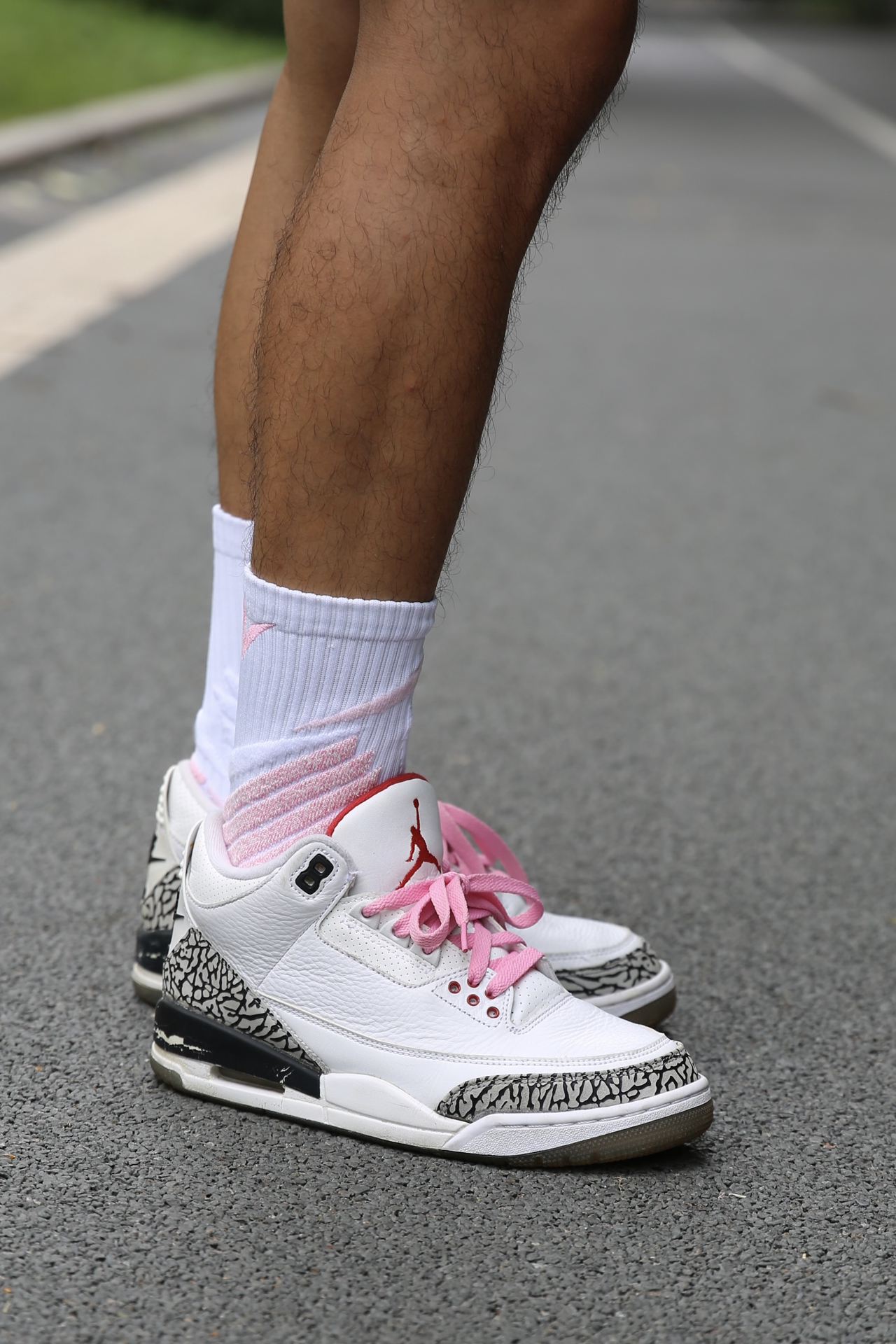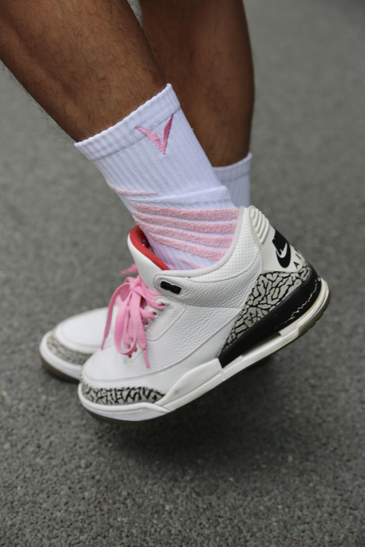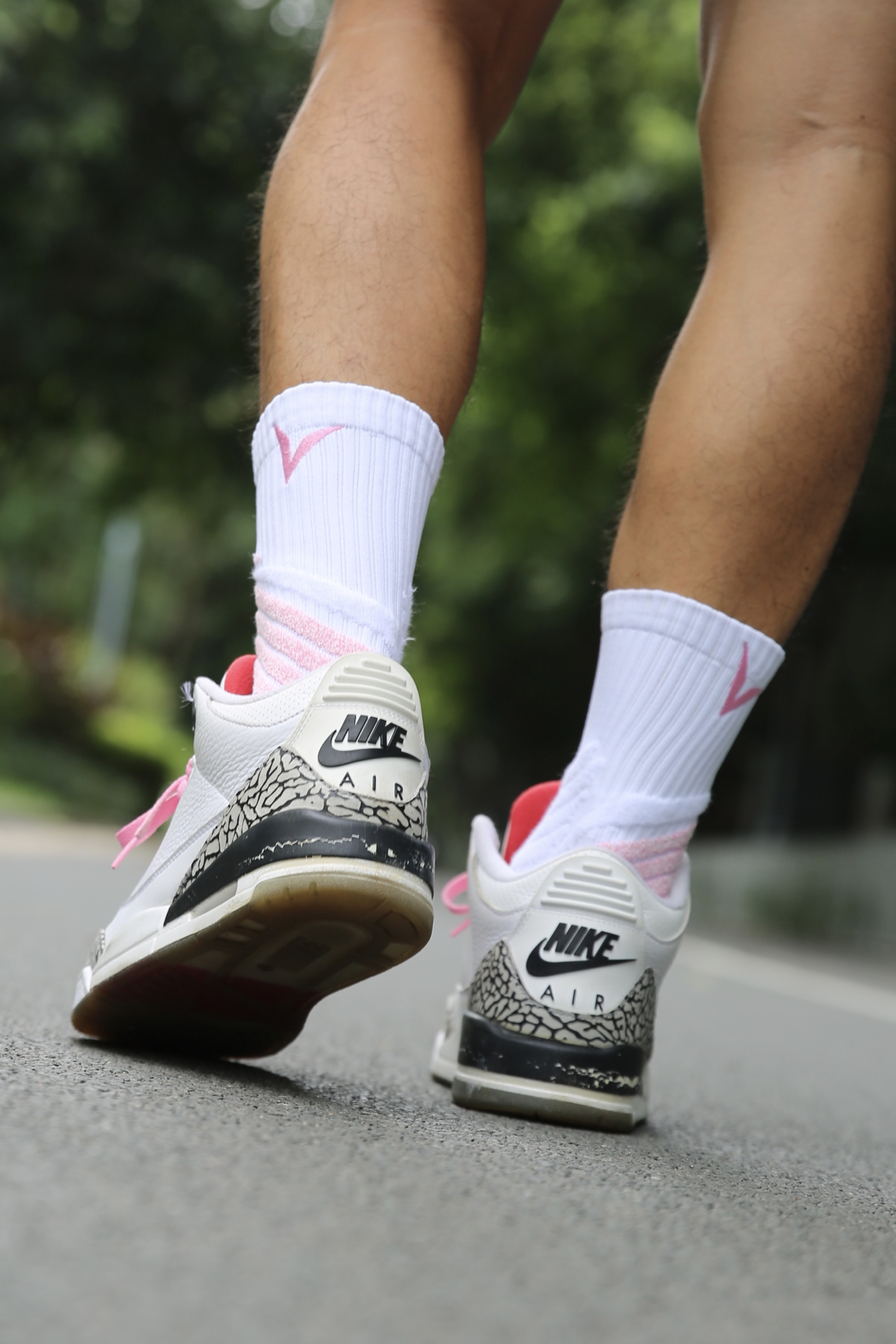 今天搭的是 AJ3 白水泥 + VEIDOORN 律动系列粉色球袜,颜色协调度在线,整体很干净。 袜子厚度适中,吸汗性还不错,运动下来脚感干爽。脚踝位置有立体编织设计,贴合感挺好,包裹不勒也不松。前掌透气区明显,跑动的时候不会闷脚。 偶尔换个粉色,打球的时候看着心情也更轻松,不止黑白灰才是球场标配。 @维动VEIDOORN #黑皮白袜体育生 #维动律动袜子 #经典球鞋不退场 #这双没...