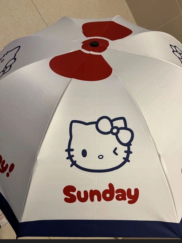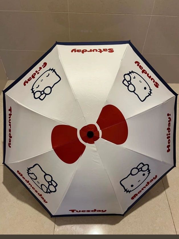 这把Hello Kitty主题雨伞设计颇为吸睛 。其白色伞面上印有经典的Hello Kitty形象,还有标志性的红色蝴蝶结,色彩对比鲜明,可爱又俏皮,极具辨识度,能轻松俘获不少喜爱卡通形象用户的心。伞面上还印有“Holiday”“Sunday”“Saturday”等英文单词,增添了几分趣味与时尚感。