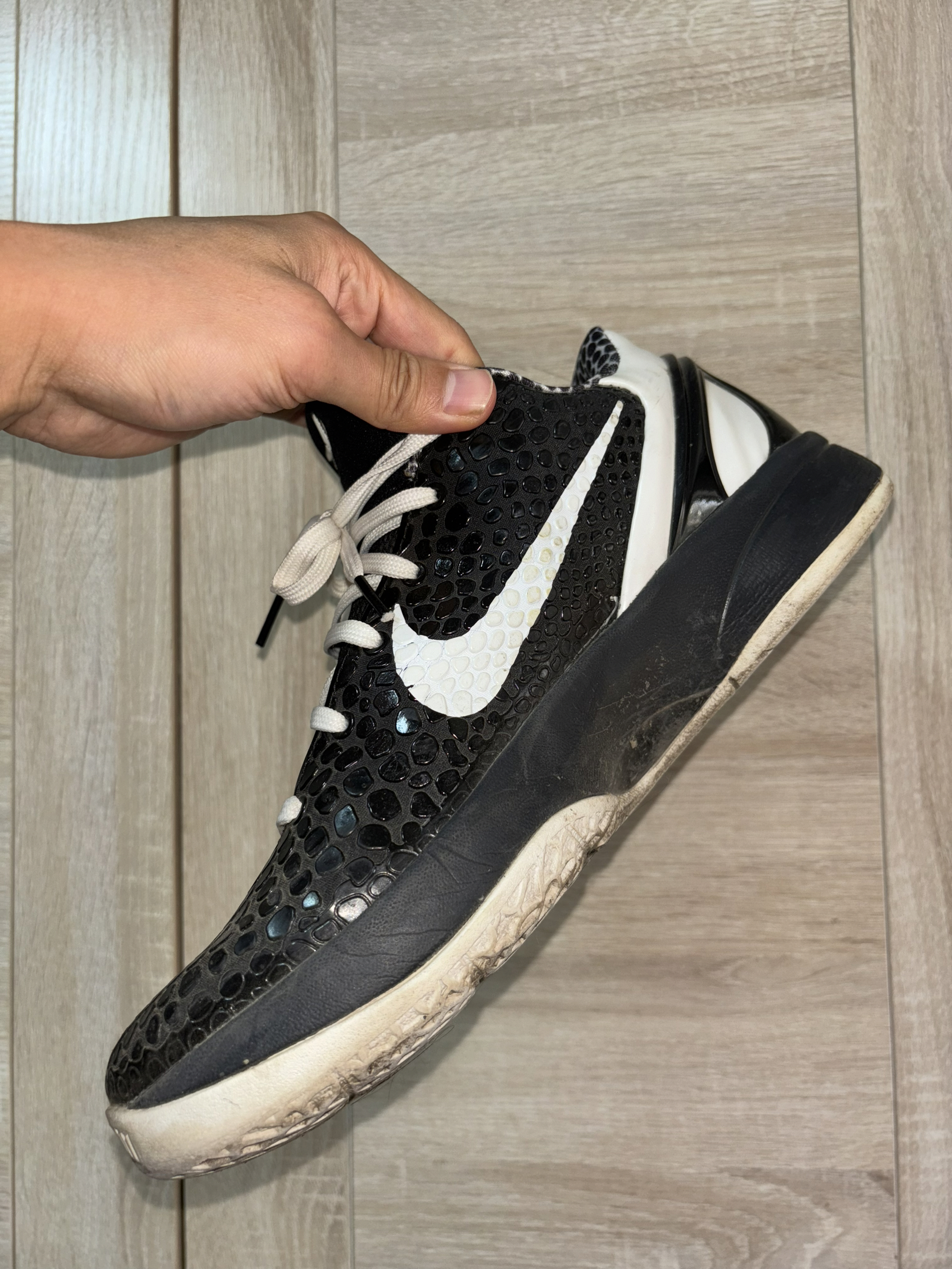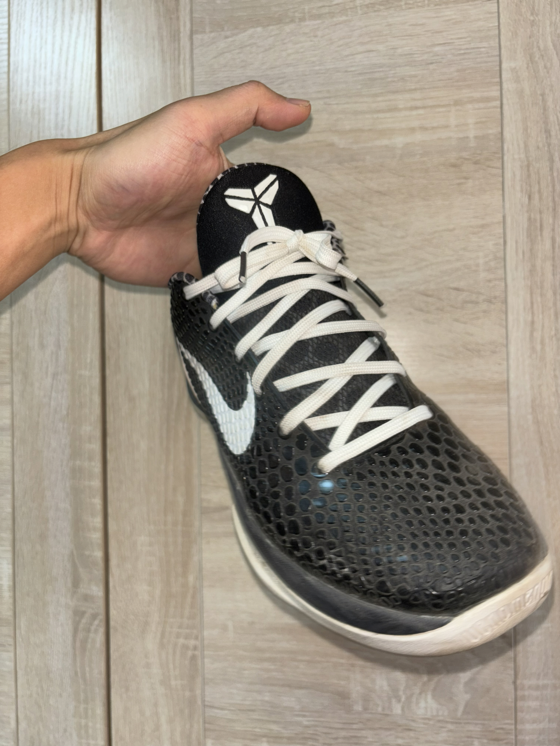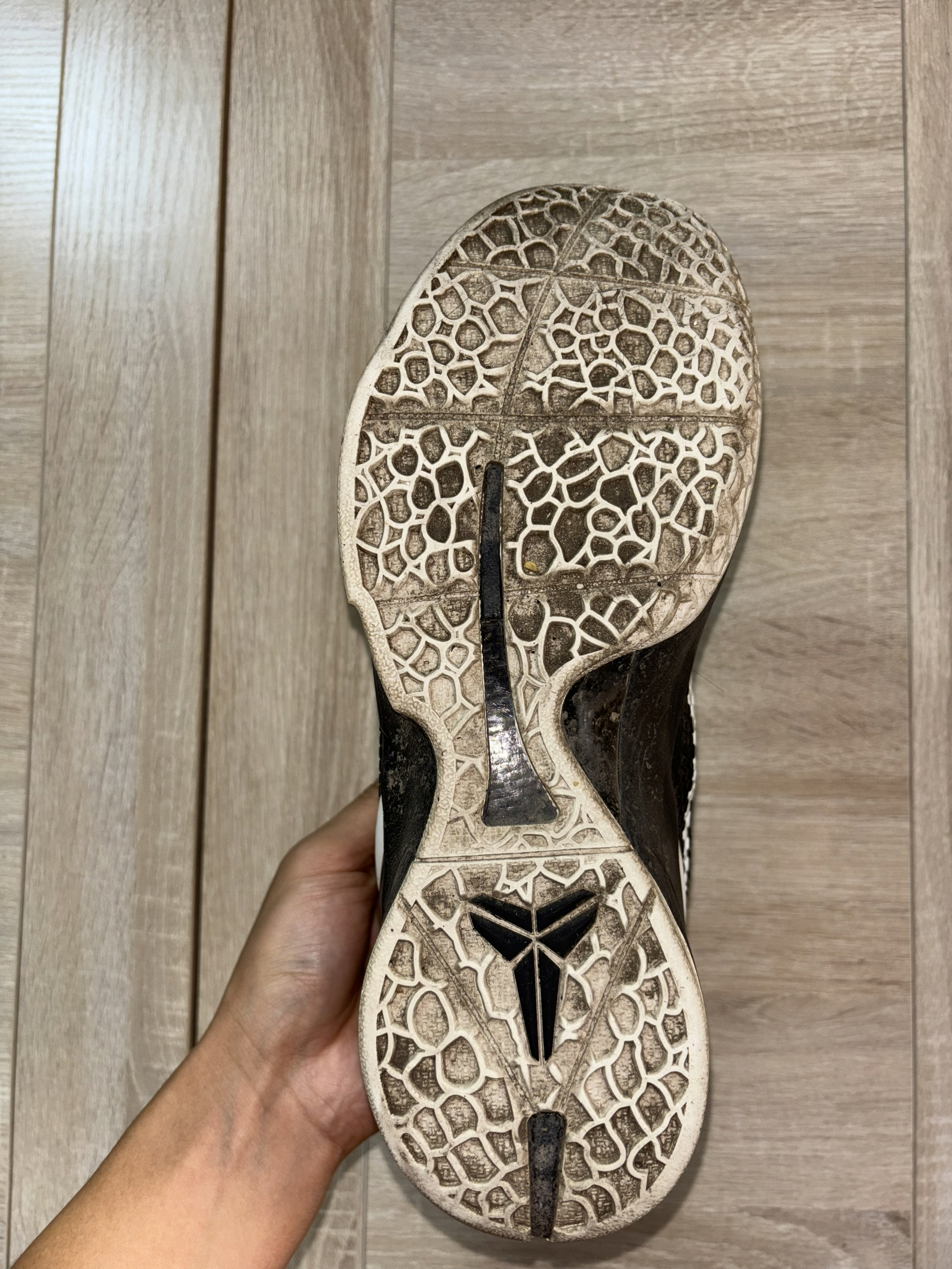 开学第一天借到一双同学穿的科比6黑曼巴 他居然穿成这个样子了 他全都是打的外场 看这个样子鞋型好像有点不太对劲啊 他说全掌都有气垫 还有一块大碳板 很适合他这种暴力后卫打法 兄弟们你们觉得怎么样?