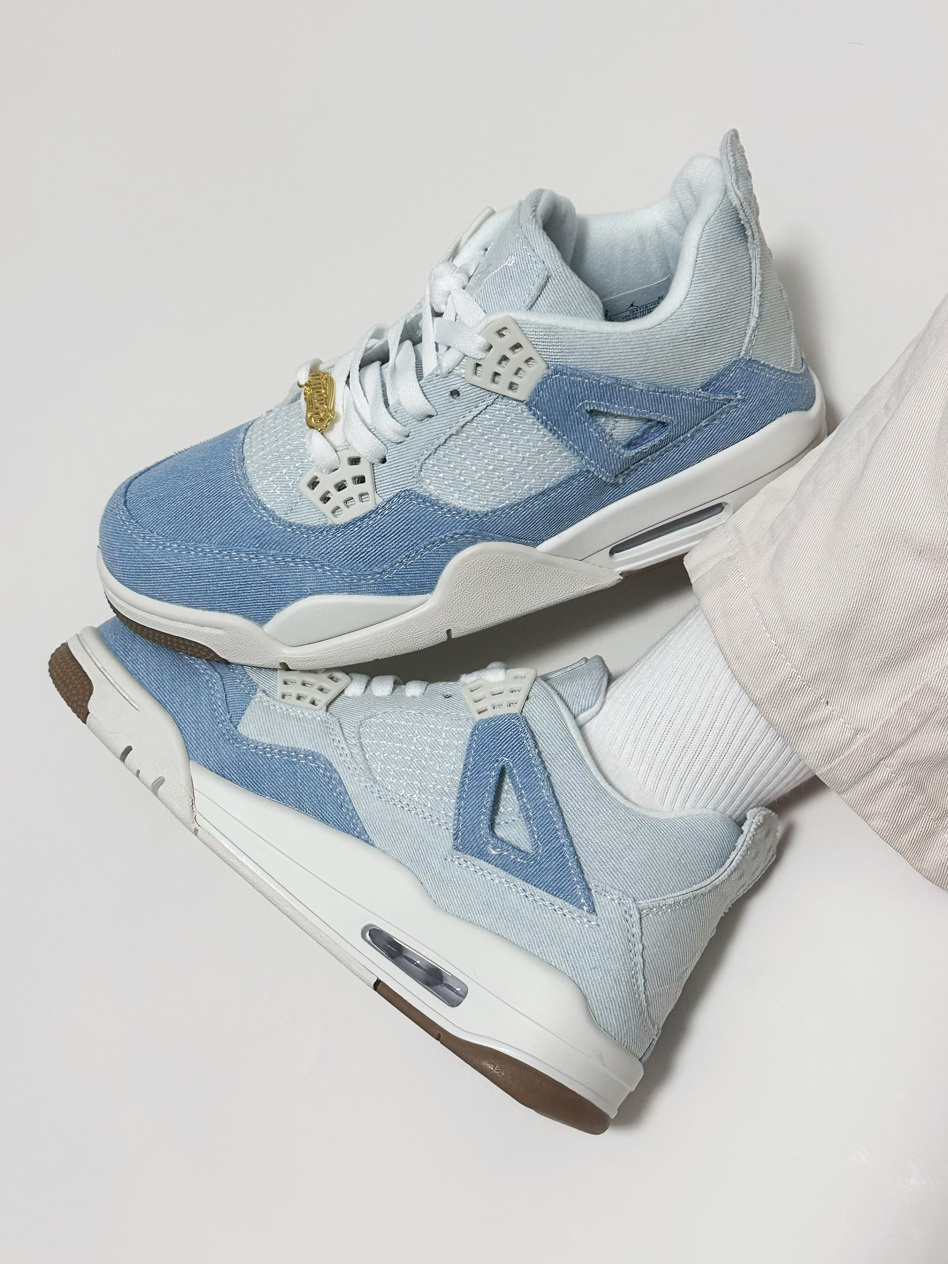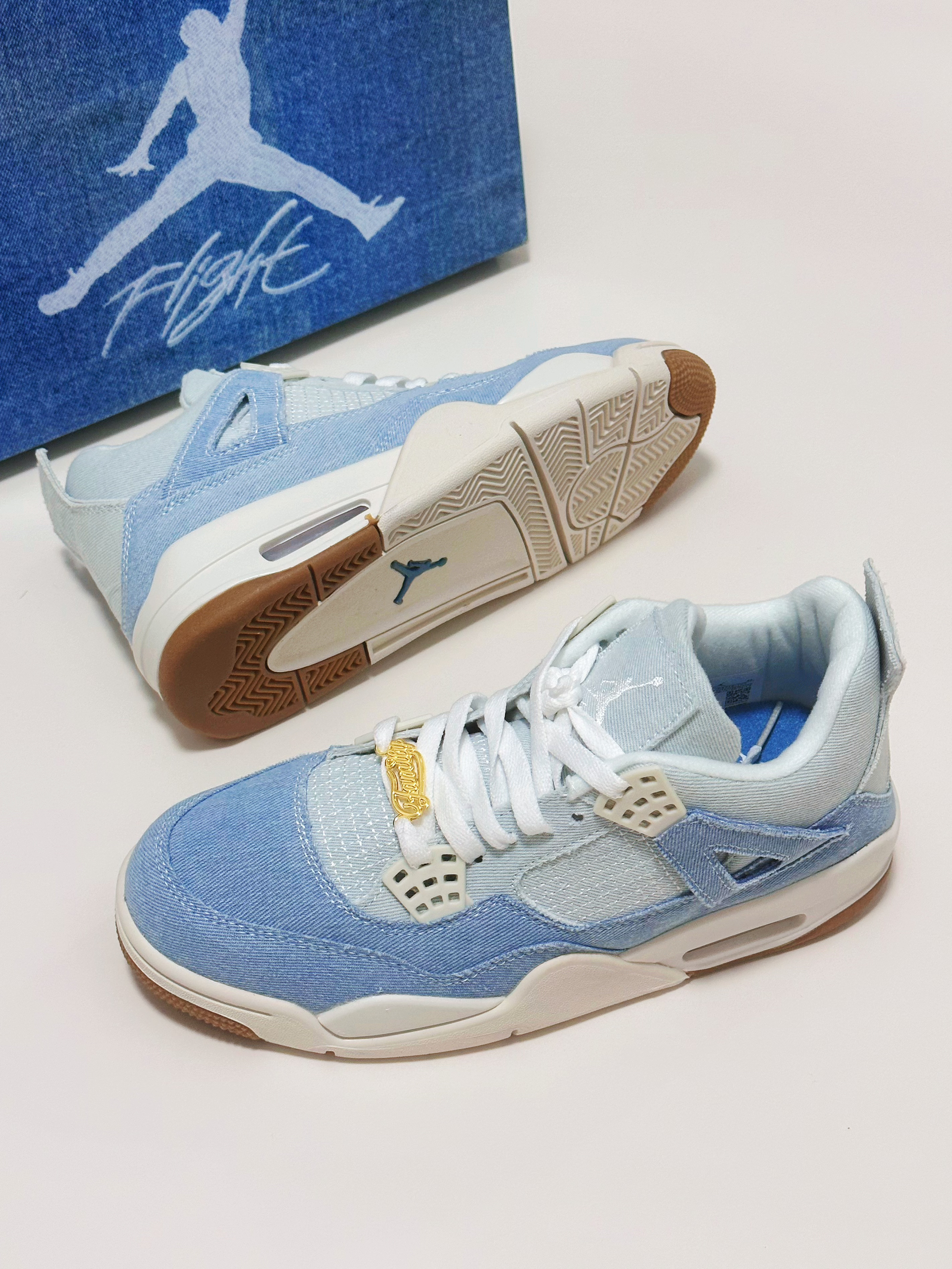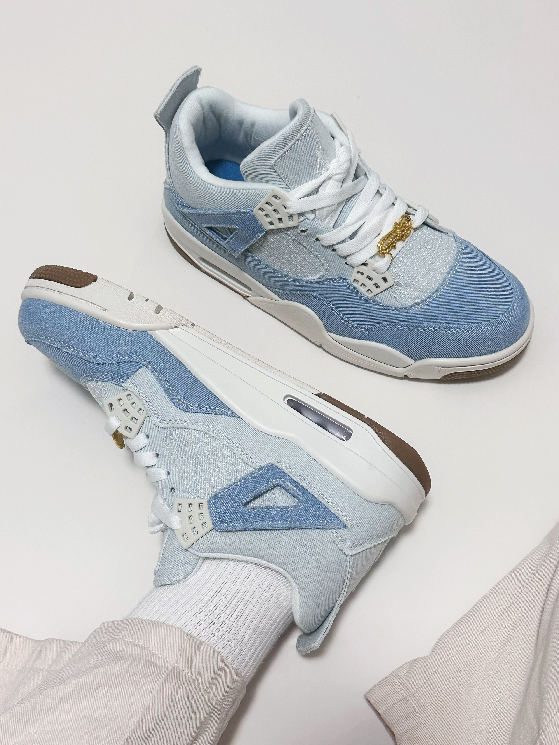 😌入手一周的AJ4牛仔蓝,真的太戳我了~ 鞋身采用丹宁材质,质感细腻又独特,这种材质自带复古属性,让鞋子更具腔调。细节处也很用心,白色的鞋带和鞋扣点缀,与蓝色形成鲜明对比,让造型更显精致。 不过缺点还是蛮明显的,牛仔料子得勤快啊~沾了灰尘就不太好清理🧼,我感觉鞋型偏窄,脚宽的朋友估计要大半码。 上脚舒适度还不错软硬适中,日常穿或去球场耍一耍都没问题,喜欢牛仔风的可以试试~