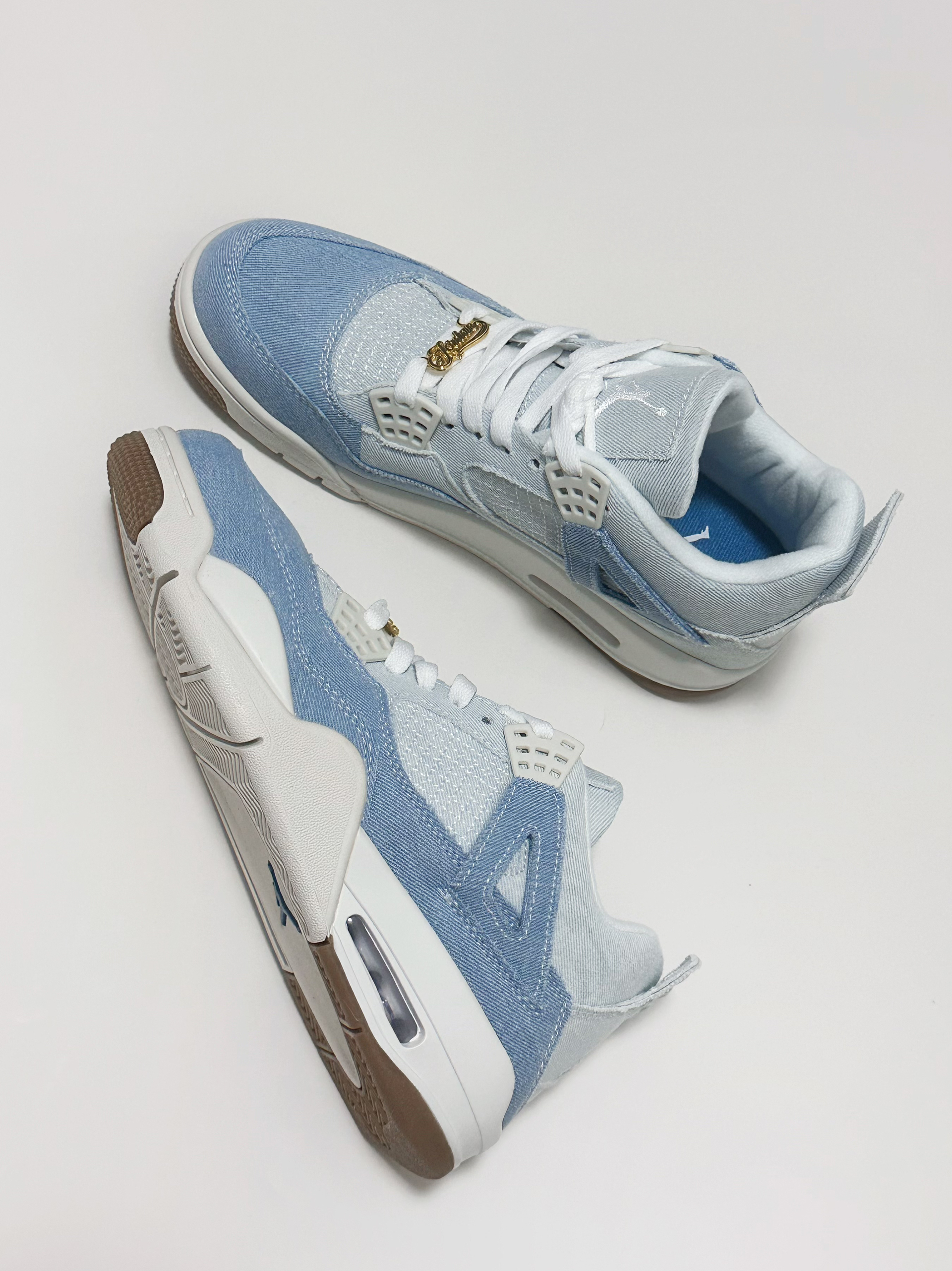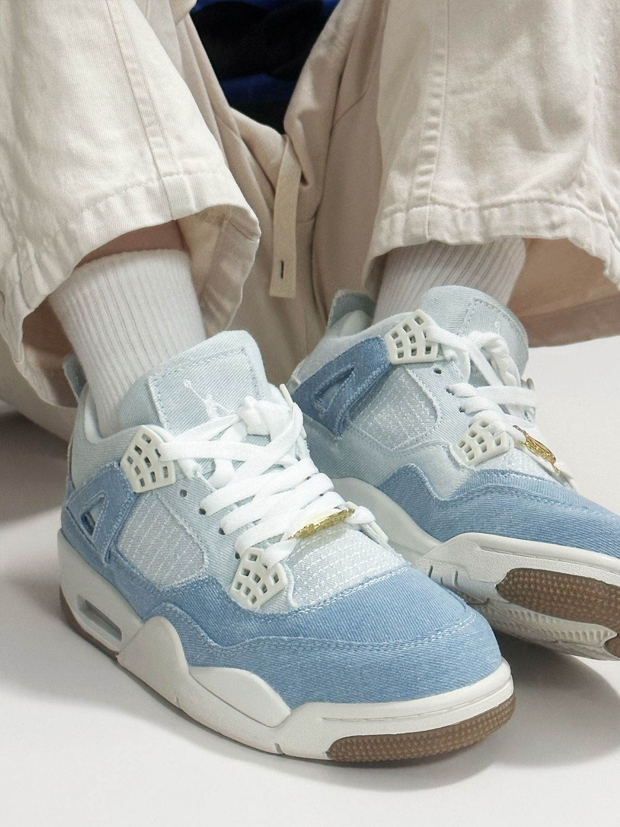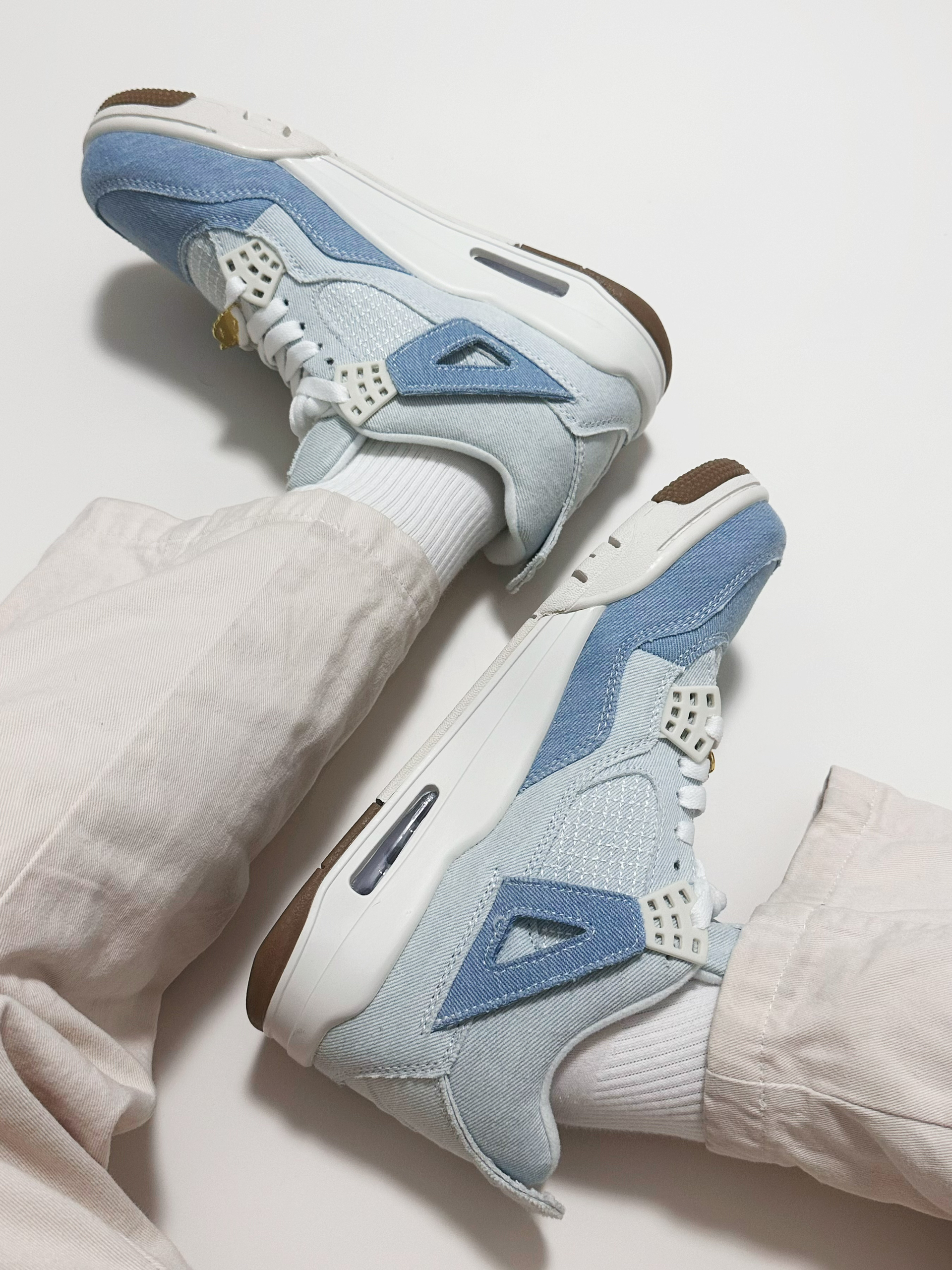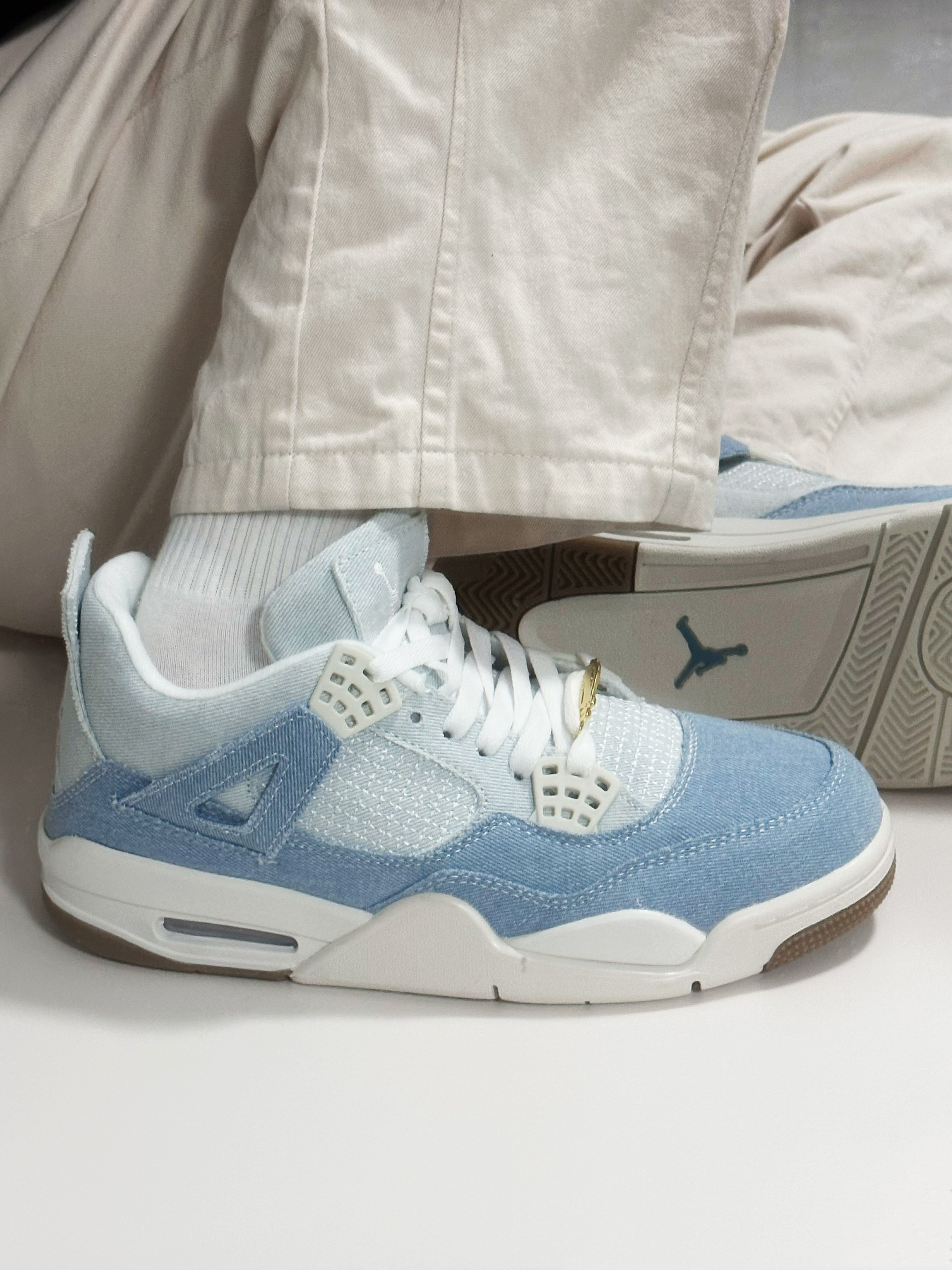 😌入手一周的AJ4牛仔蓝,真的太戳我了~ 鞋身采用丹宁材质,质感细腻又独特,这种材质自带复古属性,让鞋子更具腔调。细节处也很用心,白色的鞋带和鞋扣点缀,与蓝色形成鲜明对比,让造型更显精致。 不过缺点还是蛮明显的,牛仔料子得勤快啊~沾了灰尘就不太好清理🧼,我感觉鞋型偏窄,脚宽的朋友估计要大半码。 上脚舒适度还不错软硬适中,日常穿或去球场耍一耍都没问题,喜欢牛仔风的可以试试~