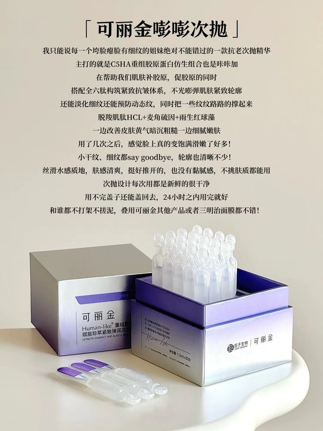 不管是脸还是眼周肌肤都因为地心引力往下垮 比起普通的提拉紧致治标不治本 护肤抗老的尽头真就是补充胶原蛋白 补胶原+促生胶原就成为了护肤重点 讲道理我真的超爱可丽金 抗老一定要试试他们家 用完你会感叹相见恨晚 “巨子生物”听说过吧 国内重组胶原蛋白的扛把子大厂 可丽金就是巨子生物的旗下的抗老品牌 实力就摆在这儿了 而且一直专注于重组胶原蛋白这件事上 专业度那肯定是毋庸置疑的 下料也是真舍得的真材实...