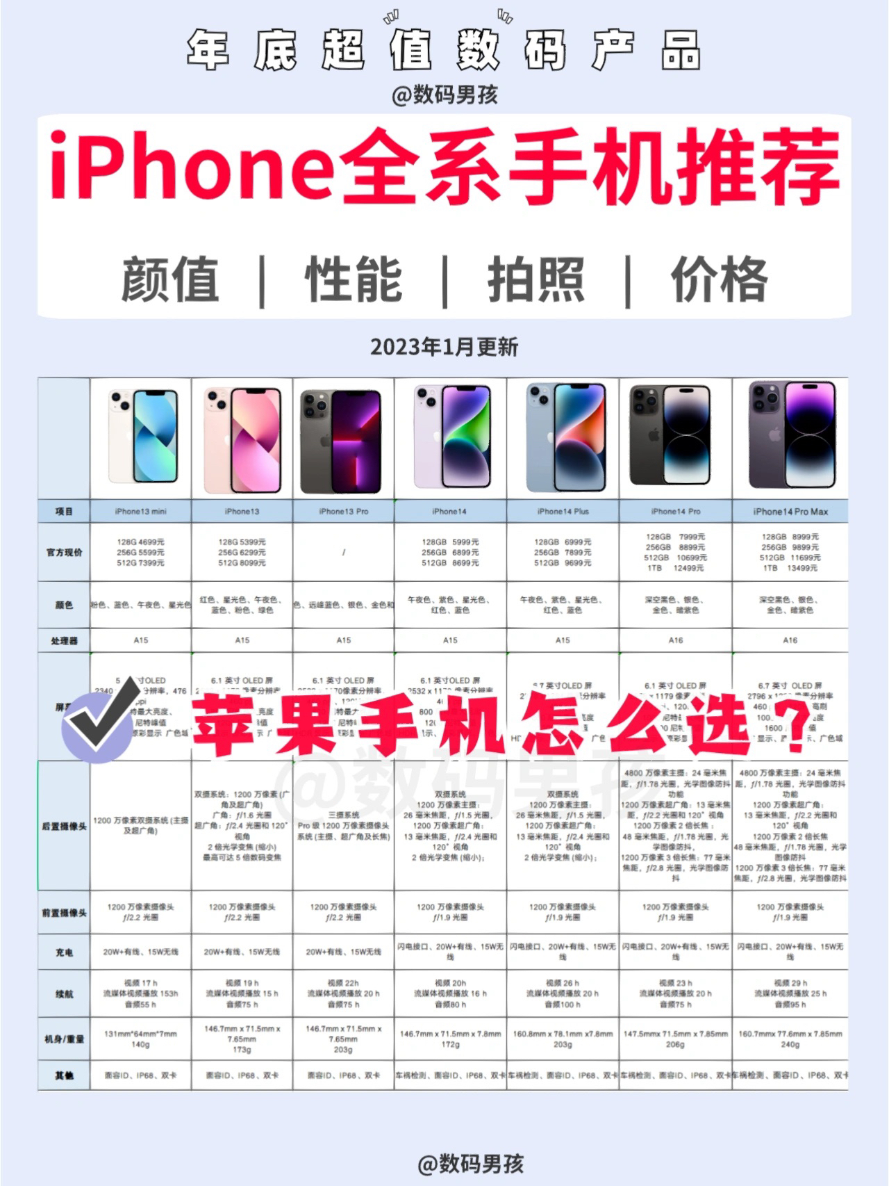宝子们👋 iPhone17要来了,前几代的机也会相对的便宜了,想换手机的宝子们,可以来看看iPhone 前几代的优缺点 iPhone 13 优点:颜值高、性能好,续航可以,性价比高。🔋 缺点:内存4G,运行不快。 iPhone 13 Pro 优点:内存6G,带高刷,续航更好。🔋 缺点:性价比不如标准版。 iPhone 14 优点:内存6G,拍照性能都可以。📸 缺点:与13比升级不大,性...