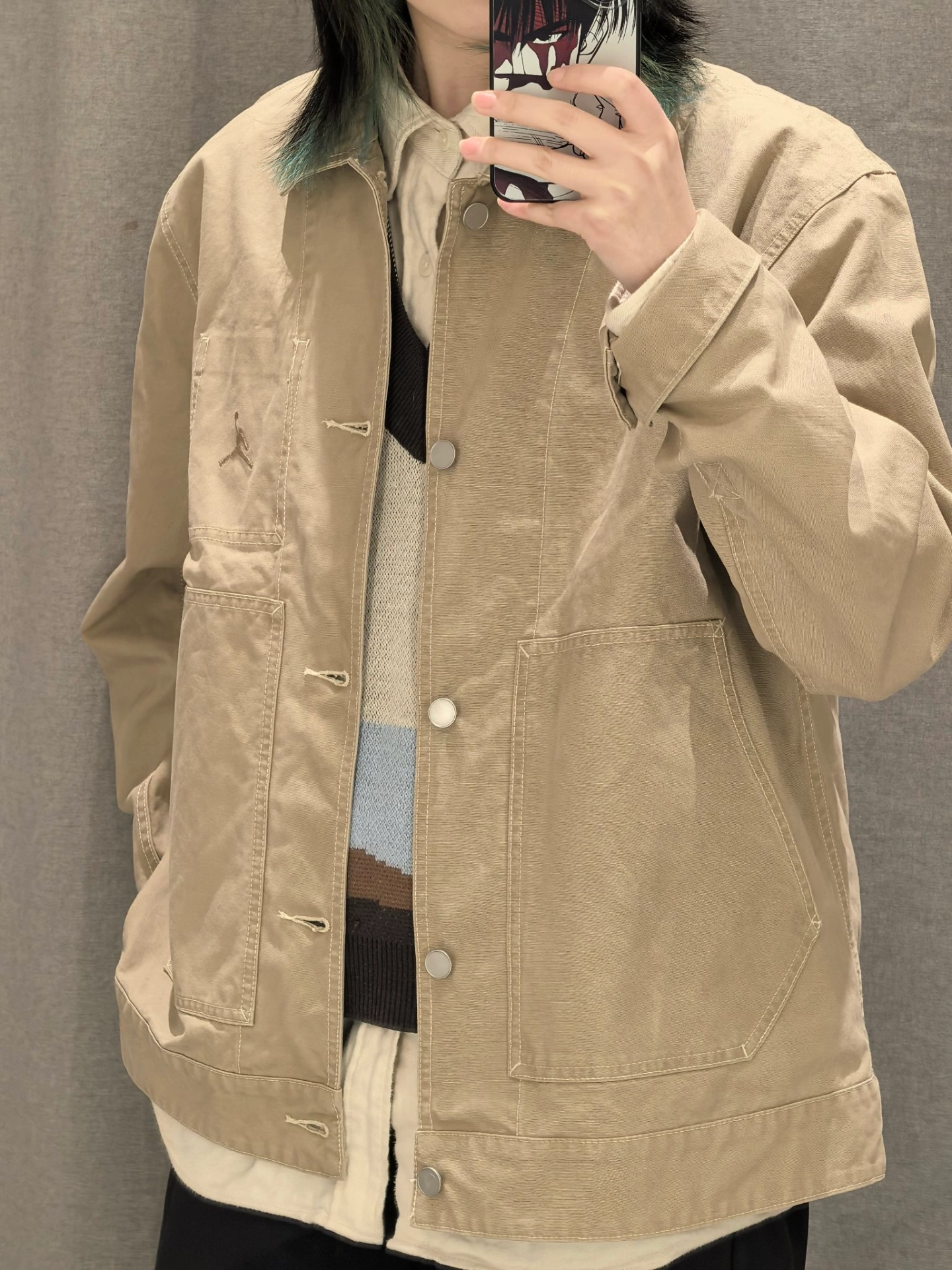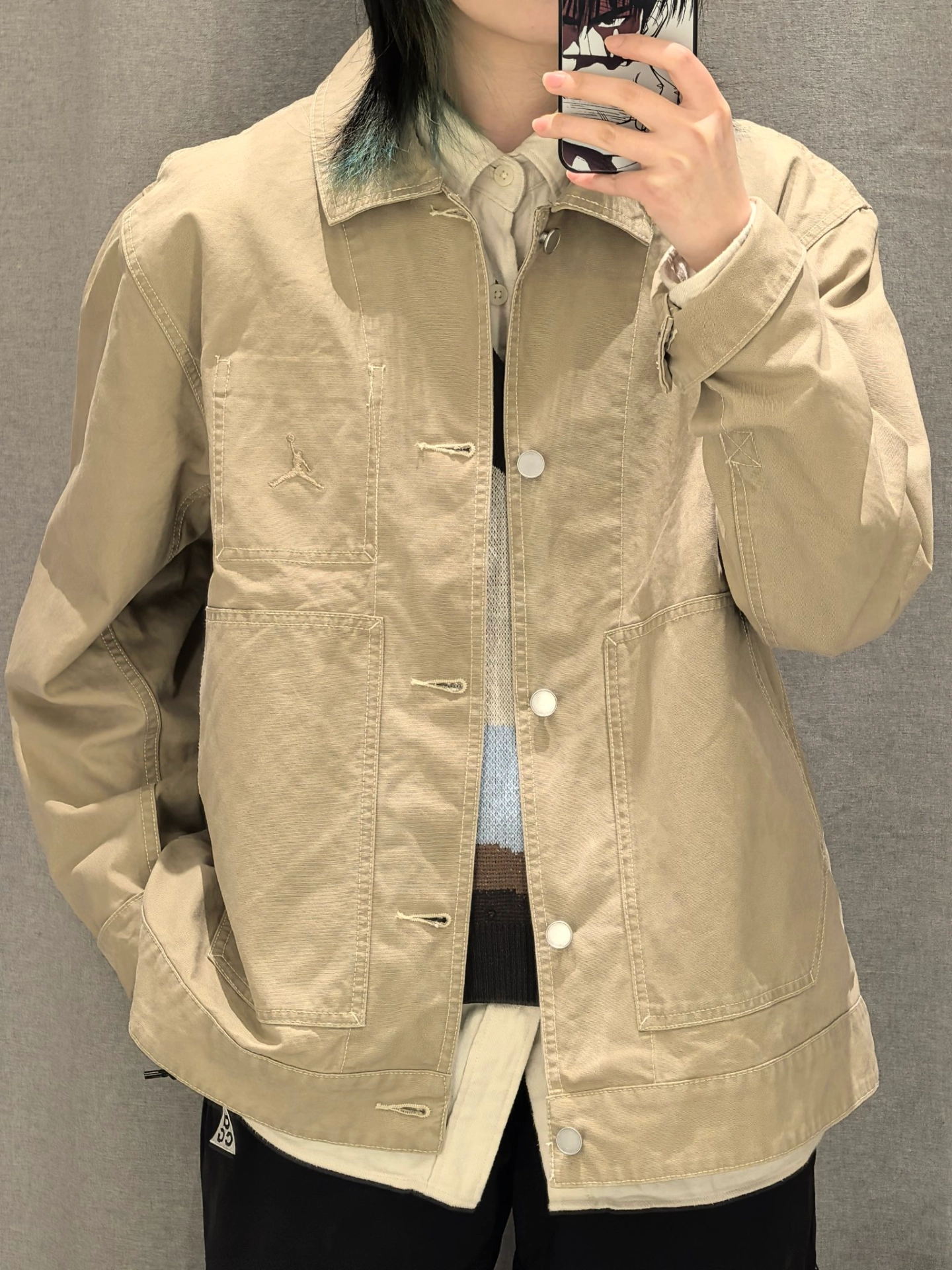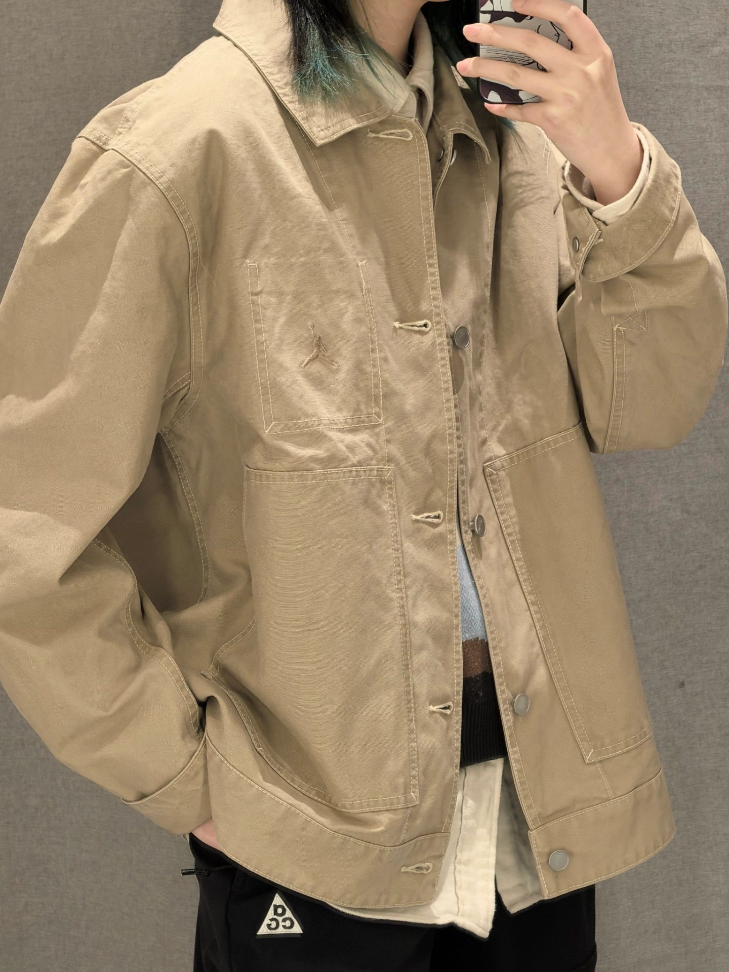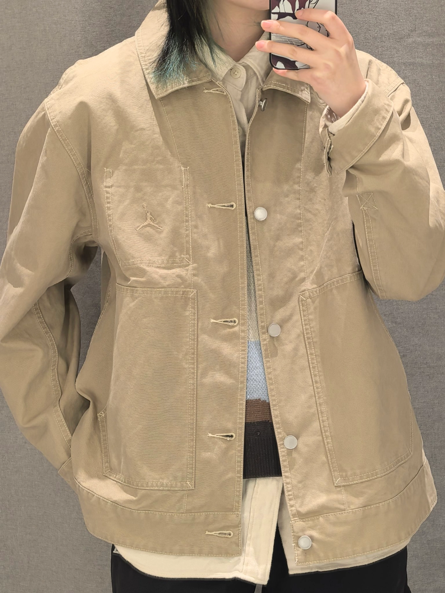 挖到件开春宝藏夹克! Jordan这卡其色好温柔,翻领+宽松版型上身特板正~ 内搭同色系衬衫,松弛帅哥感拿捏! 唯一“缺点”:被要链接到社恐…本AJ党锁死!💯