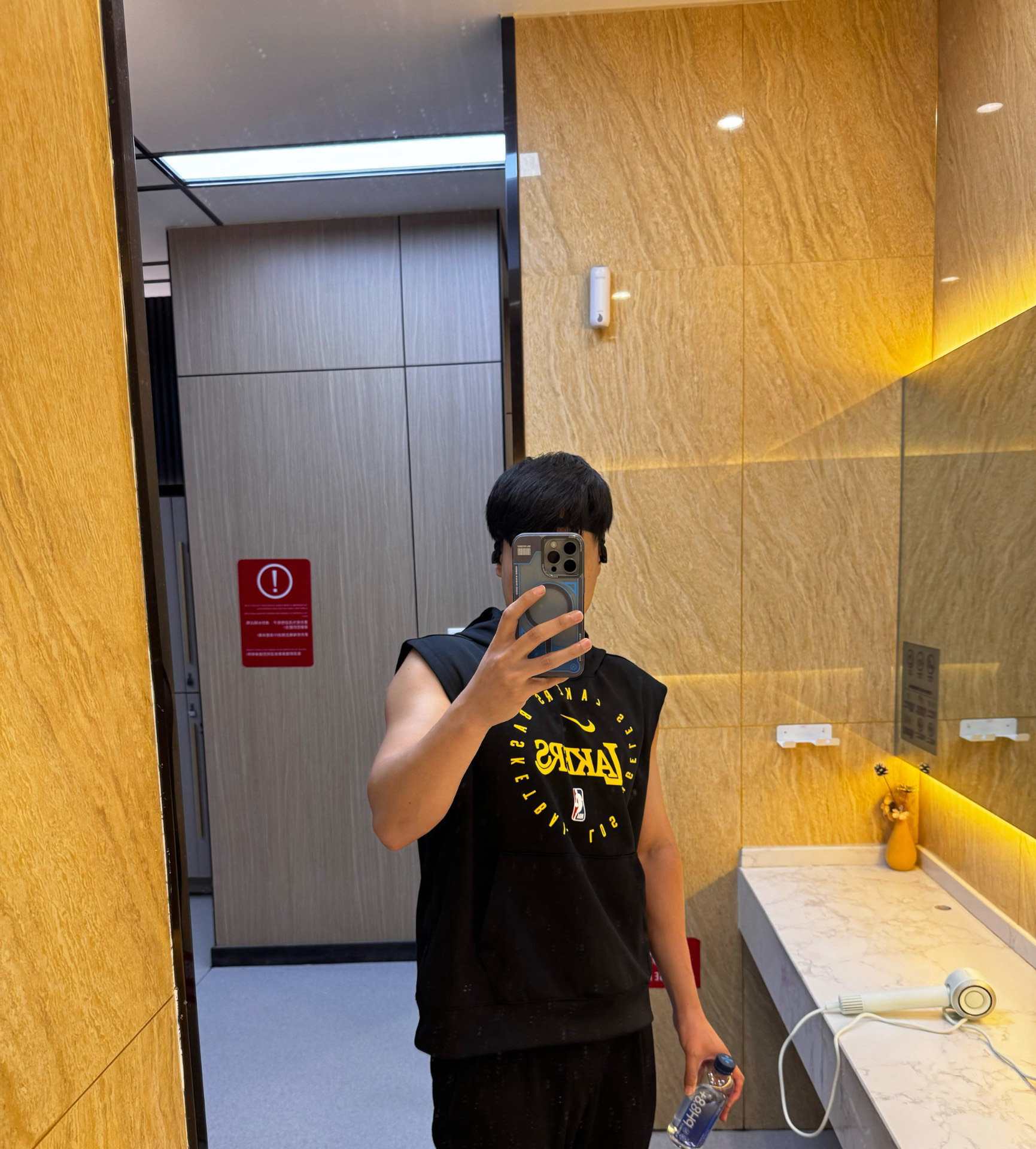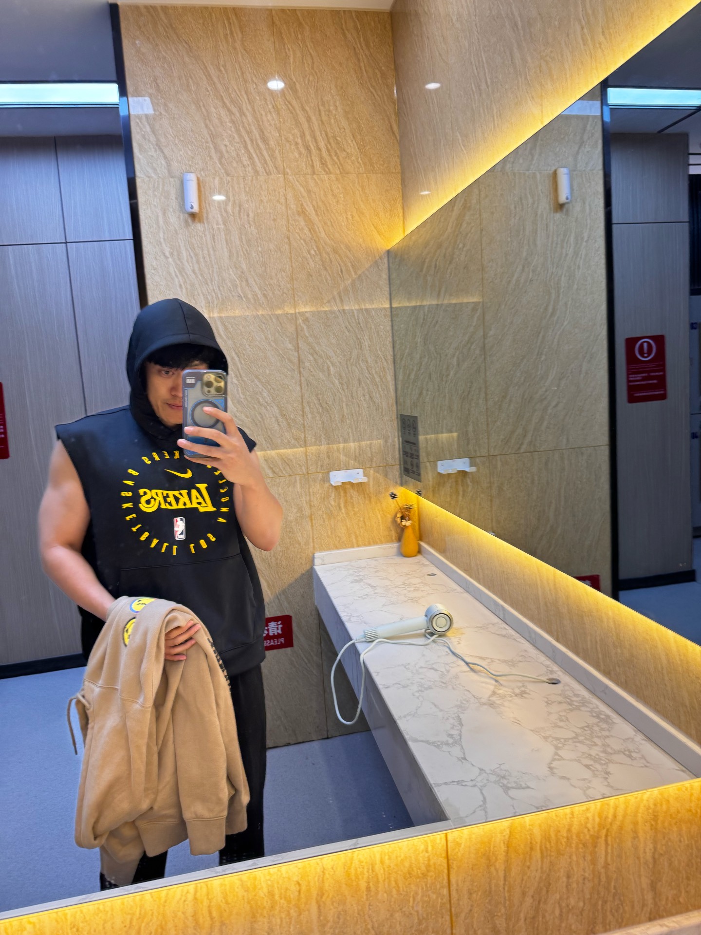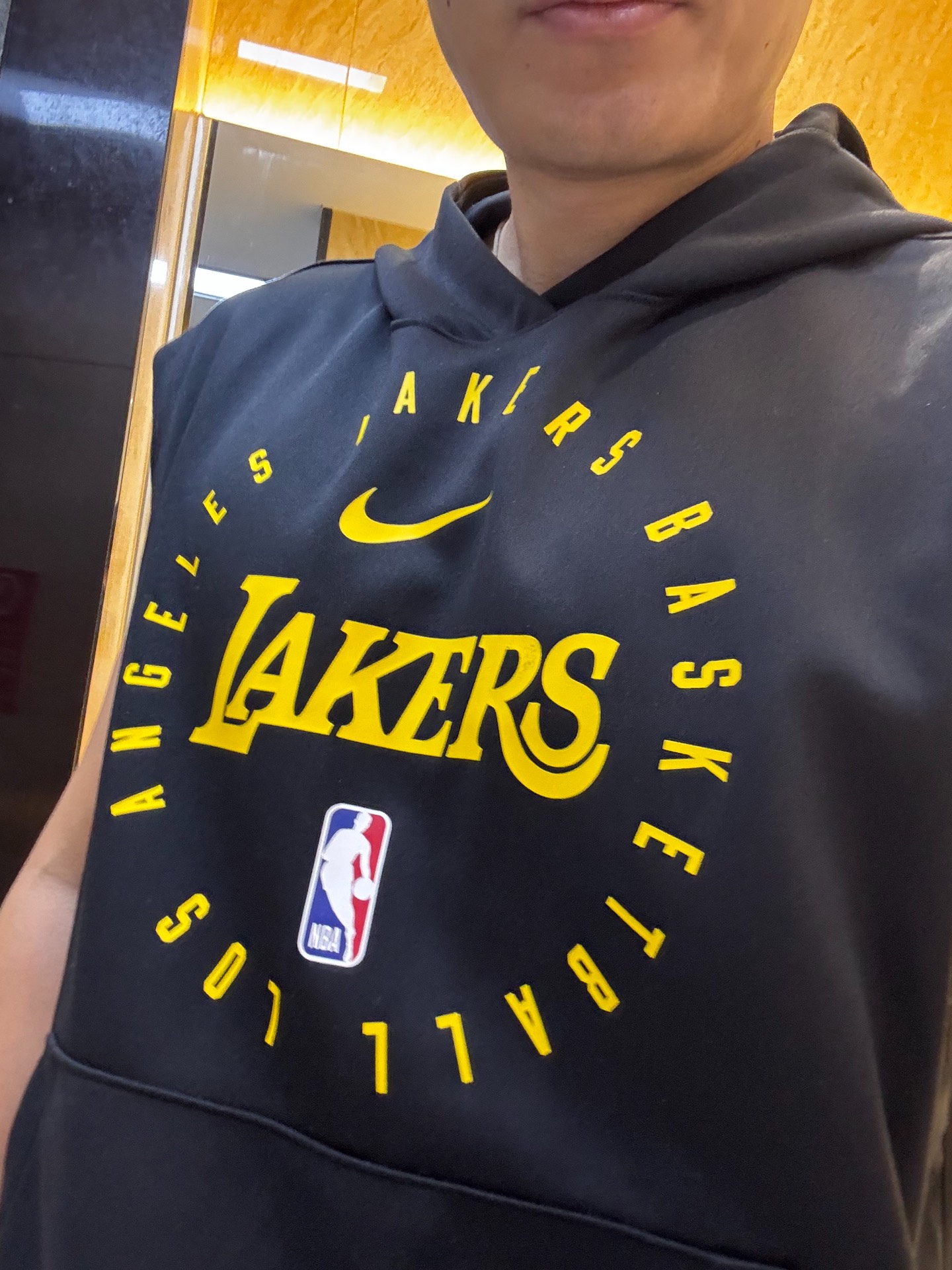 作为湖人球迷果断入这款背心~✅是正品没差,质感软乎乎还透气速干~连帽无袖设计超帅,健身时戴帽配头戴耳机直接装杯👑! 打球内搭长袖Pro、日常单穿都很可,湖人印花情怀拉满💛