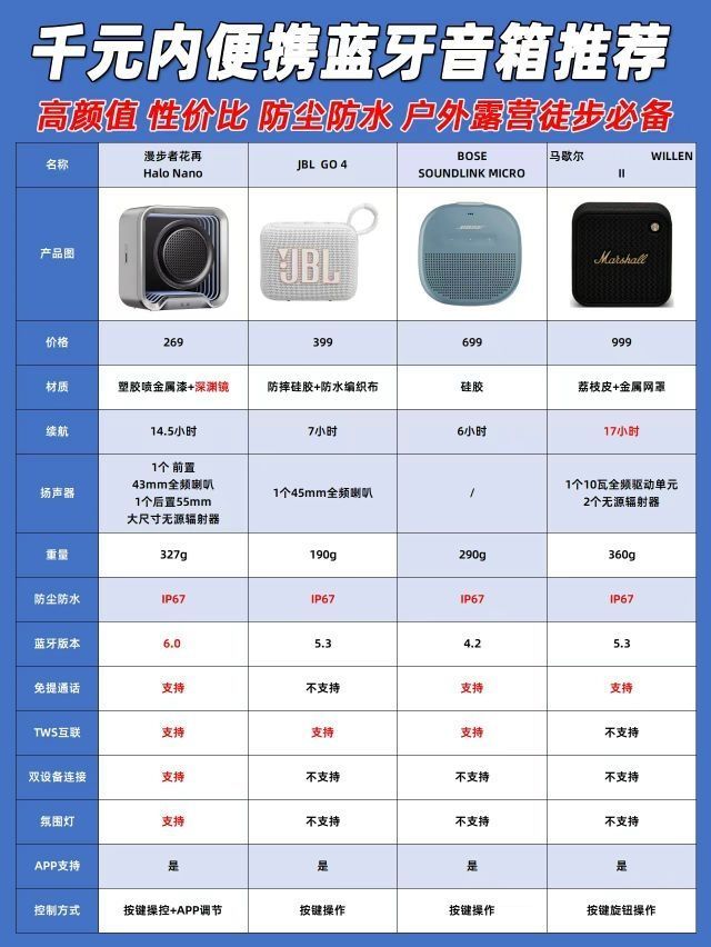 经常拿手机外放音乐的不伙伴一定知道,手机外放音量有限,而且音质也不够好,放久了手机耗电也快。所以想要在户外实现音乐外放,一起来看看这四款便携蓝牙音箱,续航久,音质好,从百元到千元都有,有喜欢的可以直接入手。 1.漫步者花再 Halo Nano 2.JBL GO 4 3.BOSE SOUNDLINK MICRO 4.马歇尔 WILLEN II 今天来跟大家分享一下,便携蓝牙音箱选购要关注的一些关...
