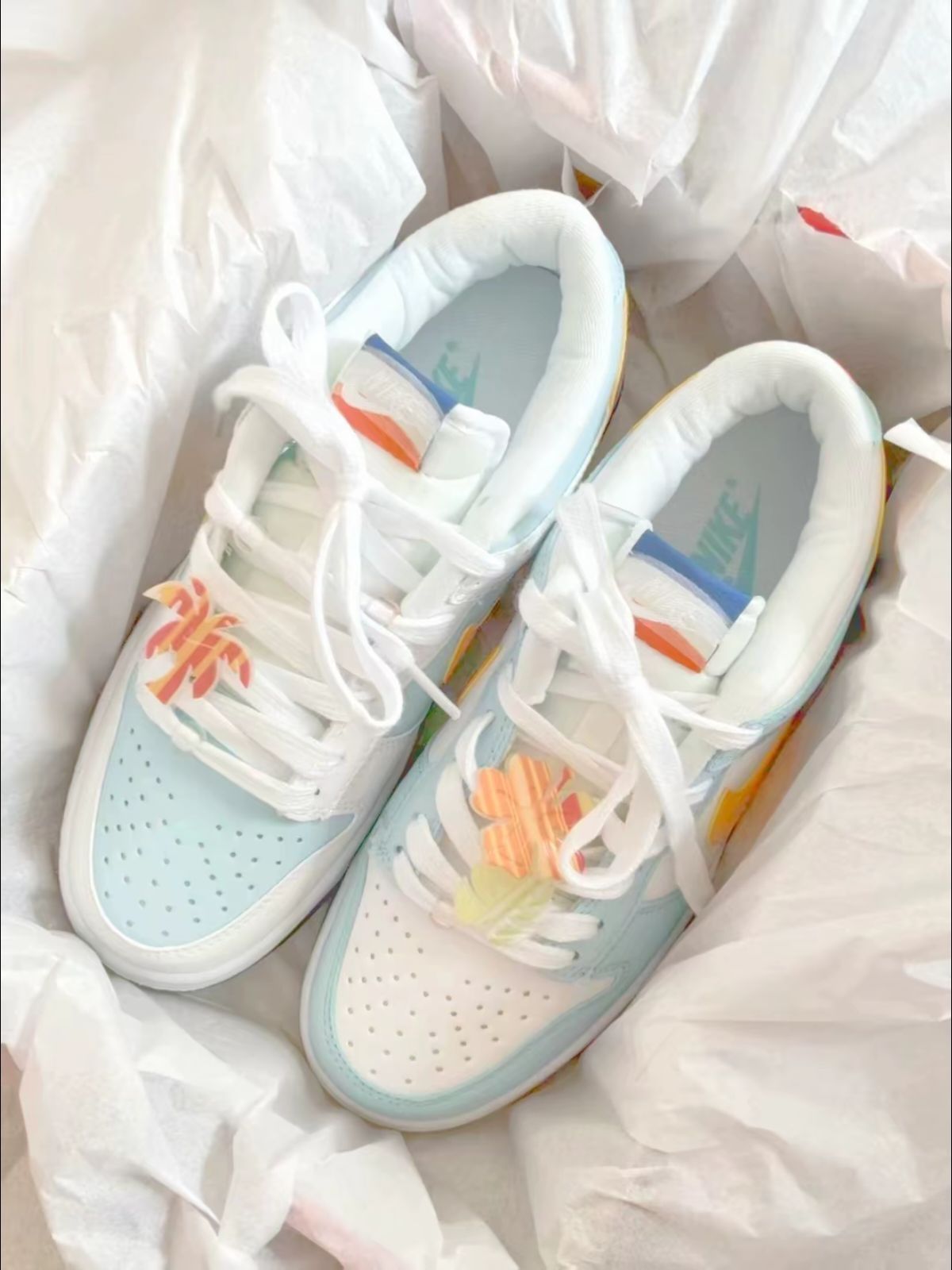 Nike的介双板鞋也泰适合夏天了吧 有种去夏威夷的即视感 蓝白色调搭配鸳鸯设计新颖又时尚 鞋面是皮革材质的 穿着也透气 日常出门或运动穿都合适