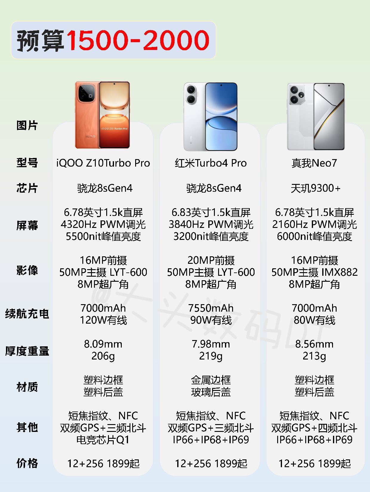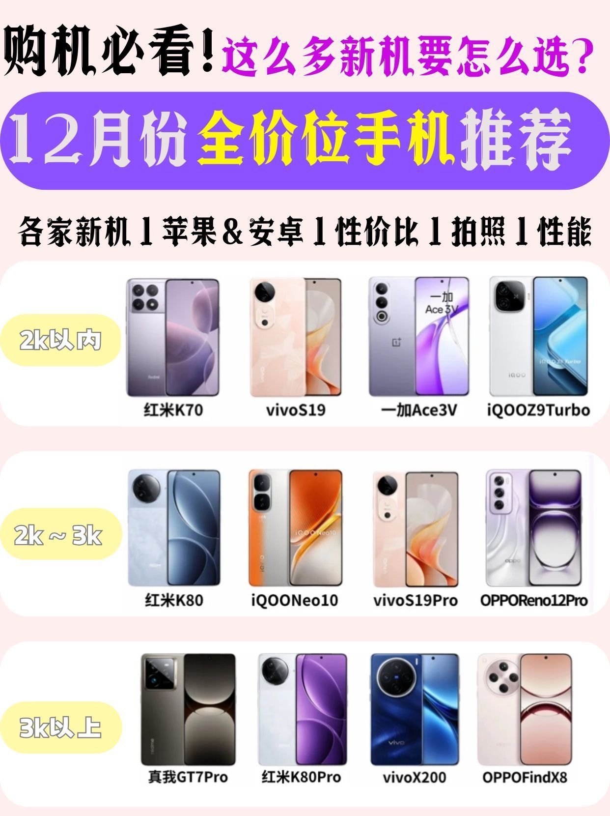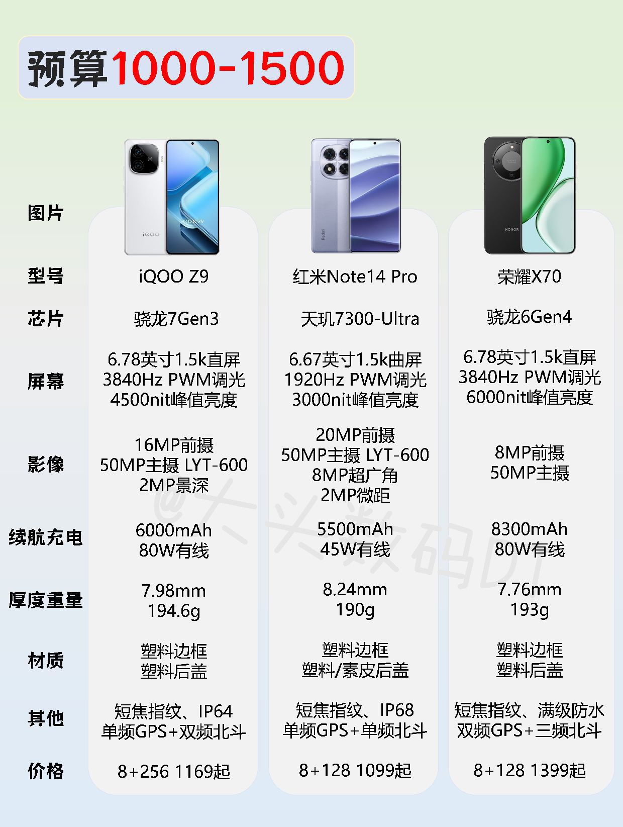 新的一期手机推荐来了,全价位❗ 按你的预算和需求选择 【预算1000-1500】 iQOO Z9:1169起 红米Note14 Pro:1099起 荣耀X70:1399起 【预算1500-2000】 iQOO Z10Turbo Pro:1899起 红米Turbo4 Pro:1899起 真我Neo71899起 【预算2000-3000】 iQOO Neo10Pro+:2799起 红米K80至尊版...