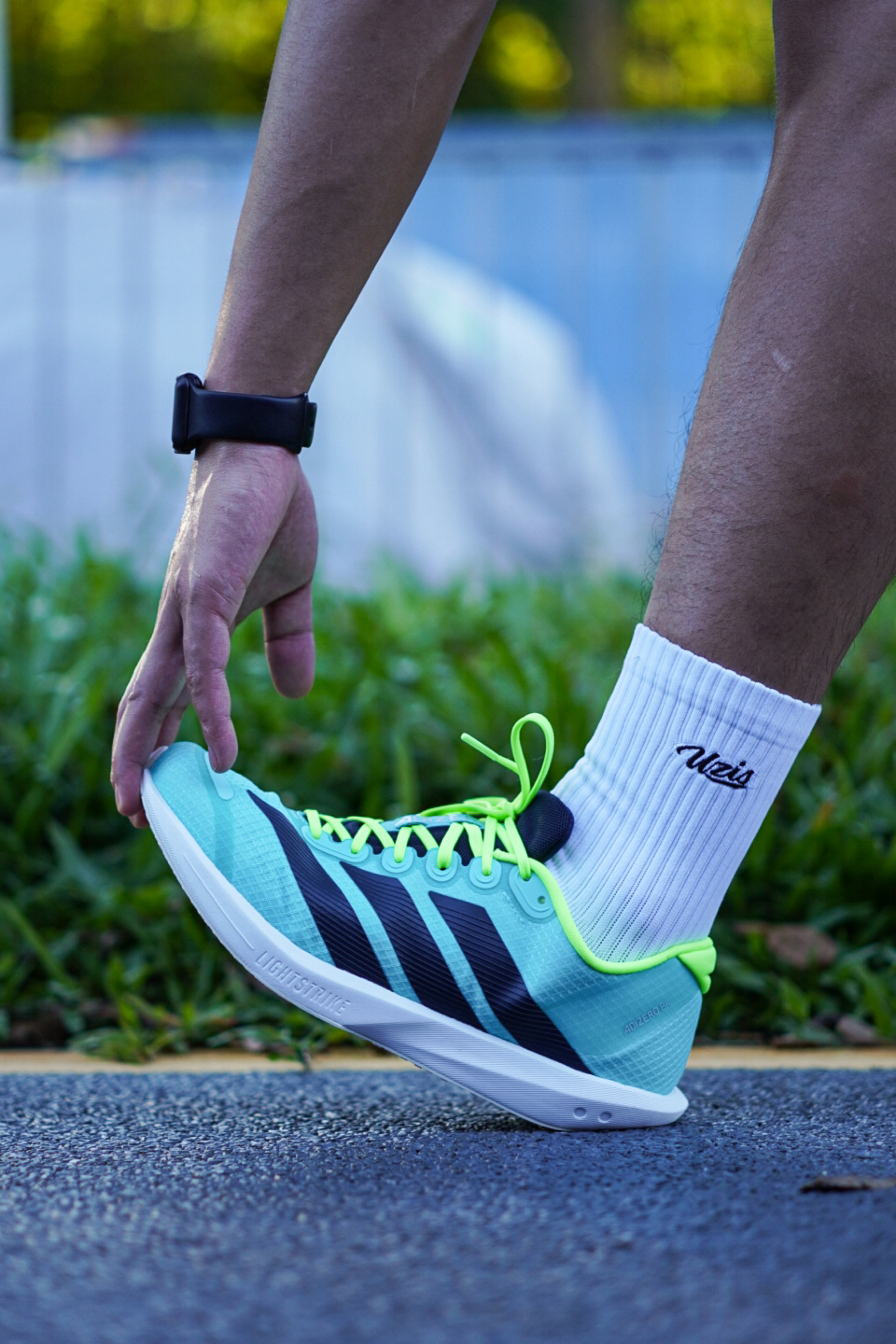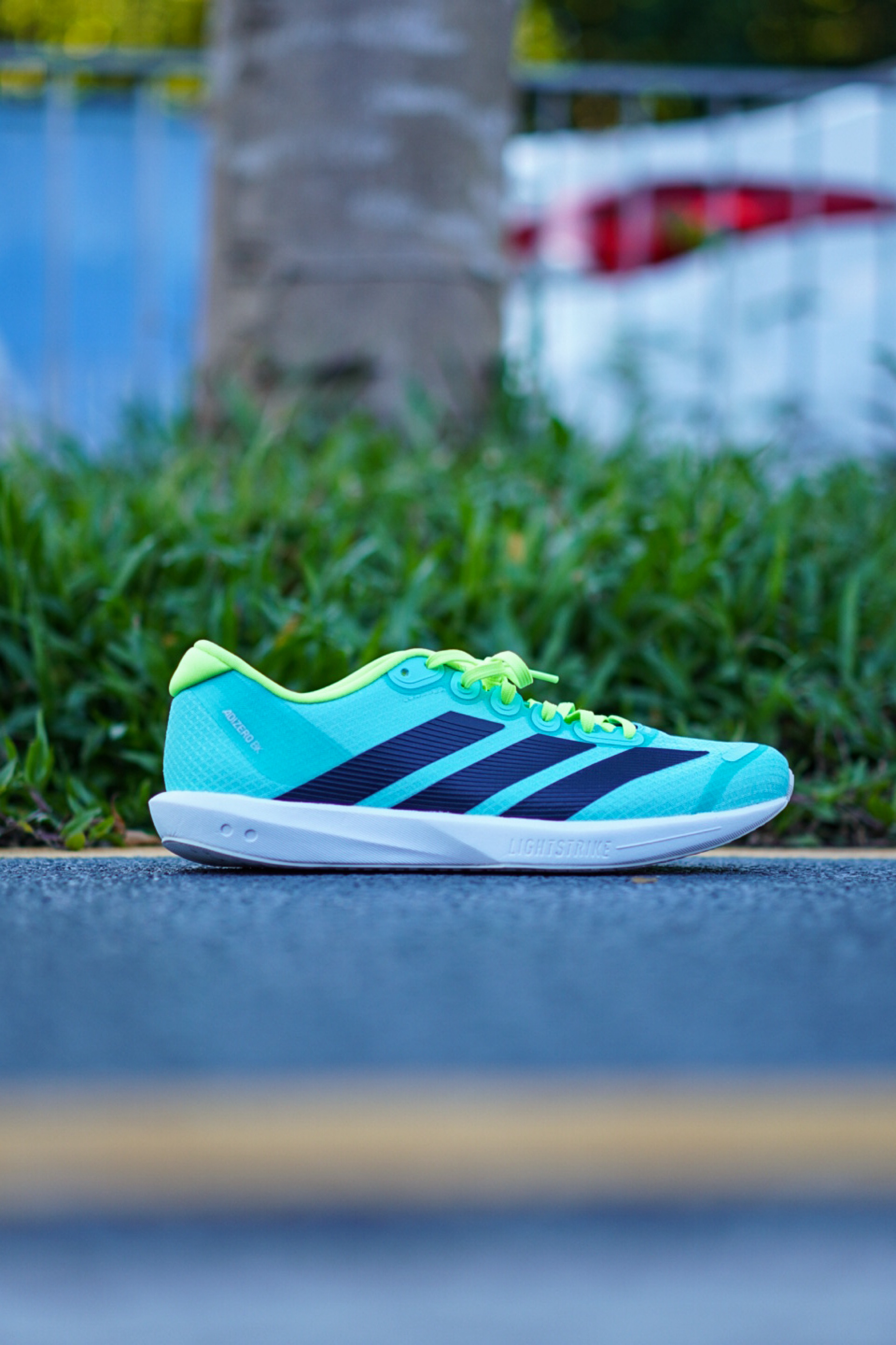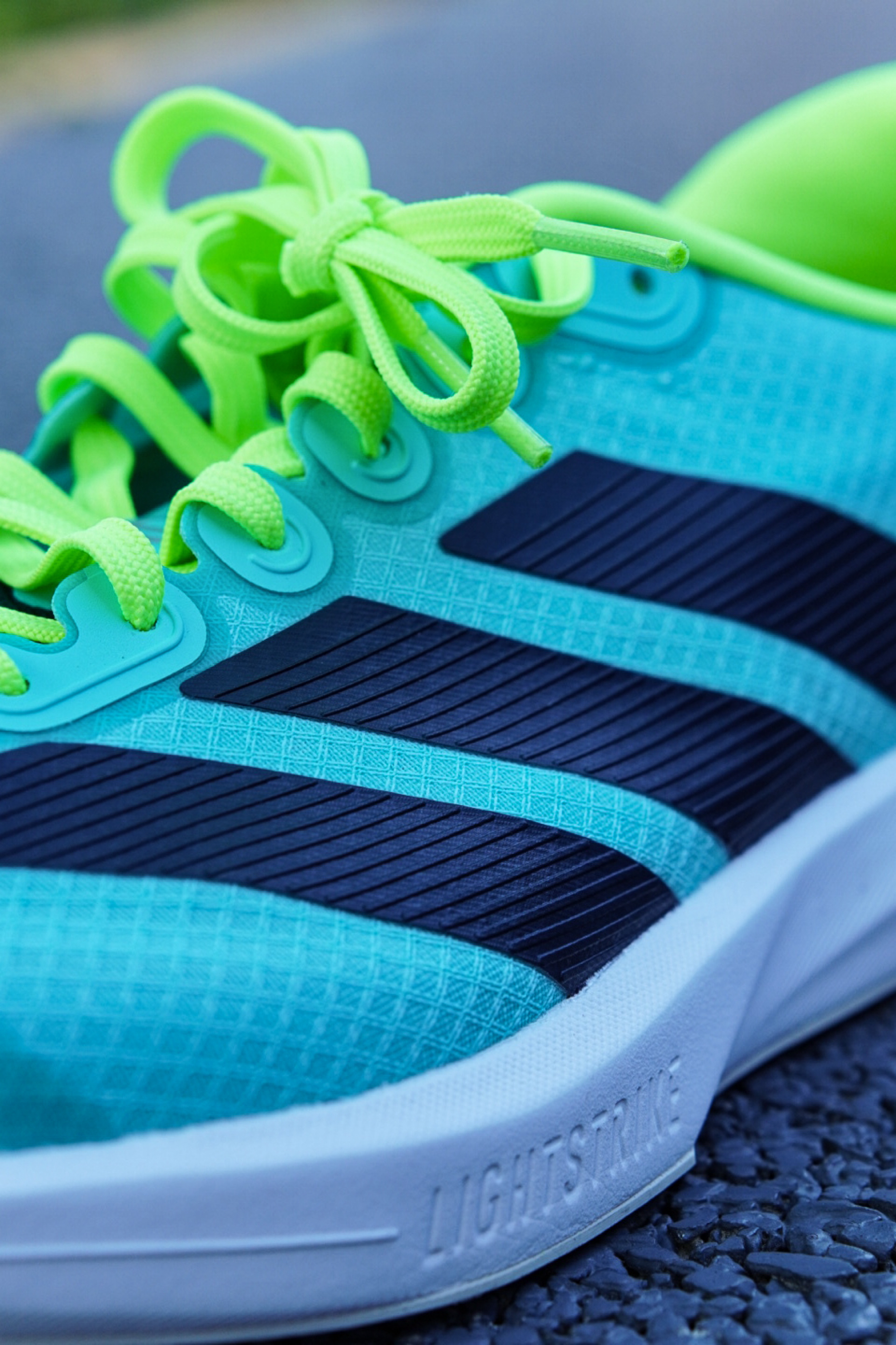 不得不说上脚第一感觉真的就很有场地感,配色也是很适合现在这个季节,清爽亮眼。 整个鞋身以薄荷绿为主色调,黑色的三条斜杠LOGO点缀层次感,而且整双鞋拿在手上感觉是真的很轻,单只42.5码在200g左右,鞋面的透气性虽然一般,但是支撑性还是很在线。 全掌LIGHTSTRIKE泡棉中底能够满足日常的短距离训练需求,整体上脚的脚感反馈是比较偏韧弹,薄底的设计很适合体考体测。