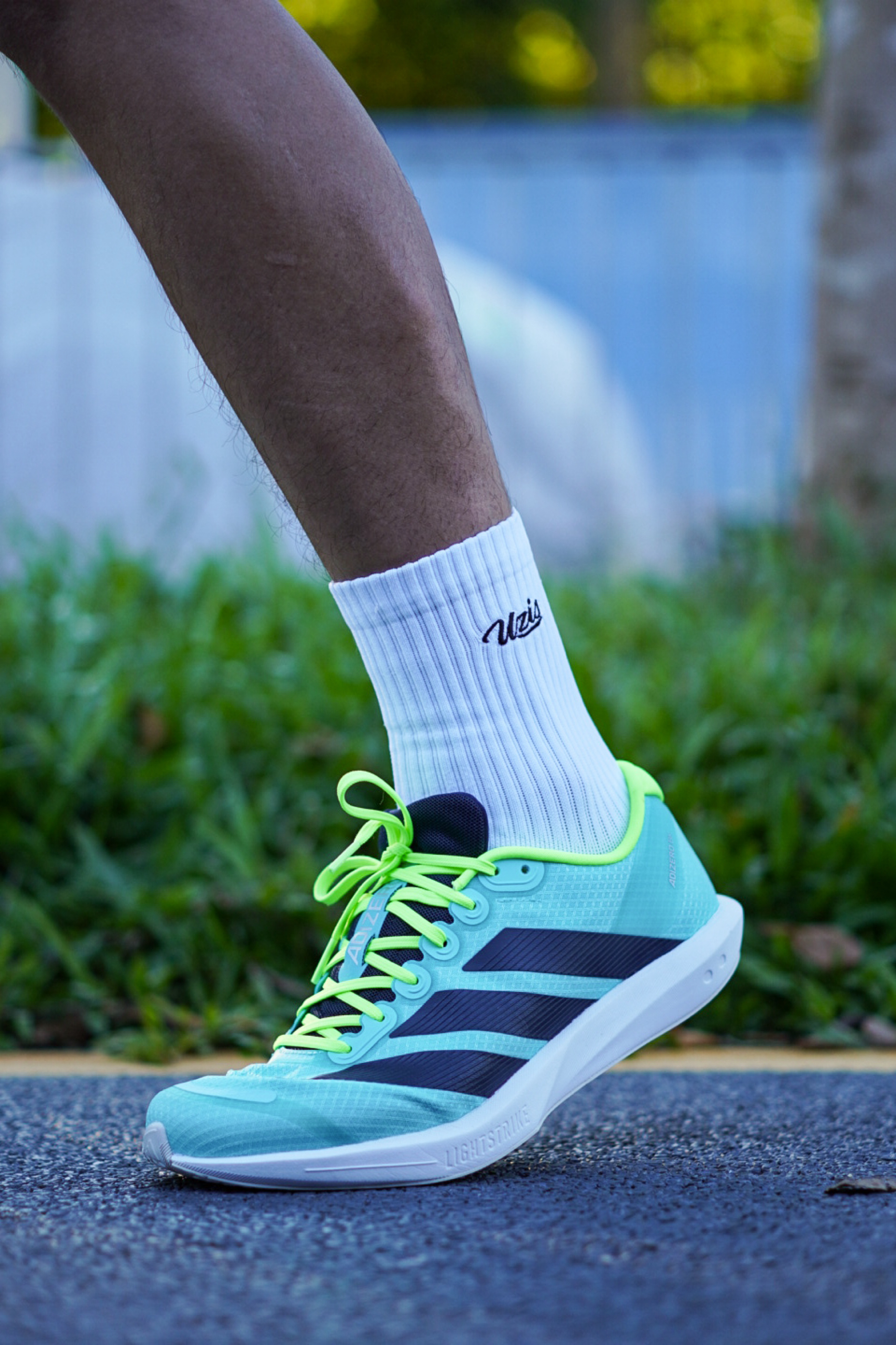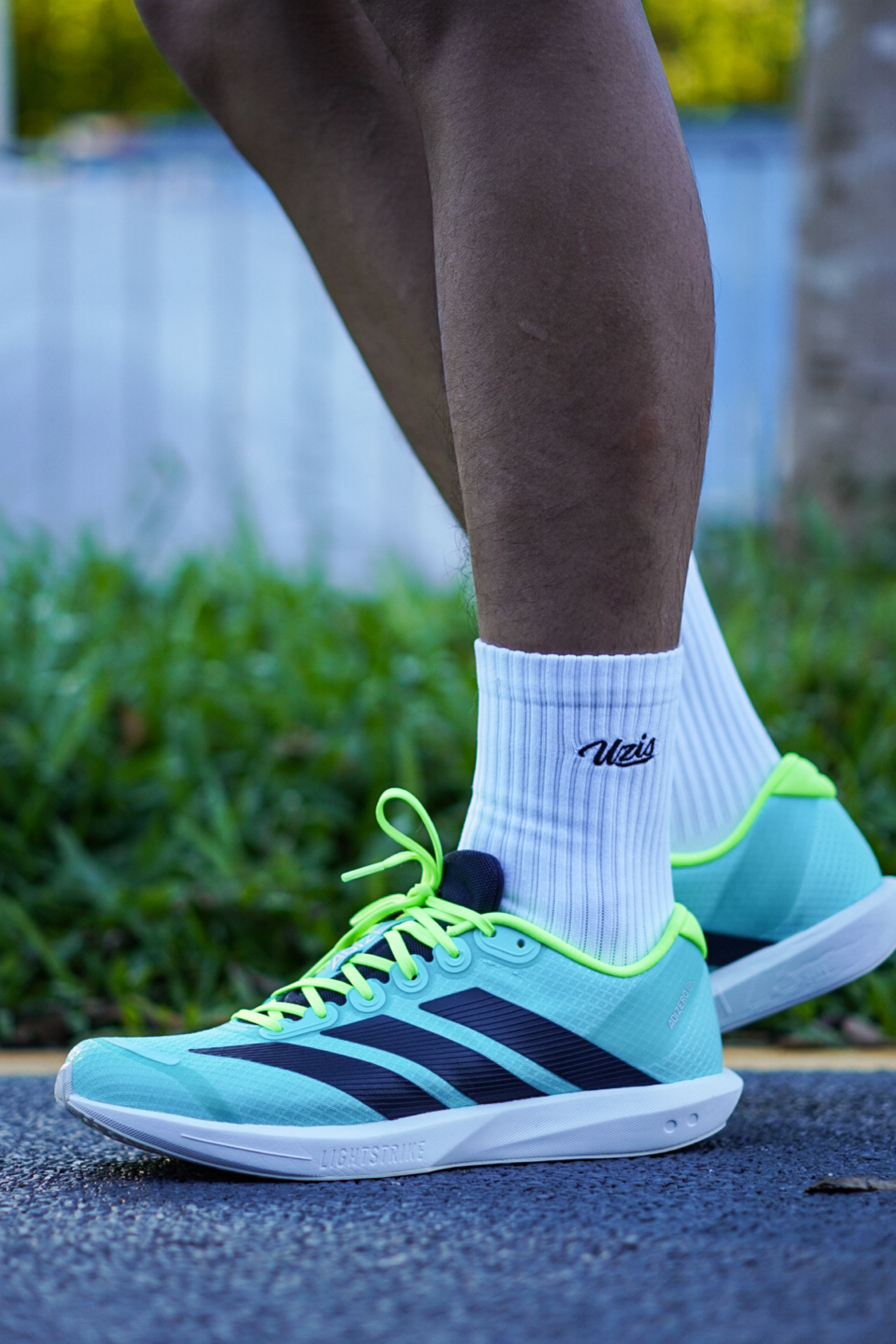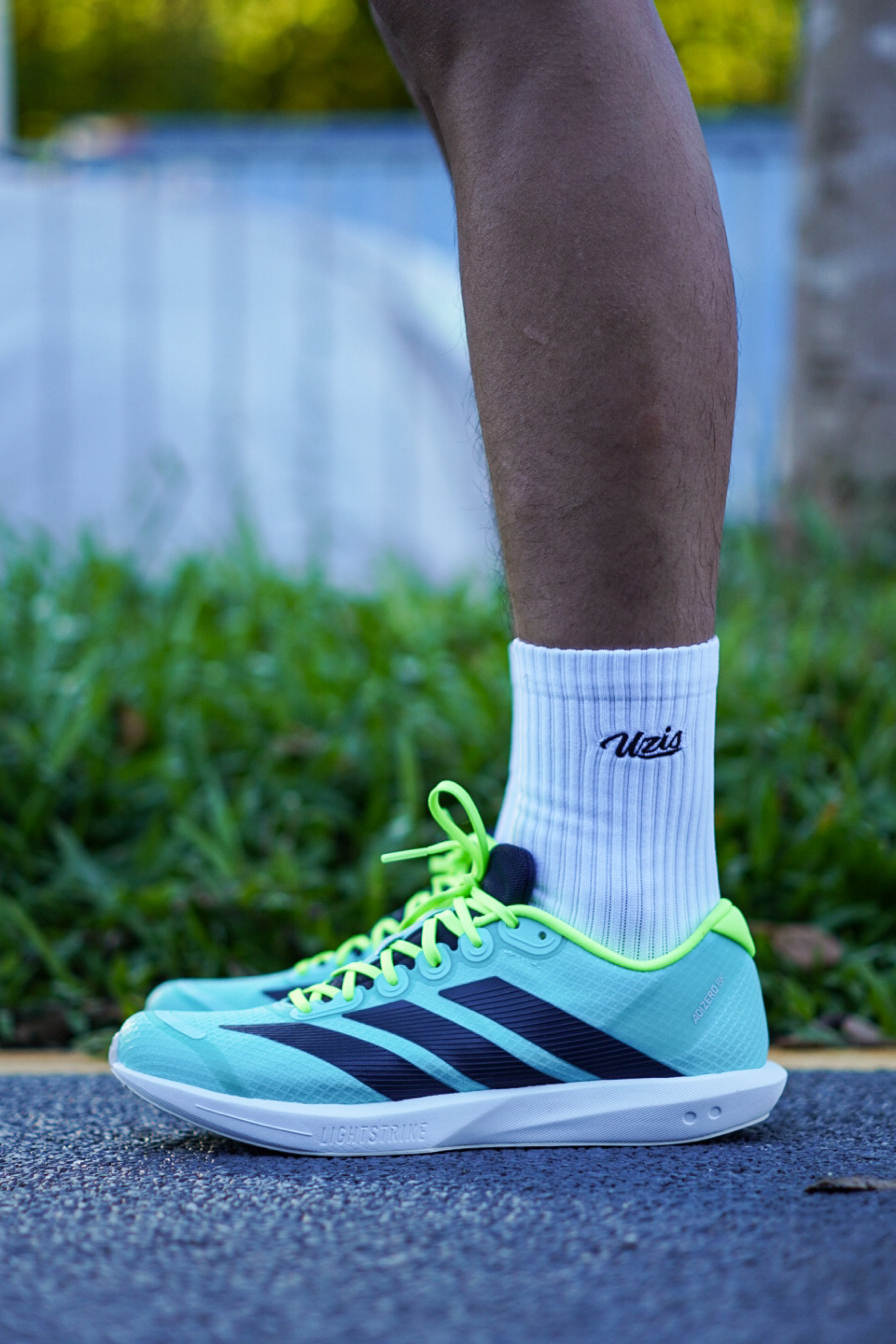 不得不说上脚第一感觉真的就很有场地感,配色也是很适合现在这个季节,清爽亮眼。 整个鞋身以薄荷绿为主色调,黑色的三条斜杠LOGO点缀层次感,而且整双鞋拿在手上感觉是真的很轻,单只42.5码在200g左右,鞋面的透气性虽然一般,但是支撑性还是很在线。 全掌LIGHTSTRIKE泡棉中底能够满足日常的短距离训练需求,整体上脚的脚感反馈是比较偏韧弹,薄底的设计很适合体考体测。