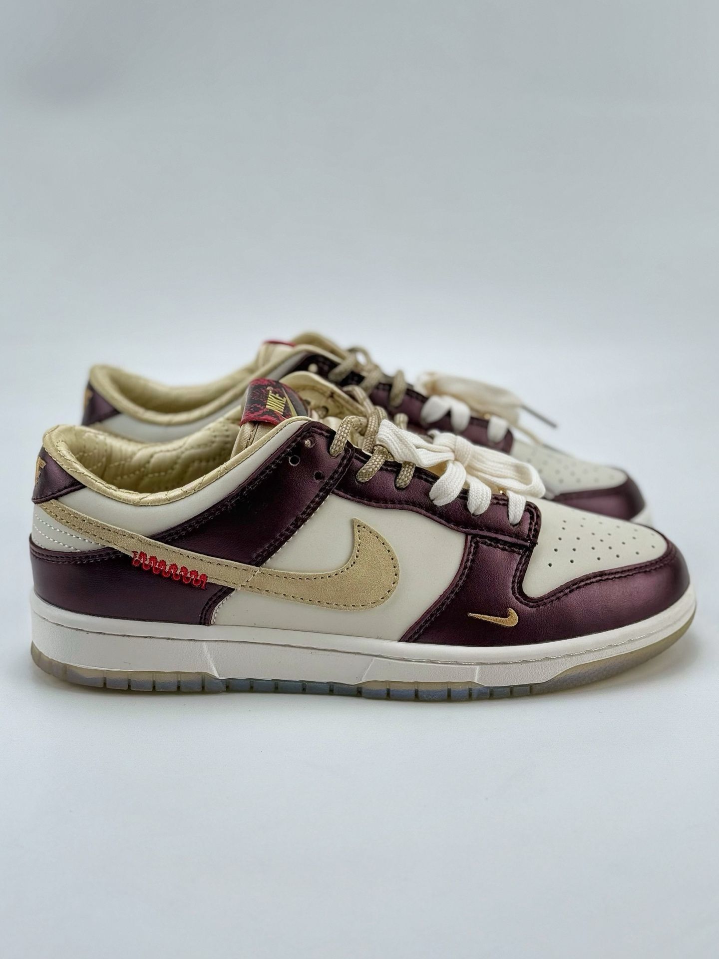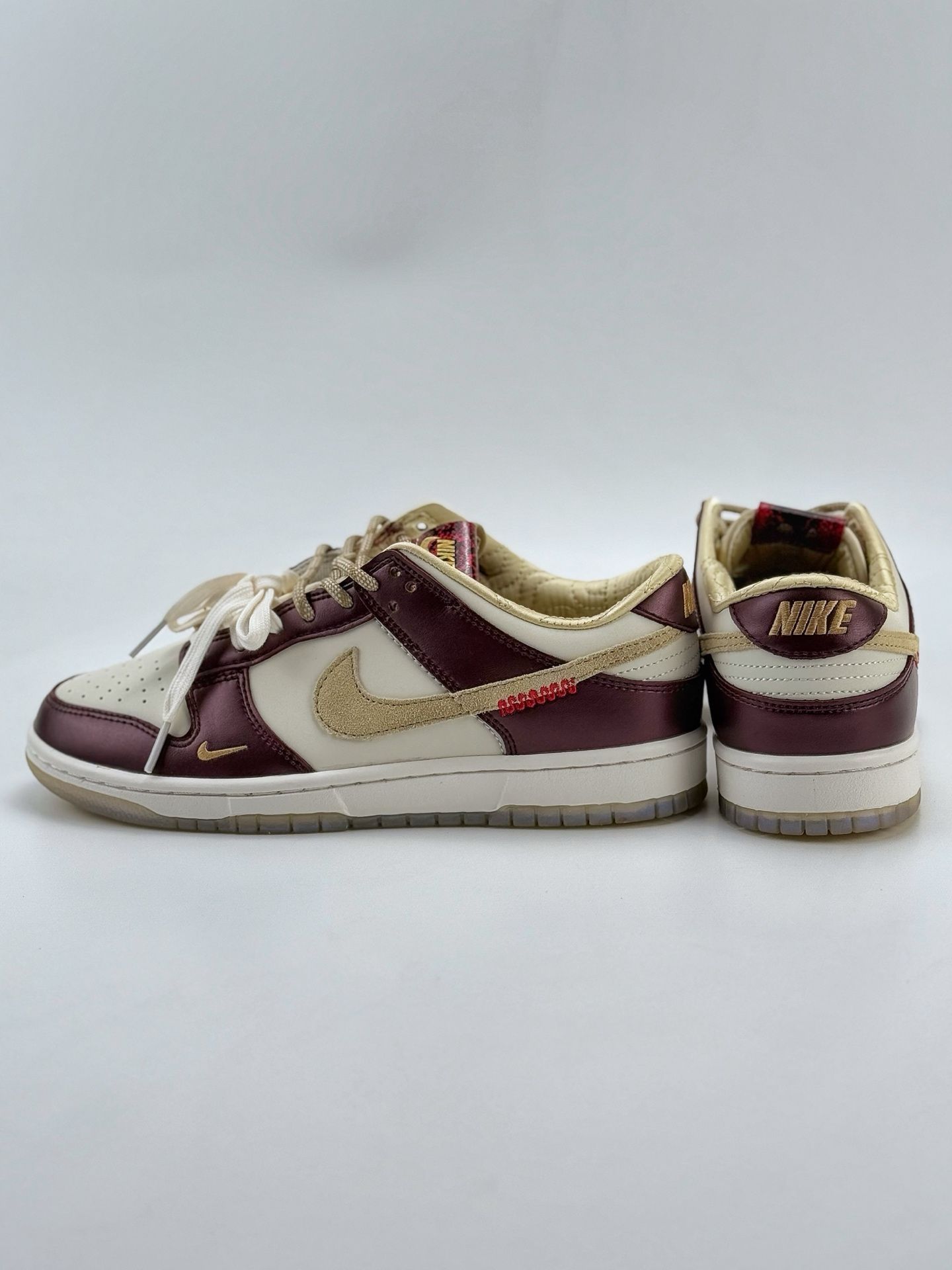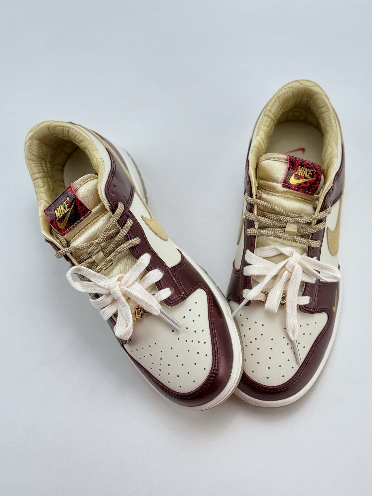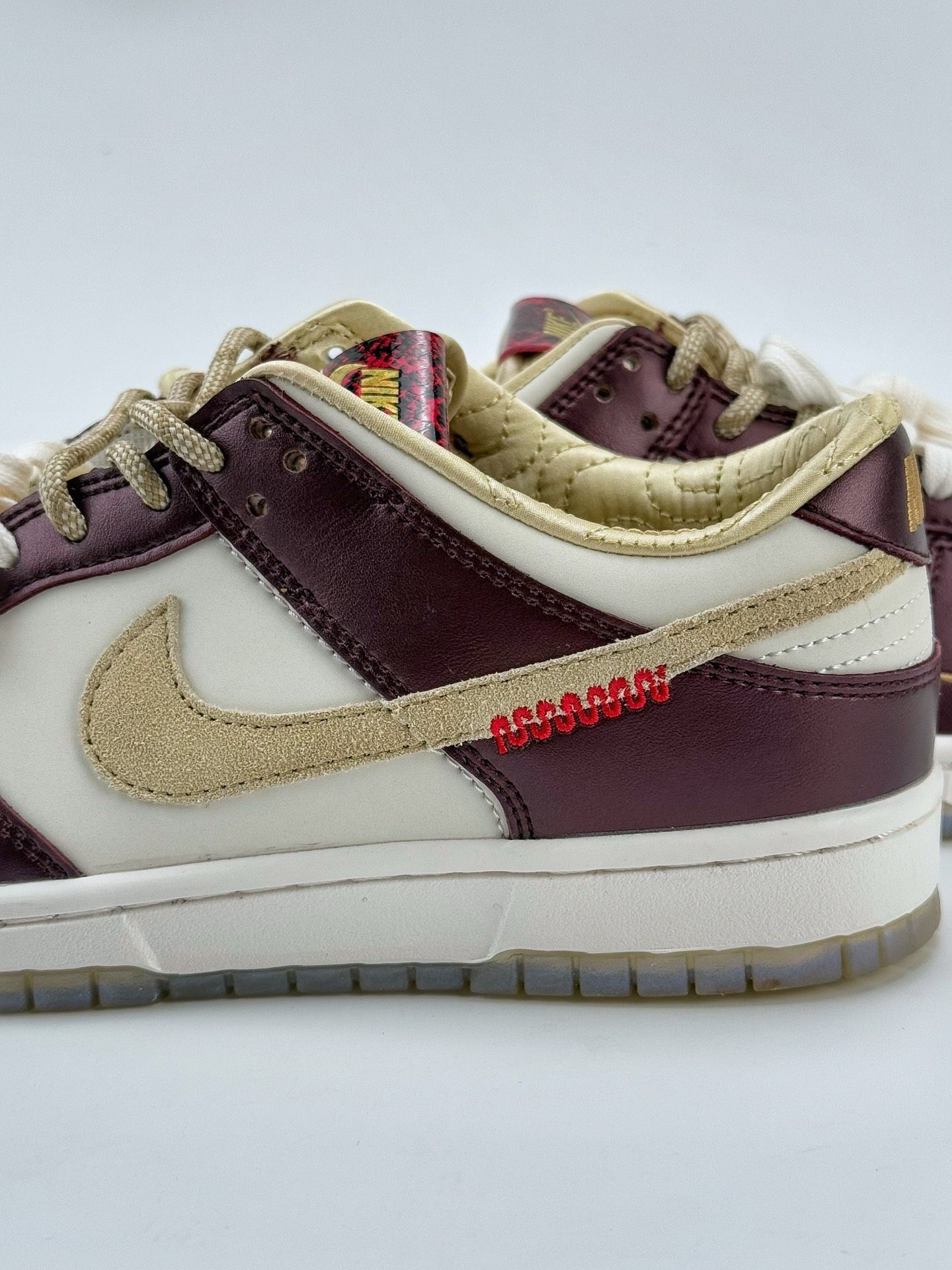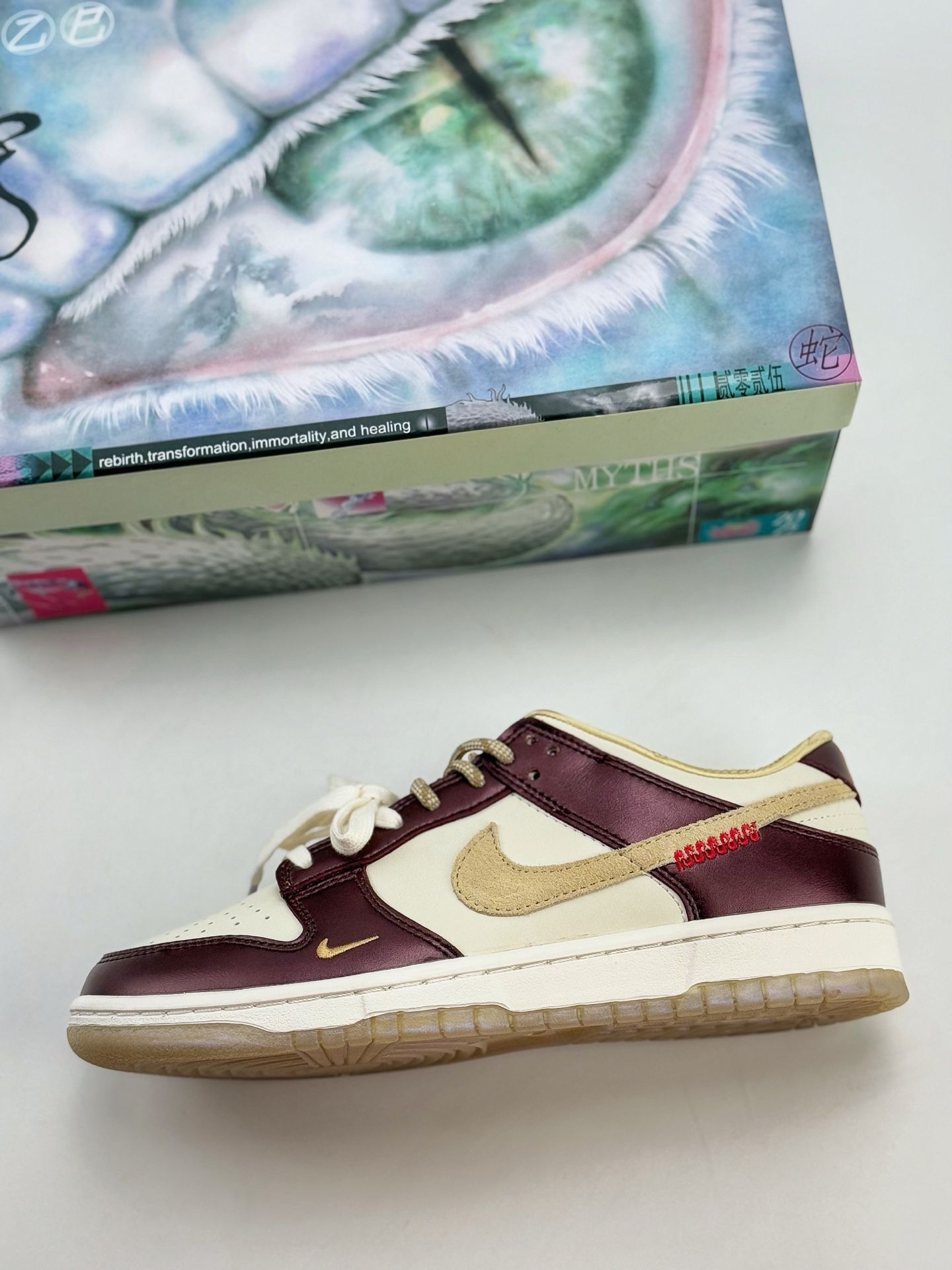 当 Nike Dunk 遇上东方生肖蛇的神秘美学,这双鞋就成了潮流与文化的双向奔赴! 酒红与米金的复古撞色,像极了老上海的高级洋装,金属光泽皮革自带「贵气滤镜」;鞋舌蛇纹标、金色迷你 Swoosh 暗藏细节巧思,就连鞋带扣都是精致金属质感,每一处都在宣告你的潮流品味不一般~ 鞋盒的蛇眼艺术设计更是绝绝子,收藏感直接拉满!不管是搭配工装裤走街头潮酷风,还是配长裙玩甜酷混搭,它都能让你在人群中...
