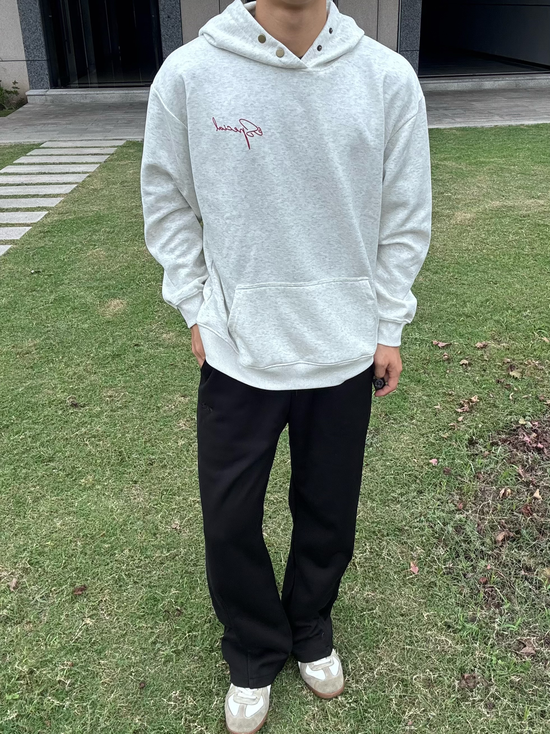 那必然得是卫衣+卫裤了 👕是 és 家的设计感满满的卫衣 浅灰色,色调柔和又高级,不是那种单调乏味的灰 胸前精致的红色刺绣字母,非常灵动与时尚 👖是 维动 VEIDOORN 家的新款运动裤 宽松的版型,垂感十足 不管是肉肉腿还是不直的腿型,都能轻松修饰 📏尺码参考:183cm 75kg 卫衣:XL码 刚好合身 裤子:XL码 刚好合身