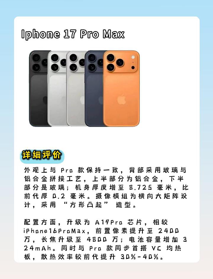 近一个月陆续曝光iPhone17系列信息后,今天重点聊聊17Pro相比16Pro的关键变化,核心亮点整理如下: 1. 外观设计革新 最直观的是背部摄像模组尺寸明显增大,风格变化较大,可能需要用户适应。 2. 防反射屏幕升级 强光或室外环境下显示效果显著提升,但如果能加入更高阶的护眼调光功能,体验会更完美。 3. 拍摄能力飞跃 摄像模组变大的核心...