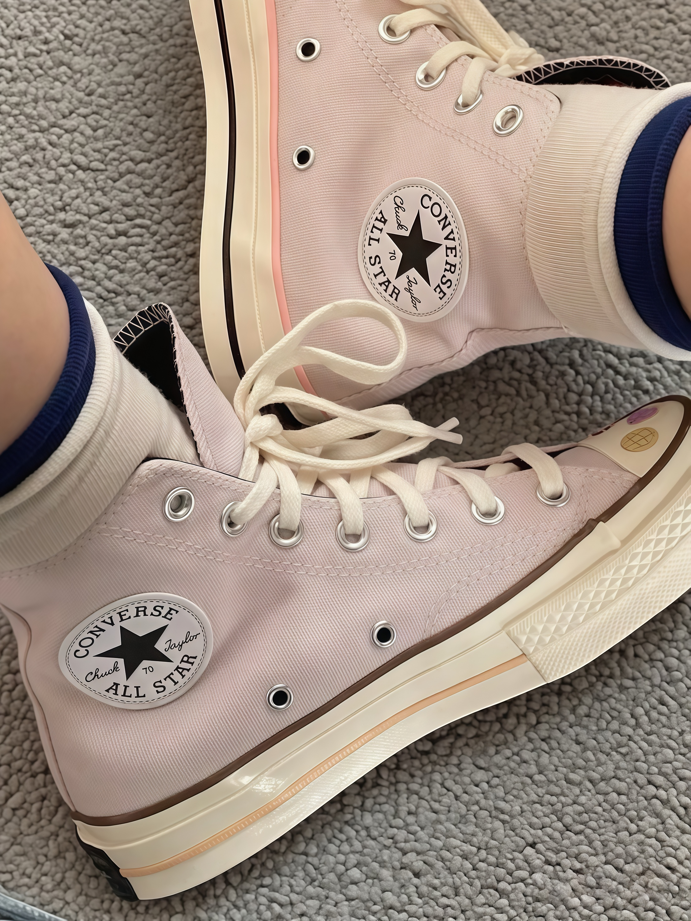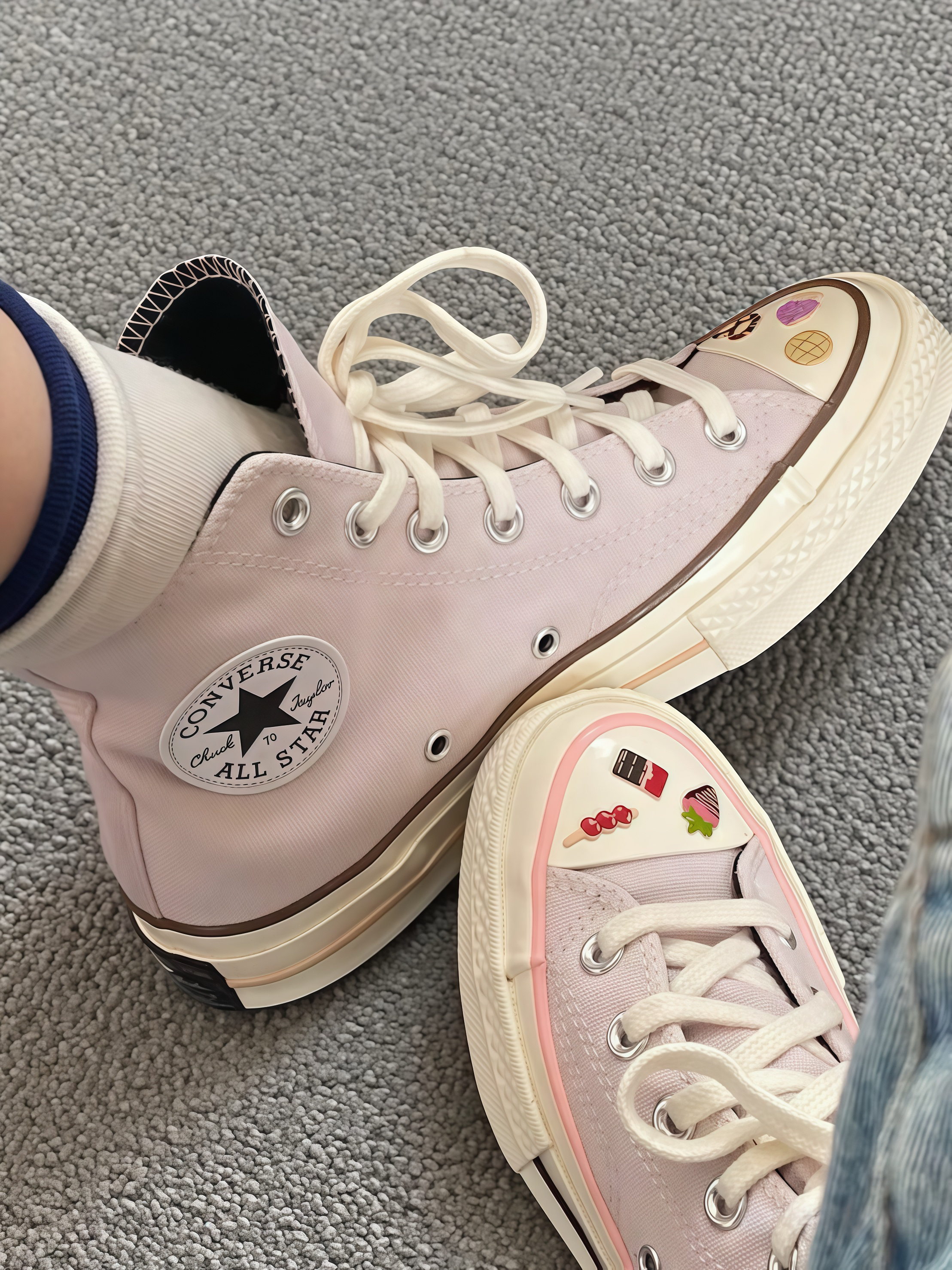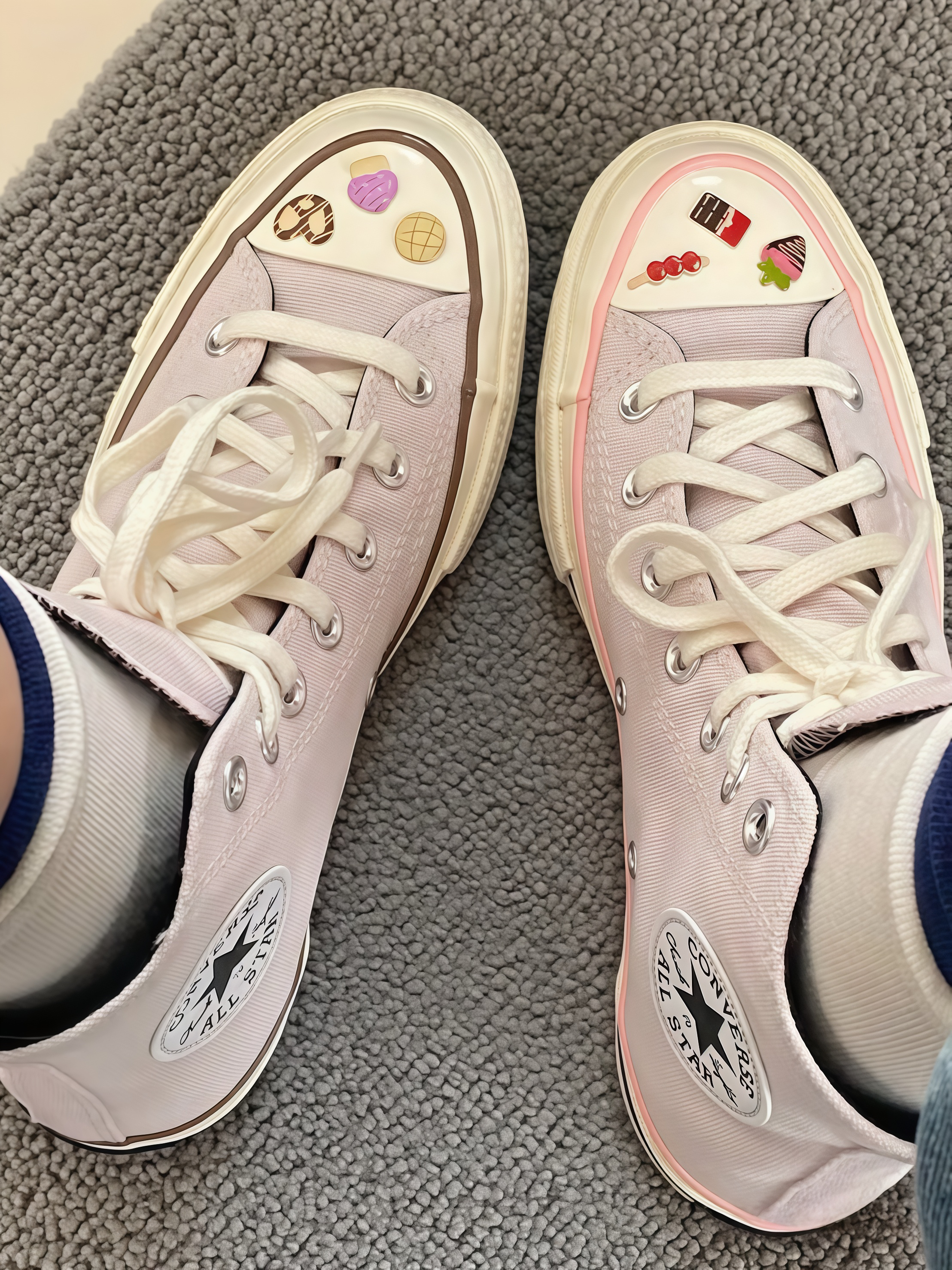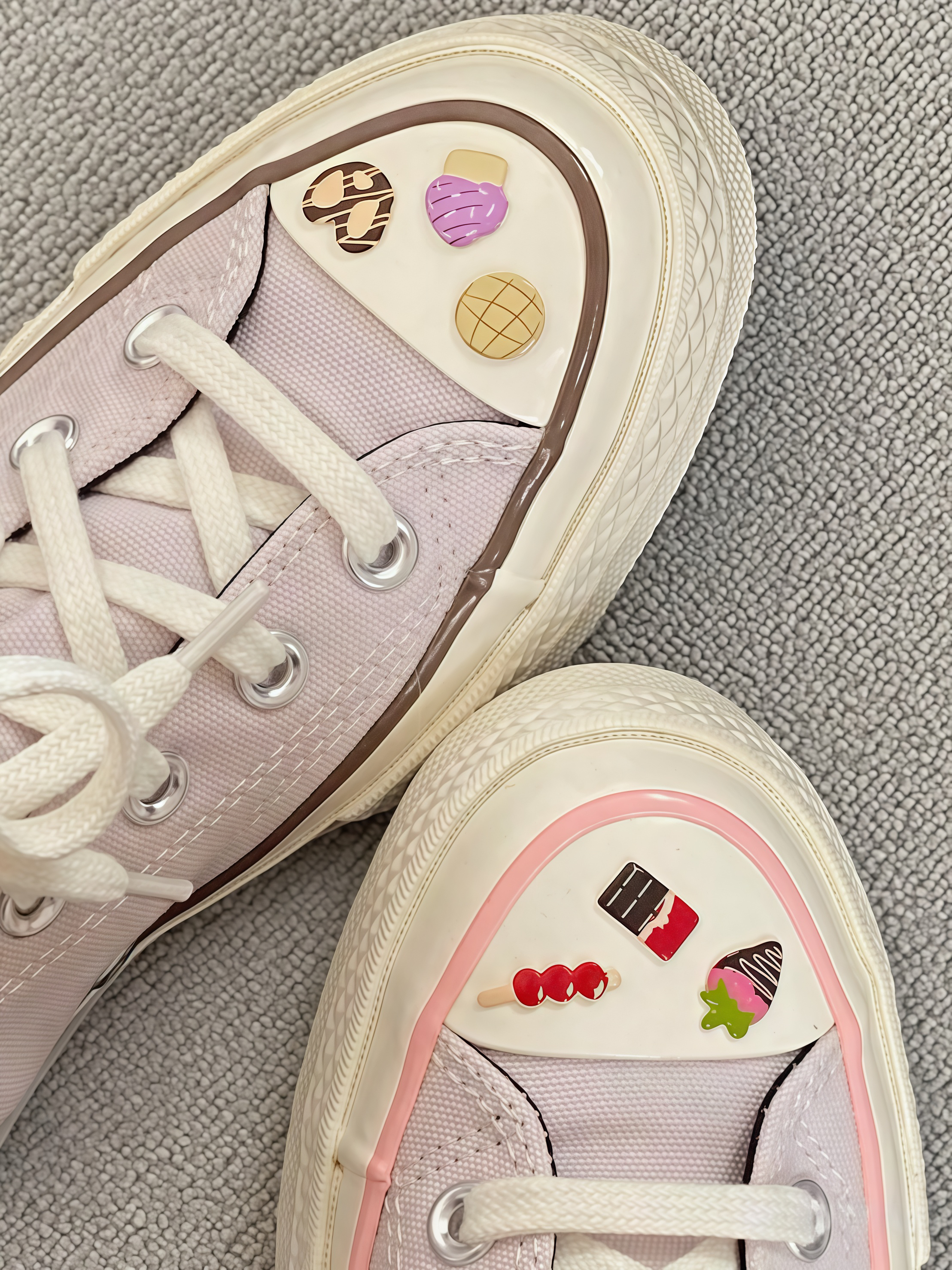 救命!这双匡威也太戳我了!粉粉的色调很少女,鞋头还有可爱的小装饰,一边是甜点,一边是小零食,像把美食都穿脚上啦。 穿上脚很轻便,走路也舒服。搭配裙子或者牛仔裤都很合适,瞬间让穿搭变得活泼又有个性。每次穿这双鞋出门,心情都超好,感觉自己是个元气满满的小吃货,真的越看越喜欢,忍不住想和大家分享~