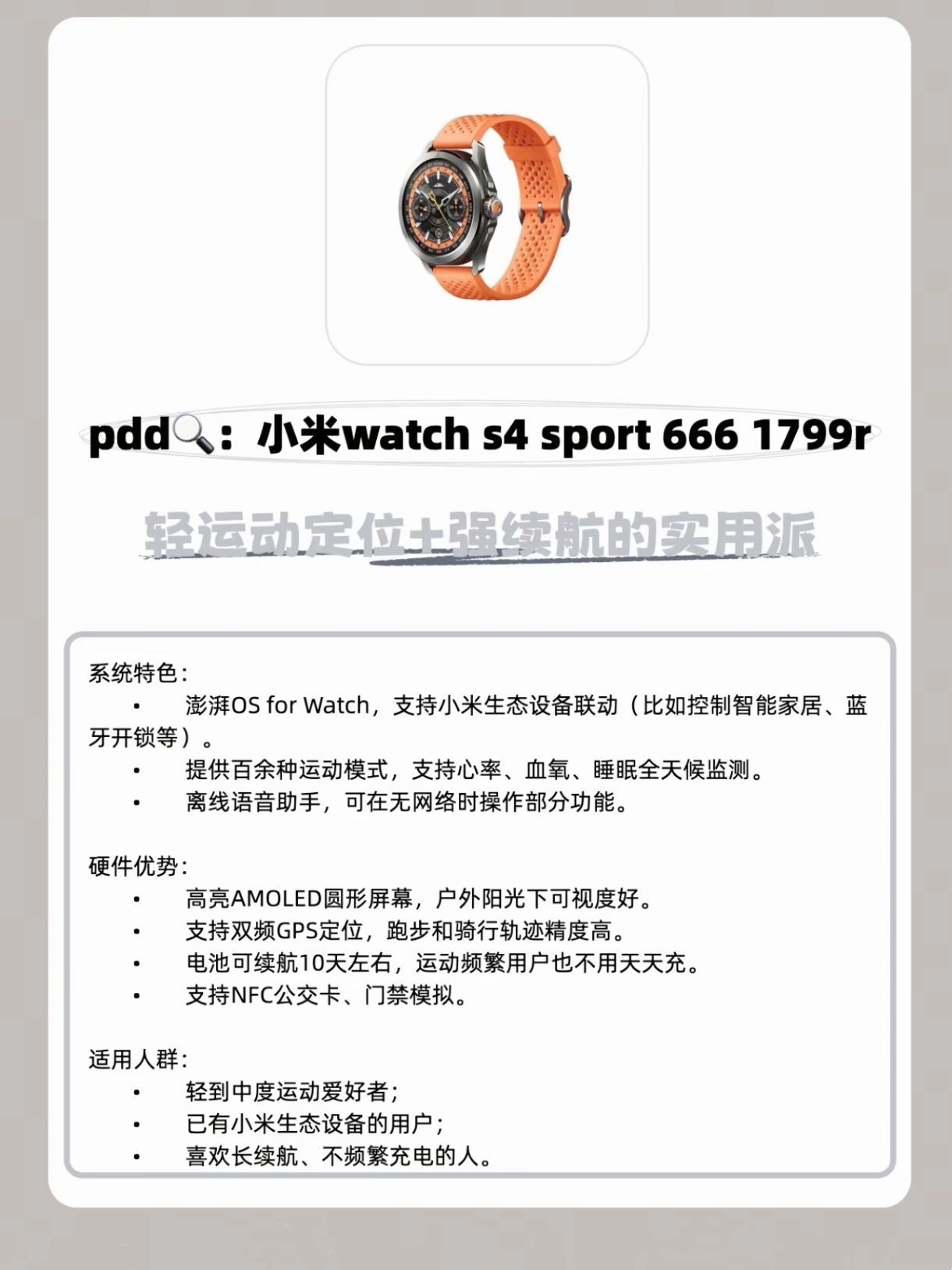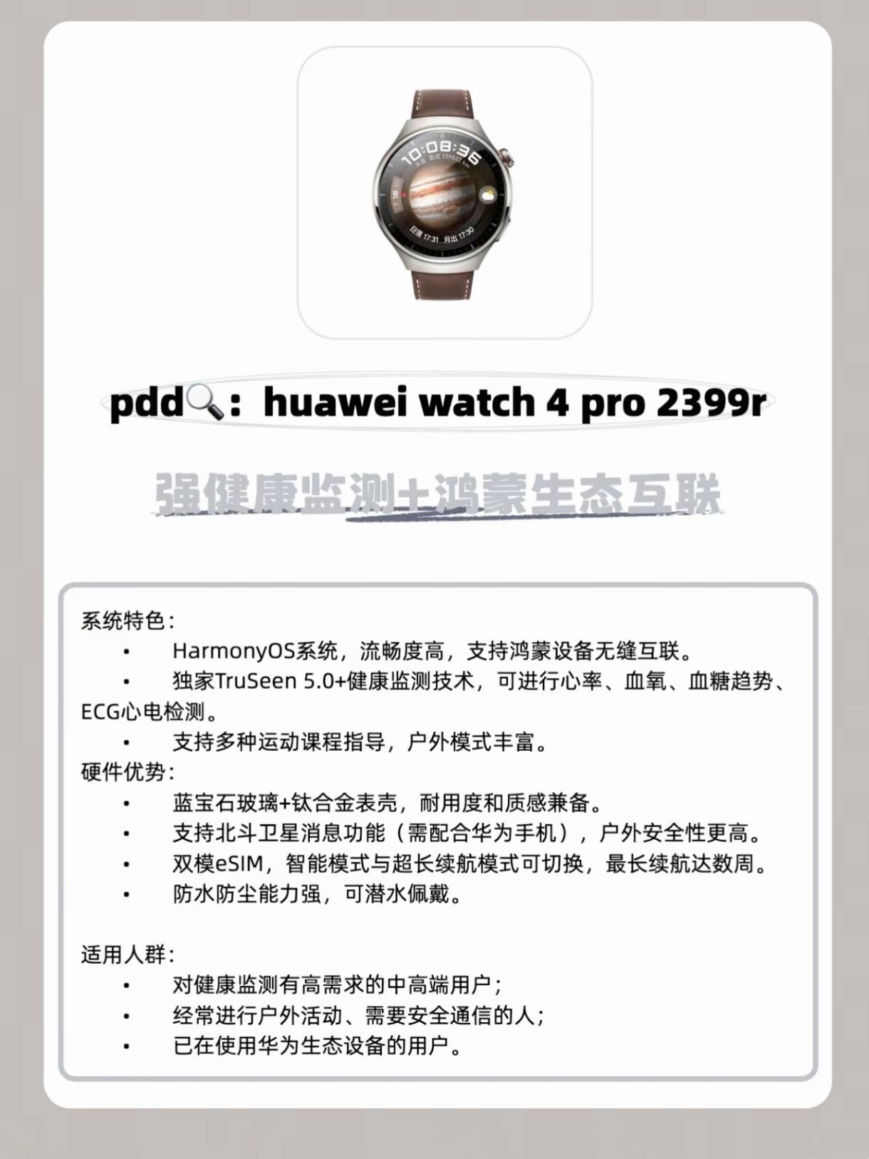本篇笔记关联了HUAWEI/华为 WATCH 4 Pro 智能手表 一键微体检 心电分析 呼吸健康研究 长续航 独立通话 高血糖风险评估 心率 防水 火星钛 钛金属表带、HUAWEI/华为 WATCH 4 Pro 智能手表 一键微体检 心电分析 呼吸健康研究 长续航 独立通话 高血糖风险评估 心率 防水 木星棕 真皮表带 、MI/小米 Watch S4 Sport 智能手表 心率血氧监测 氟橡胶 独立通信 长续航 表带款 液态硅胶表带等商品,为用户提供真实的使用体验和购买参考。