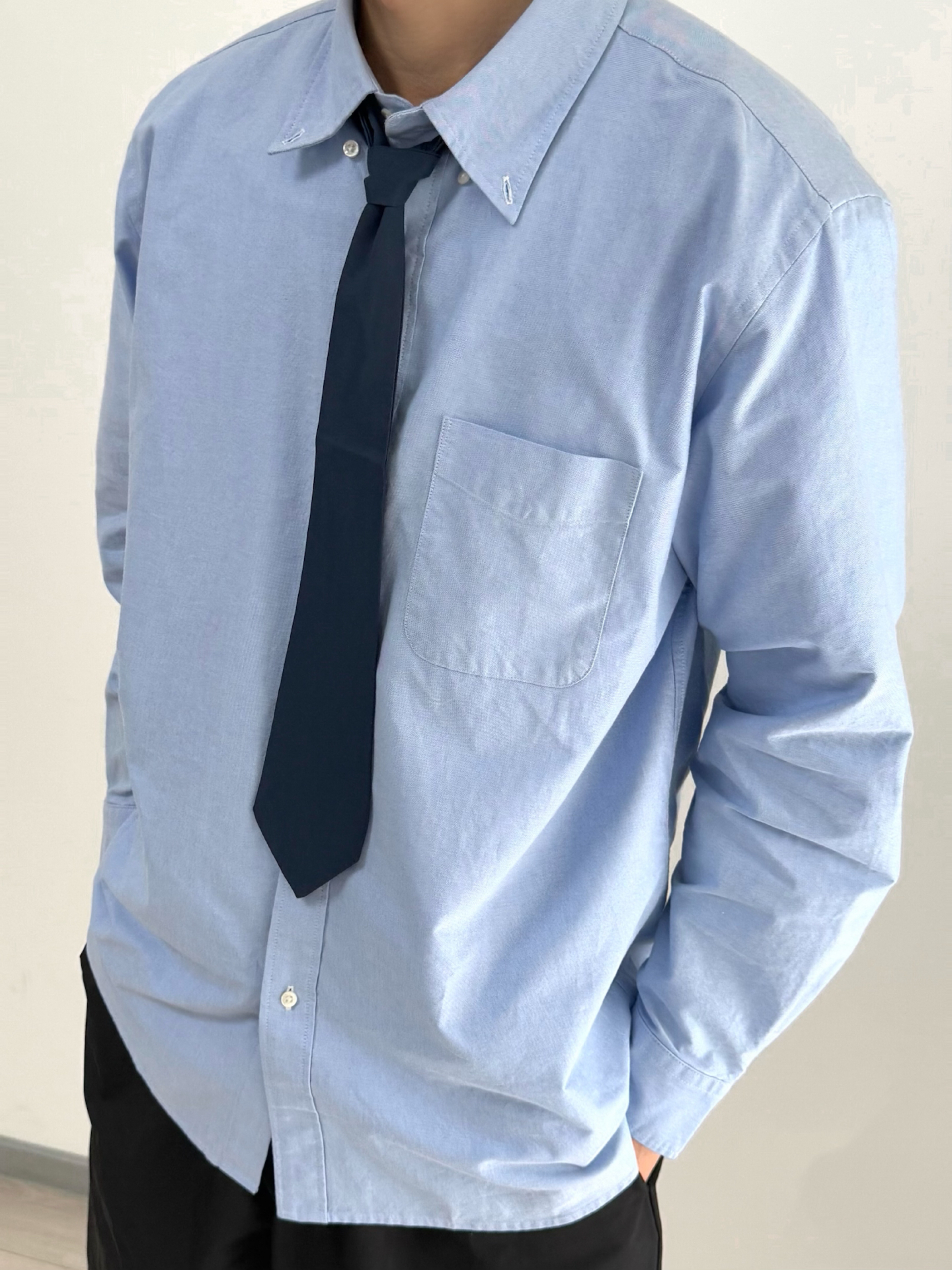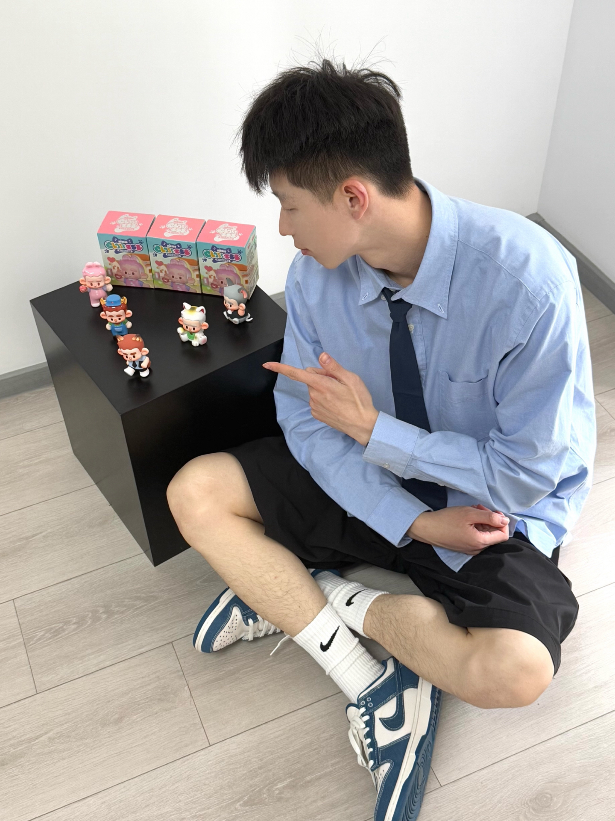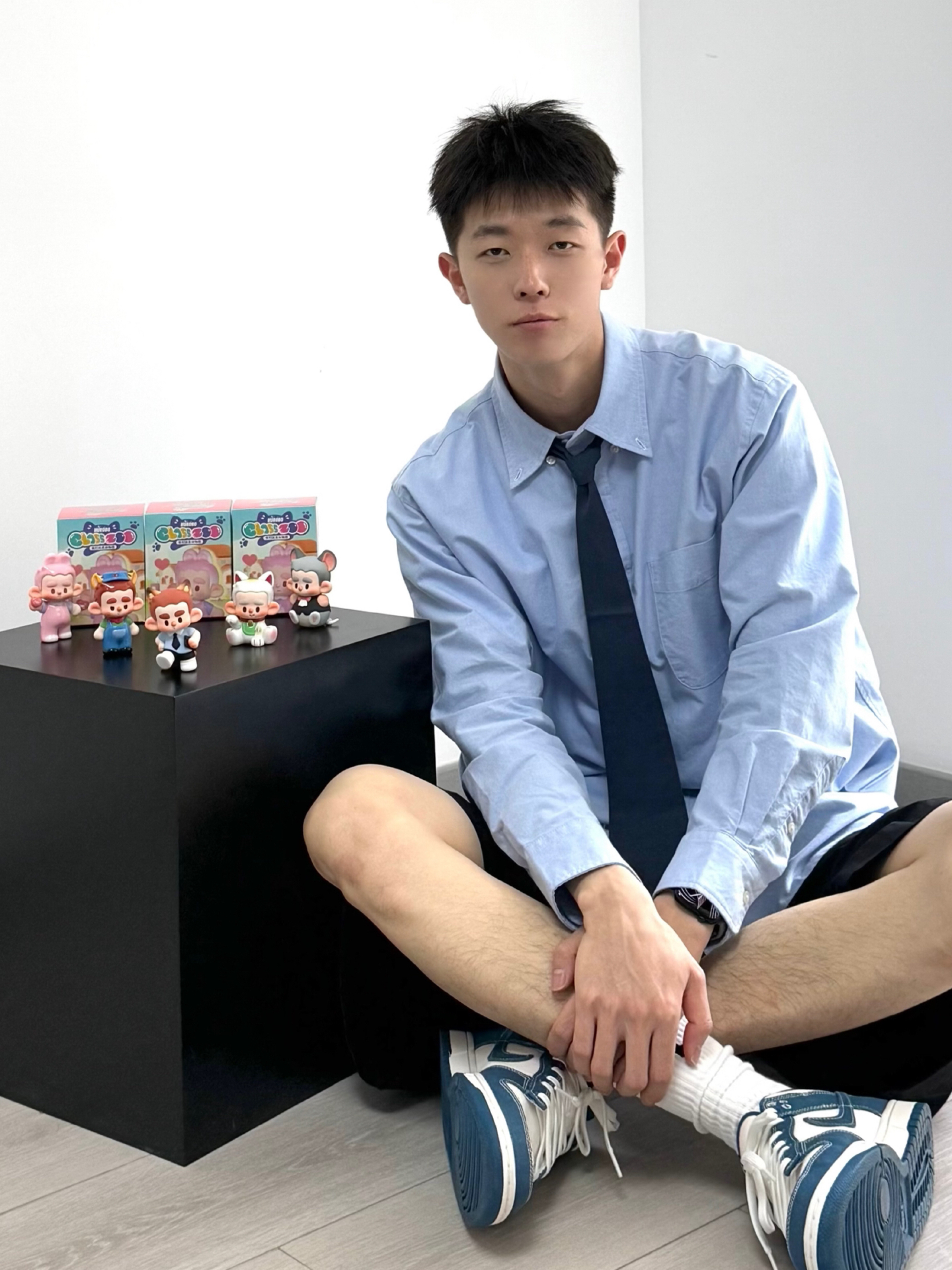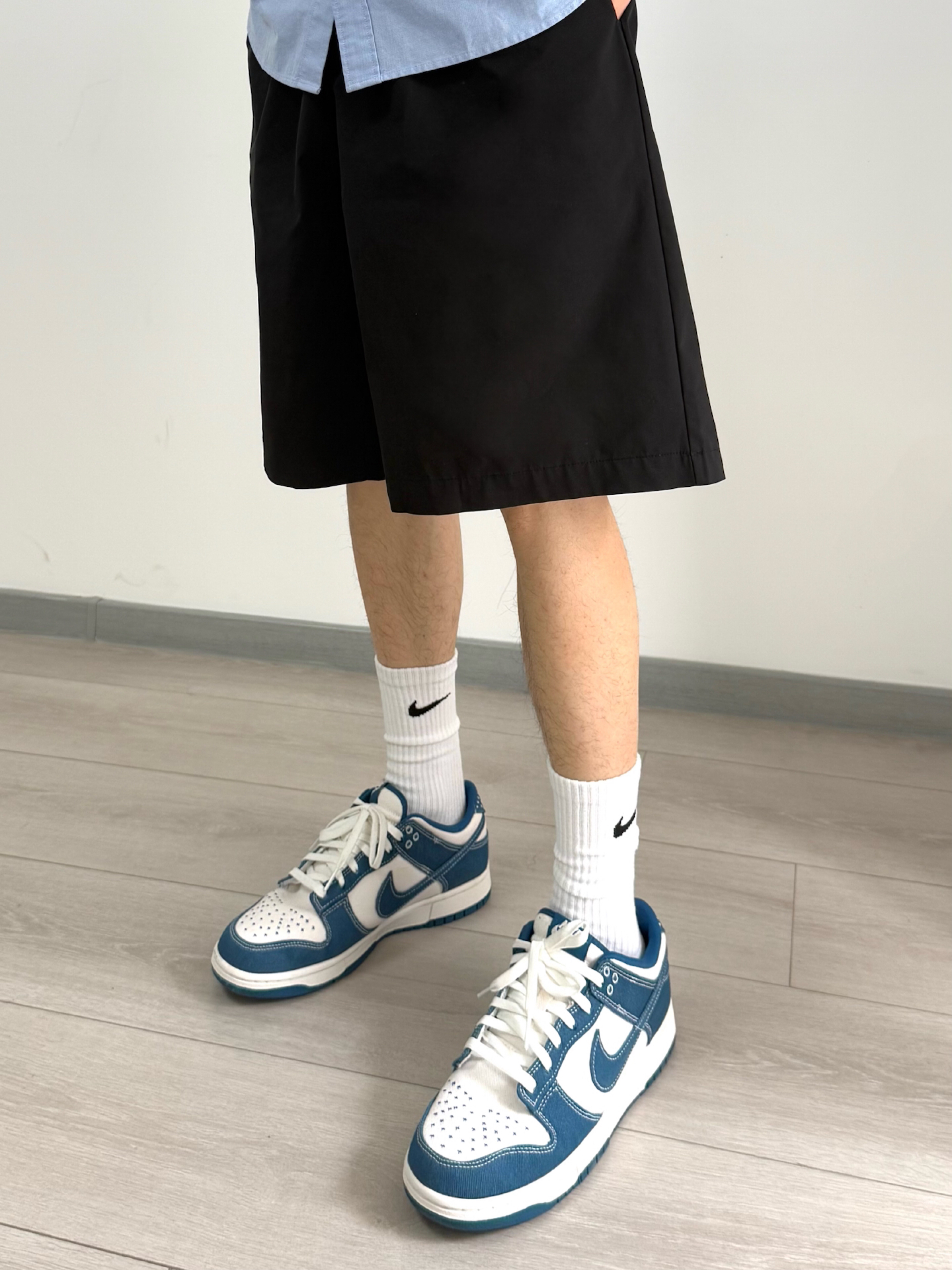 春夏男生的衣服里怎么能没有衬衫呢? 今天是学院风男友, 蓝色廓形衬衫, 搭配黑色系休闲短裤, 再穿双蓝白dunk呼应一下, 少年感男大来咯。