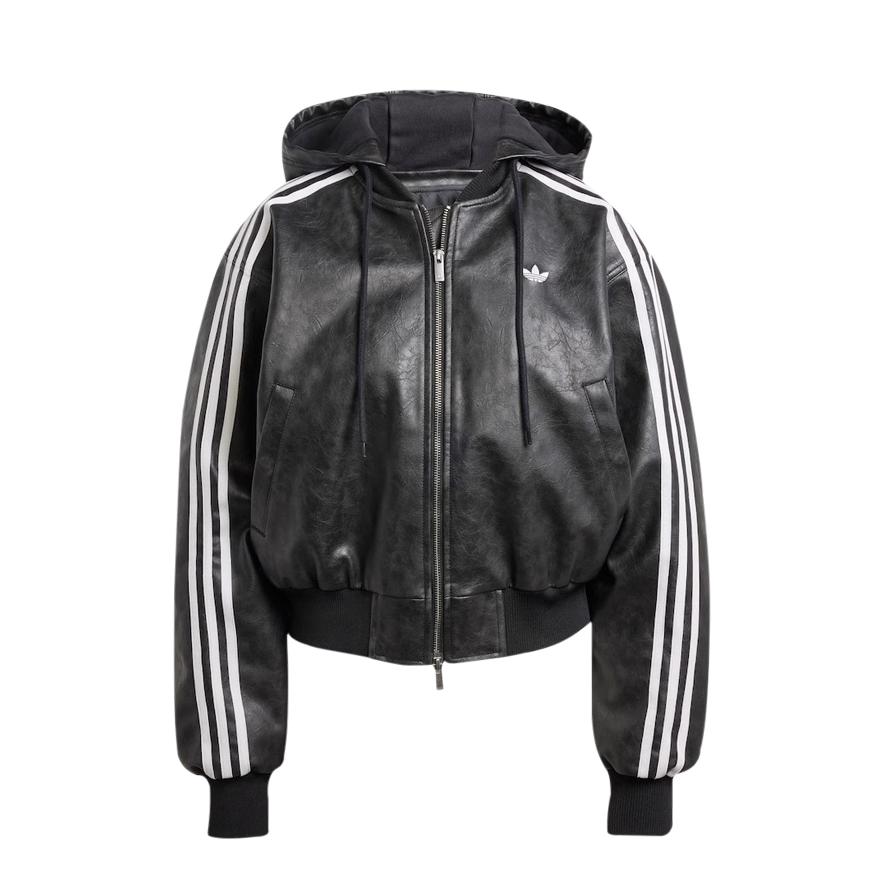 adidas休闲夹克,皮质质感高级,经典三道杠复古又吸睛,轻松打造街头范。搭配同系列休闲裤,独特剪裁超有设计感,三道杠元素呼应,潮味十足。再踩上adidas板鞋,黑白配色百搭又复古,脚感舒适。整套穿搭,运动与潮流完美融合。