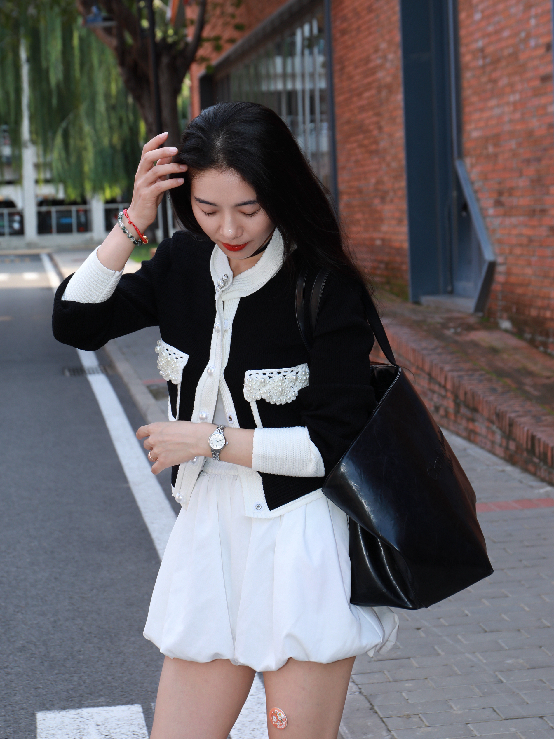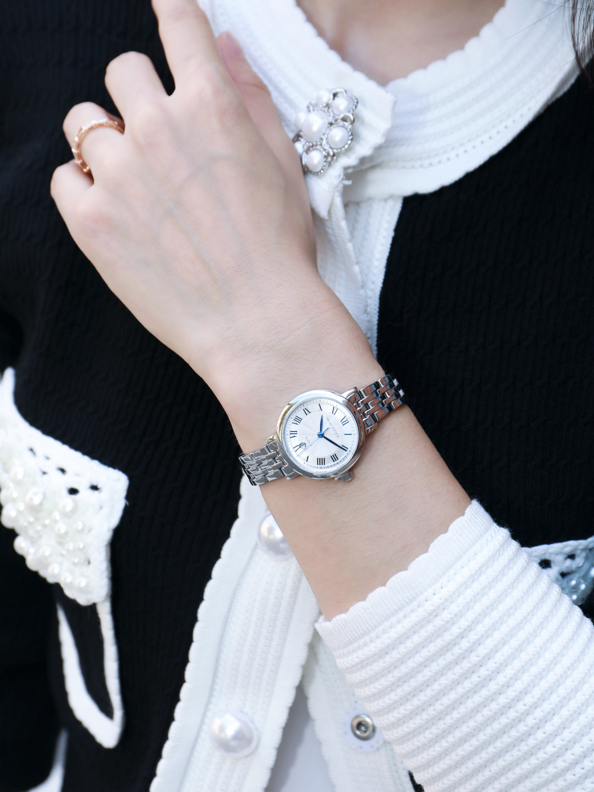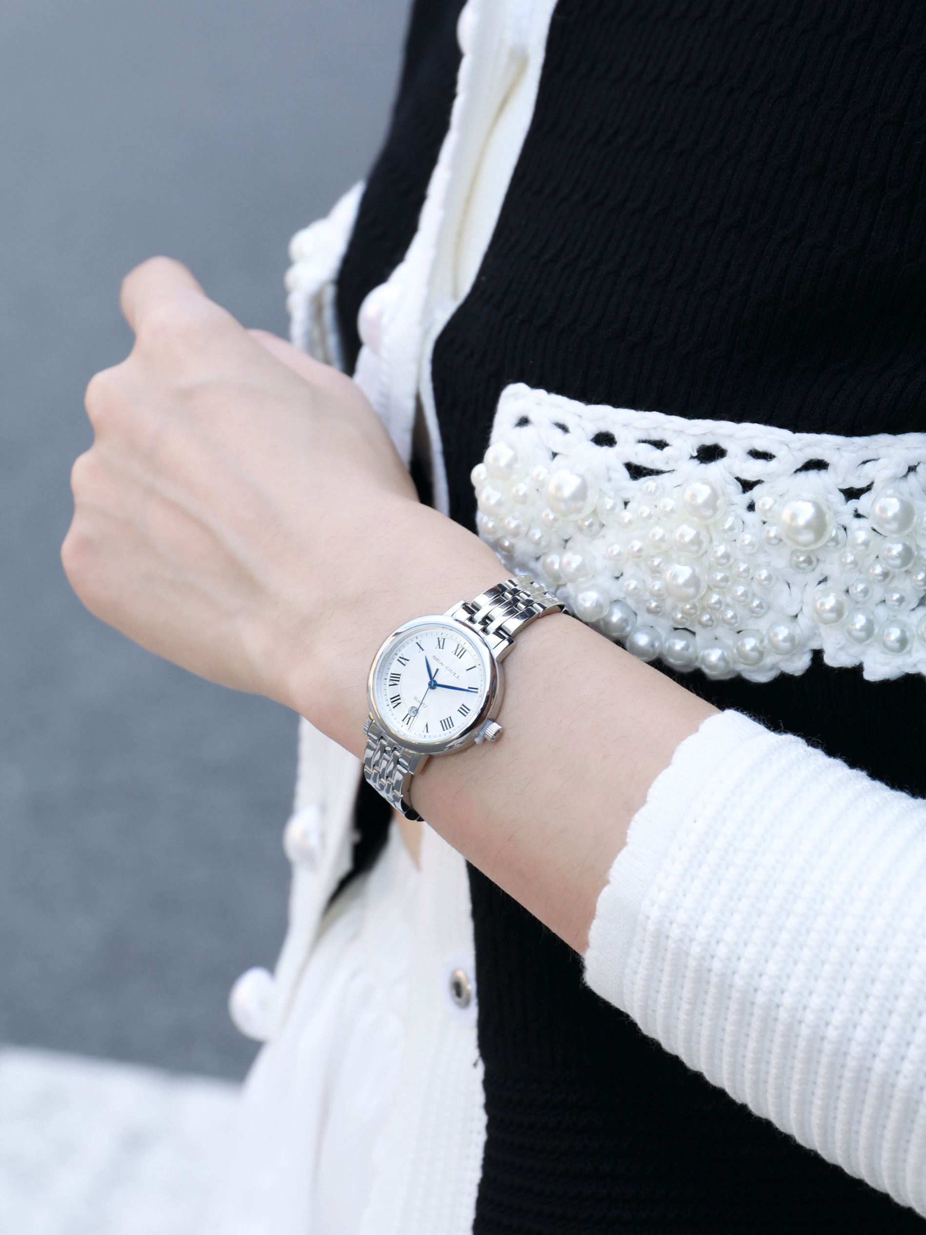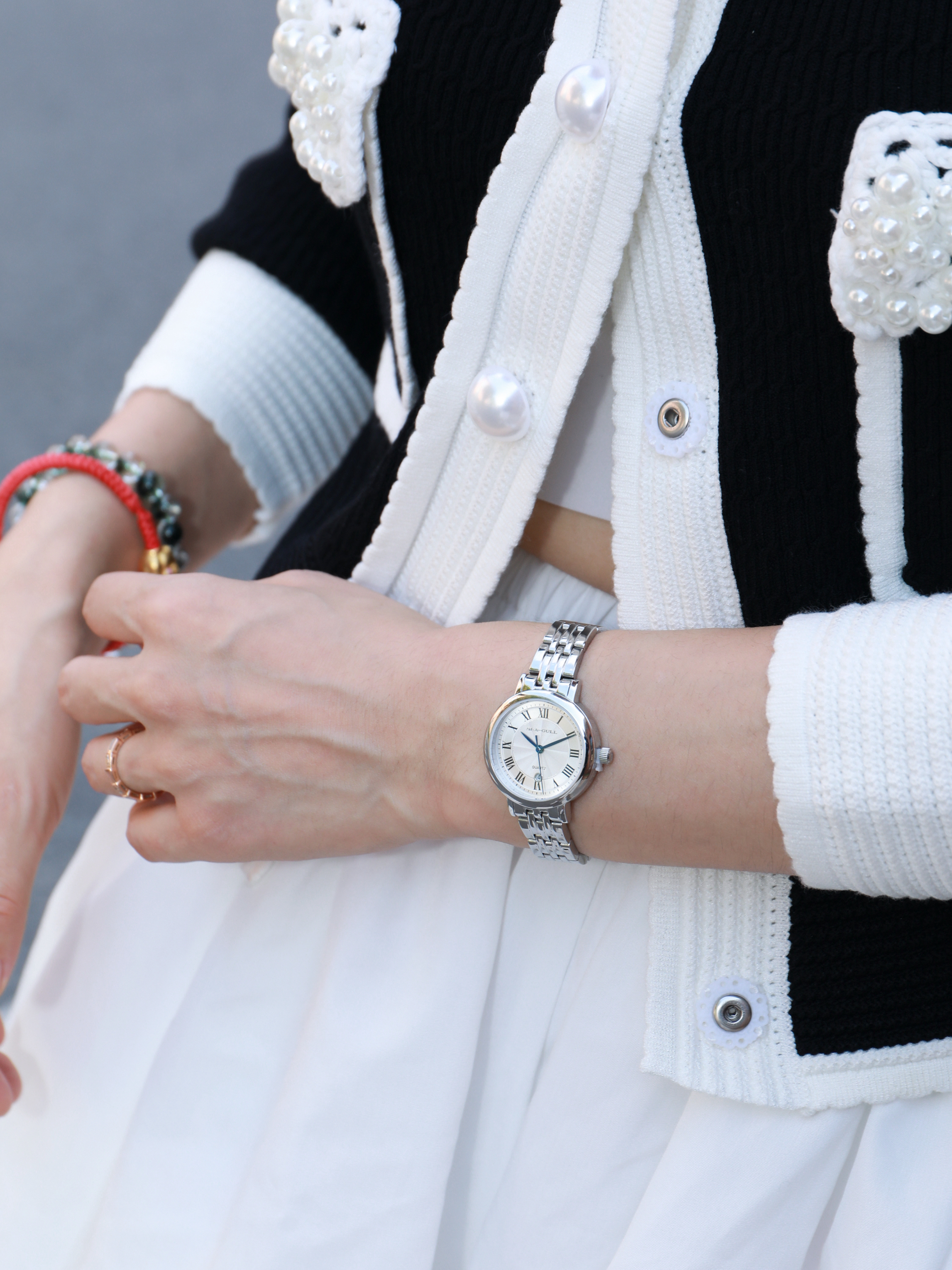 当我不知道怎么穿的时候 就应该混搭了😘 今天是法式精致再加一点俏皮感 细节藏在手腕里 喜欢海鸥新款腕表⌚️ 钢带设计,带上冰冰凉凉的 表盘小小的,格外有精致大女主的感觉 黑色上衣搭配白色短裙 一整个法式女主✌️
