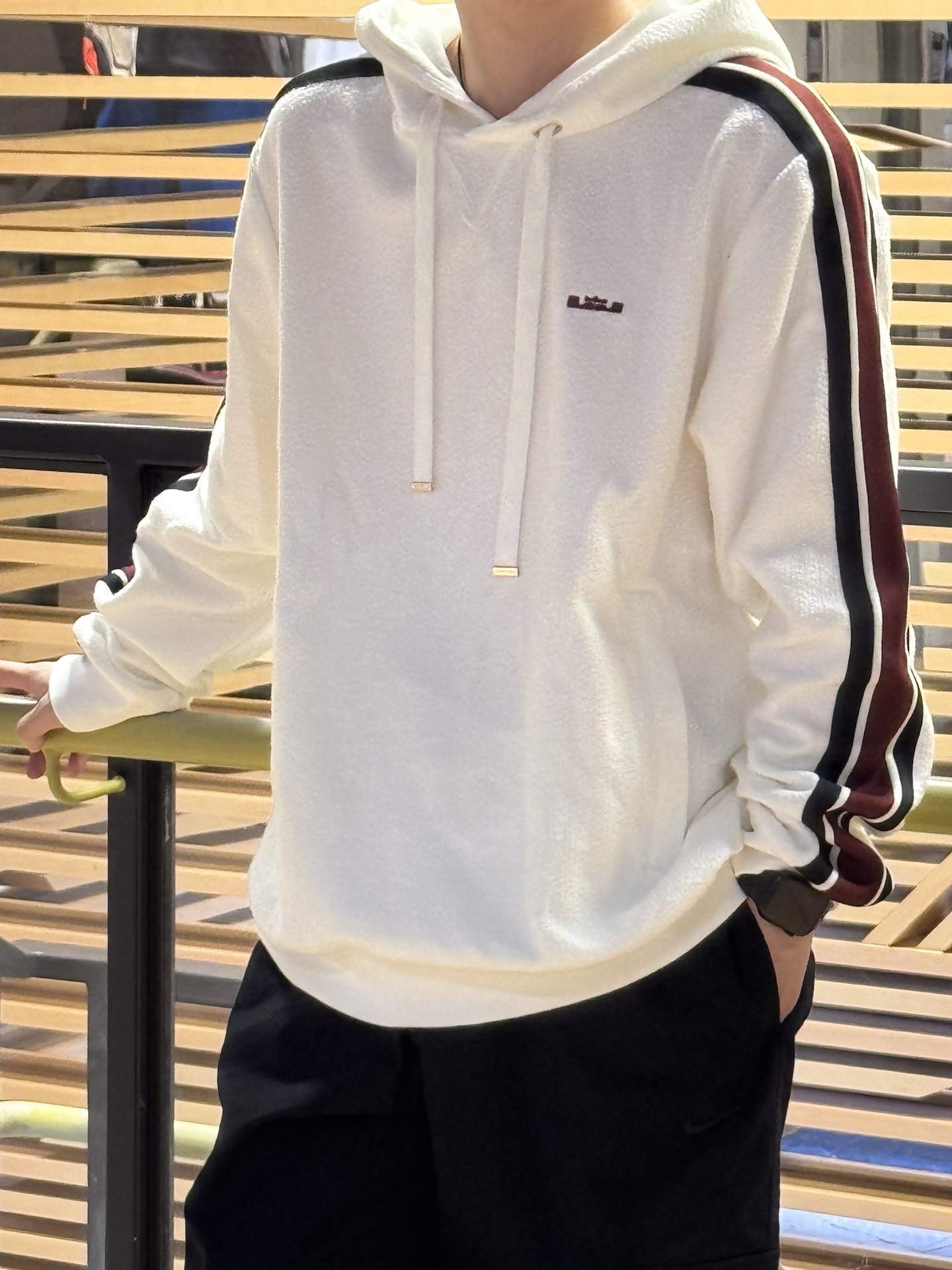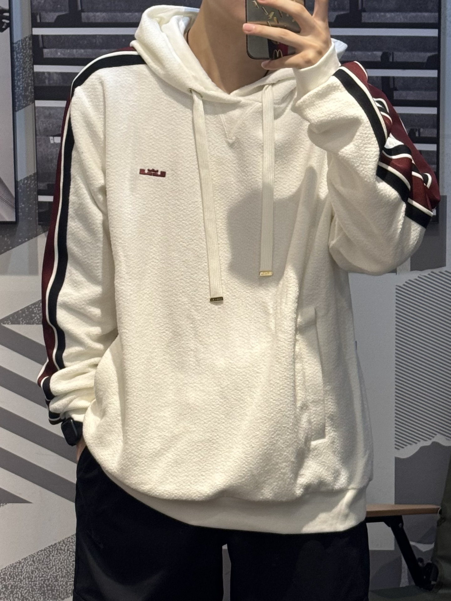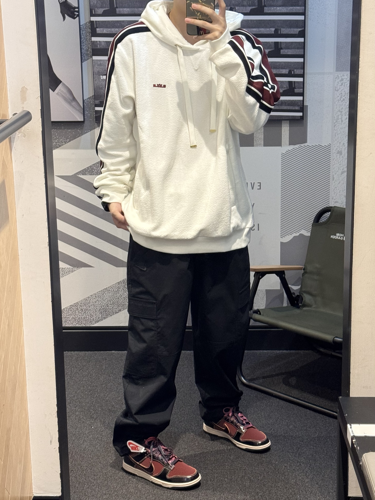 白色卫衣尊嘟好显干净 !! 两侧酒红色线条贼拉有秋冬的氛围感~ 上身宽松显瘦 搭配直筒工装裤➕同色系dunk 轻松get少年感穿搭🎧 #早八卫衣懒人公式 #预热一下秋冬穿搭 #送给时髦穿搭党 #一脚蹬进秋天 #一键入秋的明星穿搭