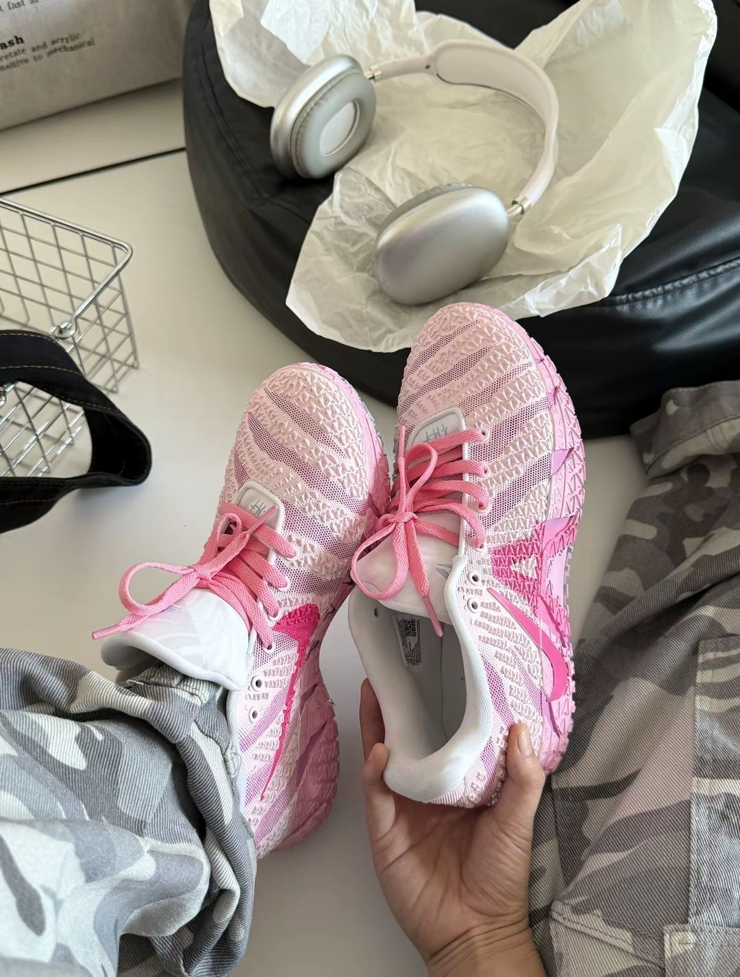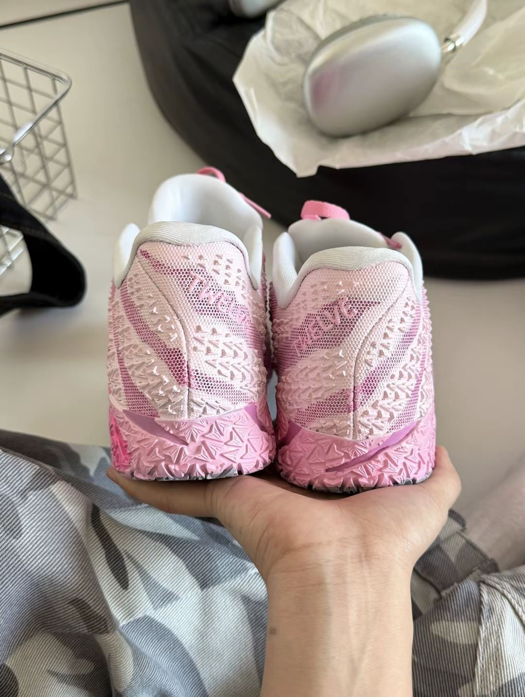 莫兰特三代,粉色定制款,独一无二的鞋子,穿它去炸街,回头率超高好嘛~ 作为实战篮球鞋,脚感很棒,而且包裹感很强,运动时急停扭转也不容易崴脚侧翻! 鞋面是橡胶印花纹里,不仅高级有质感,透气性也很好,运动时不闷脚也不磨脚,特别舒服~ 鞋子用料很扎实,物有所值~ 推荐~