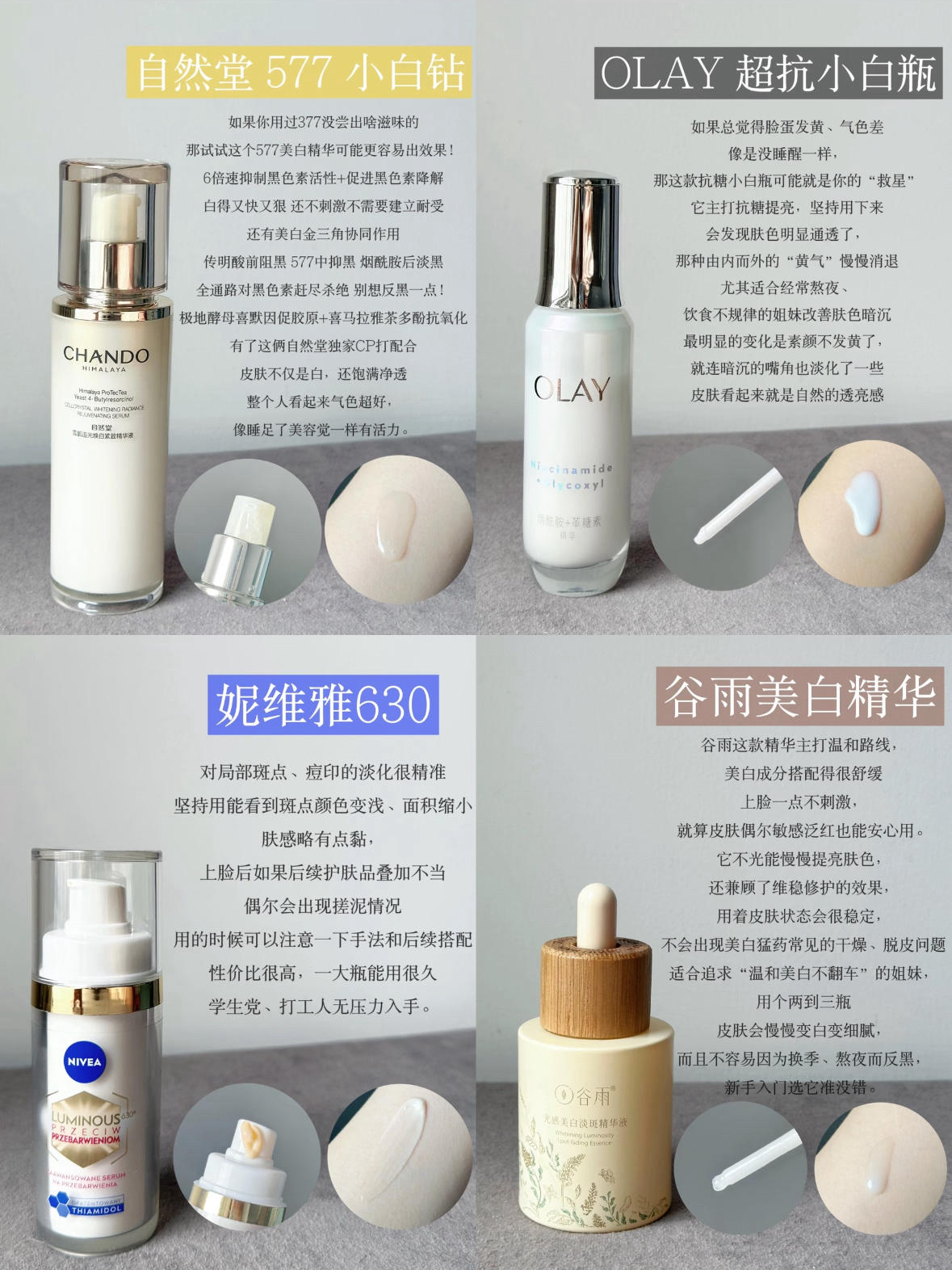 又到了美白旺季,今年夏天想一次性摆脱暗沉、黄气,养出透亮好皮肤? 今天分享一下我自己在用的四款热门美白精华,帮你找到最适合自己的“美白搭子” 自然堂 577小白钻:三重buff叠满,白得又快 又稳还透嫩: 如果你用过377没尝出啥滋味的,那这个主打577的美白精华真值得你一试!这个成分虽然冷门,但说它是“黑色素狙击手”一点不为过,6倍速抑制黑色素活性+促进黑色素降解。明显感觉肤色白了亮了,暗沉部位...