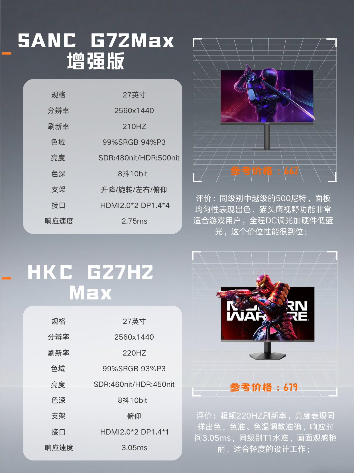 本篇笔记关联了SANC G72 Max增强版 27英寸 200Hz 2K 显示器 高刷 猫头鹰视觉功能 黑色、HKC/惠科 猎鹰二代 G27H2 Max 27英寸 220Hz 2K 显示器 电竞色彩调校 动态模糊消除 黑色、KTC 27M1 27英寸 200Hz 2K 显示器 高动态解析 全功能升降支架 黑色等商品,为用户提供真实的使用体验和购买参考。