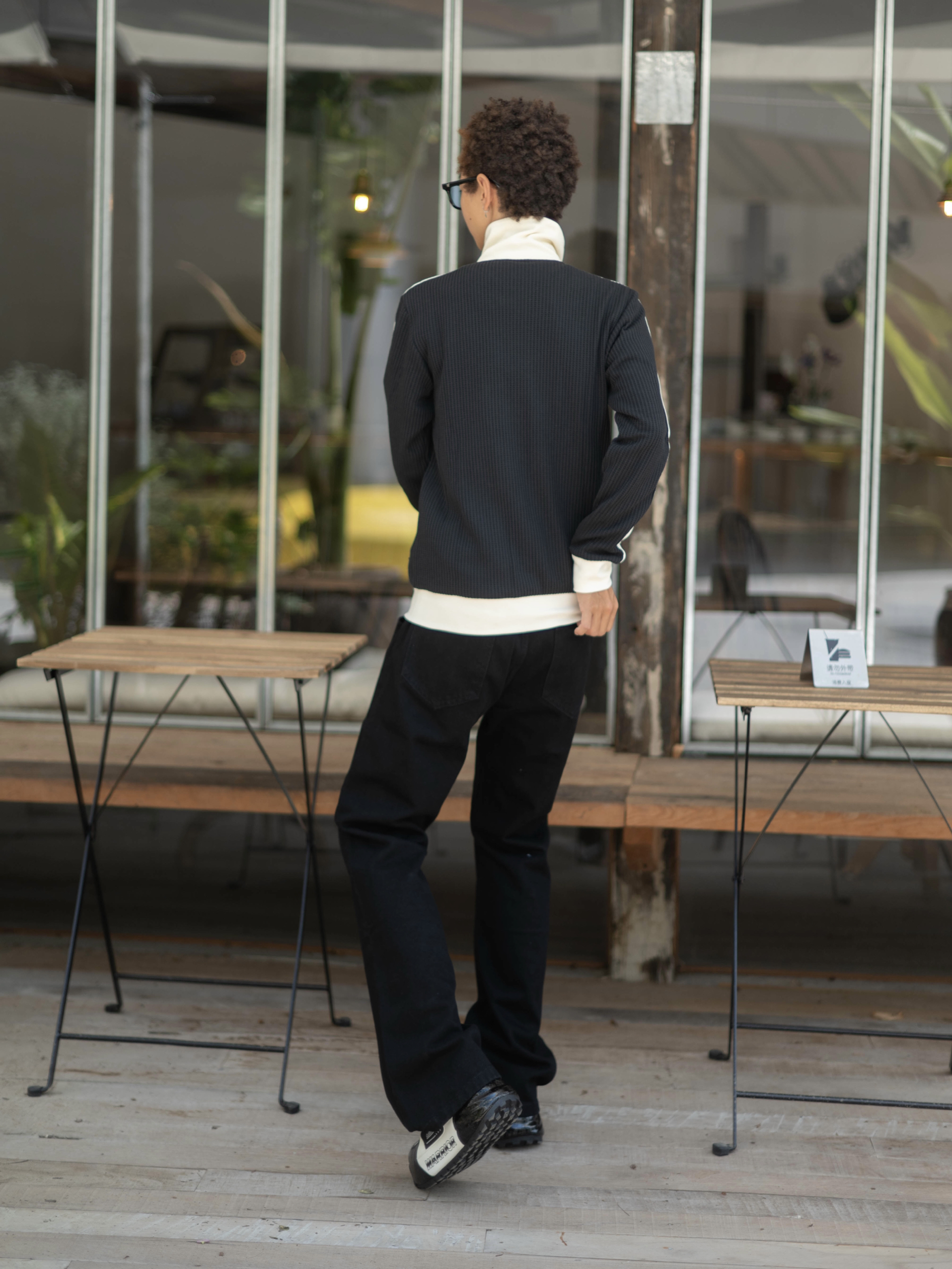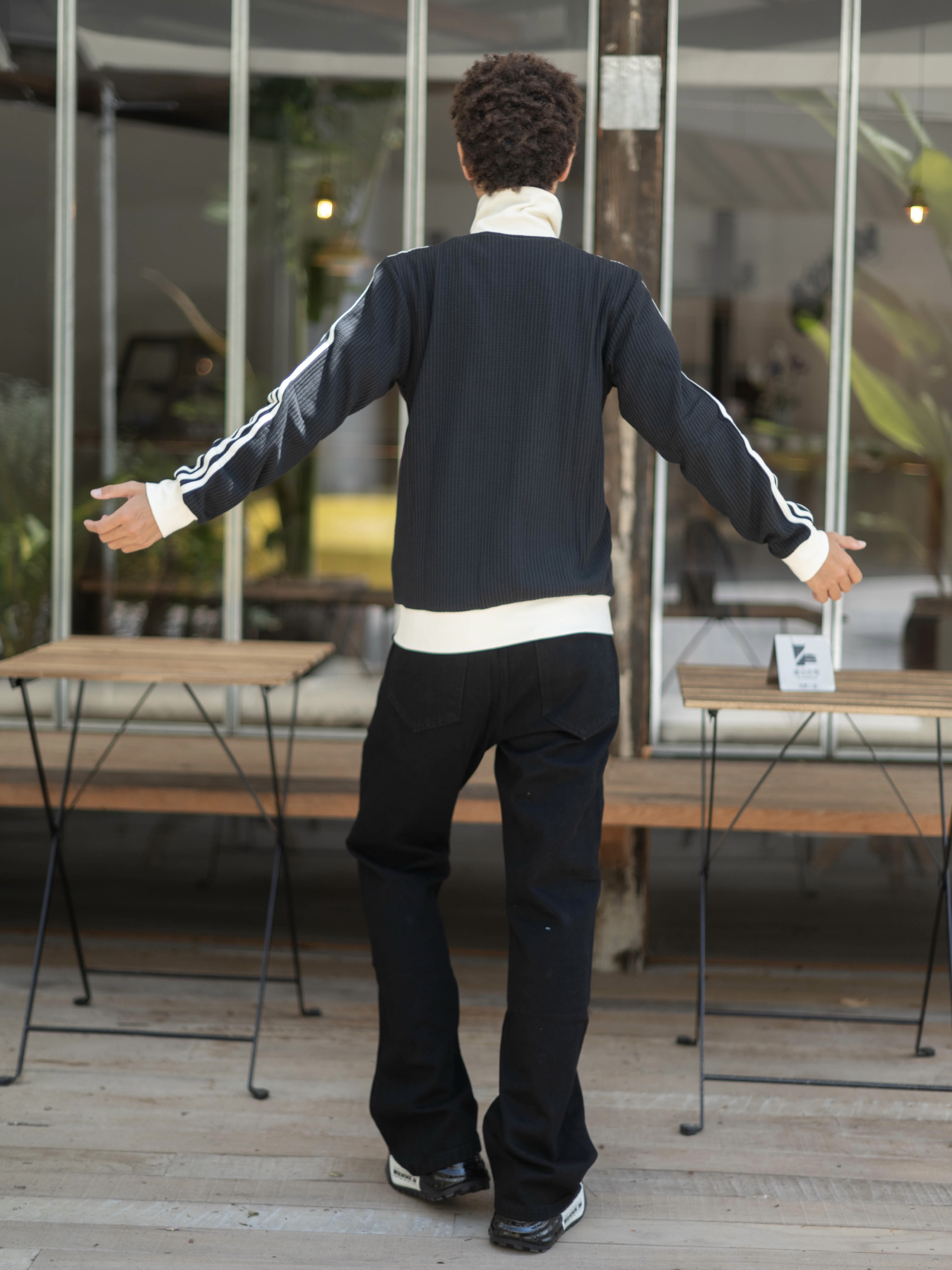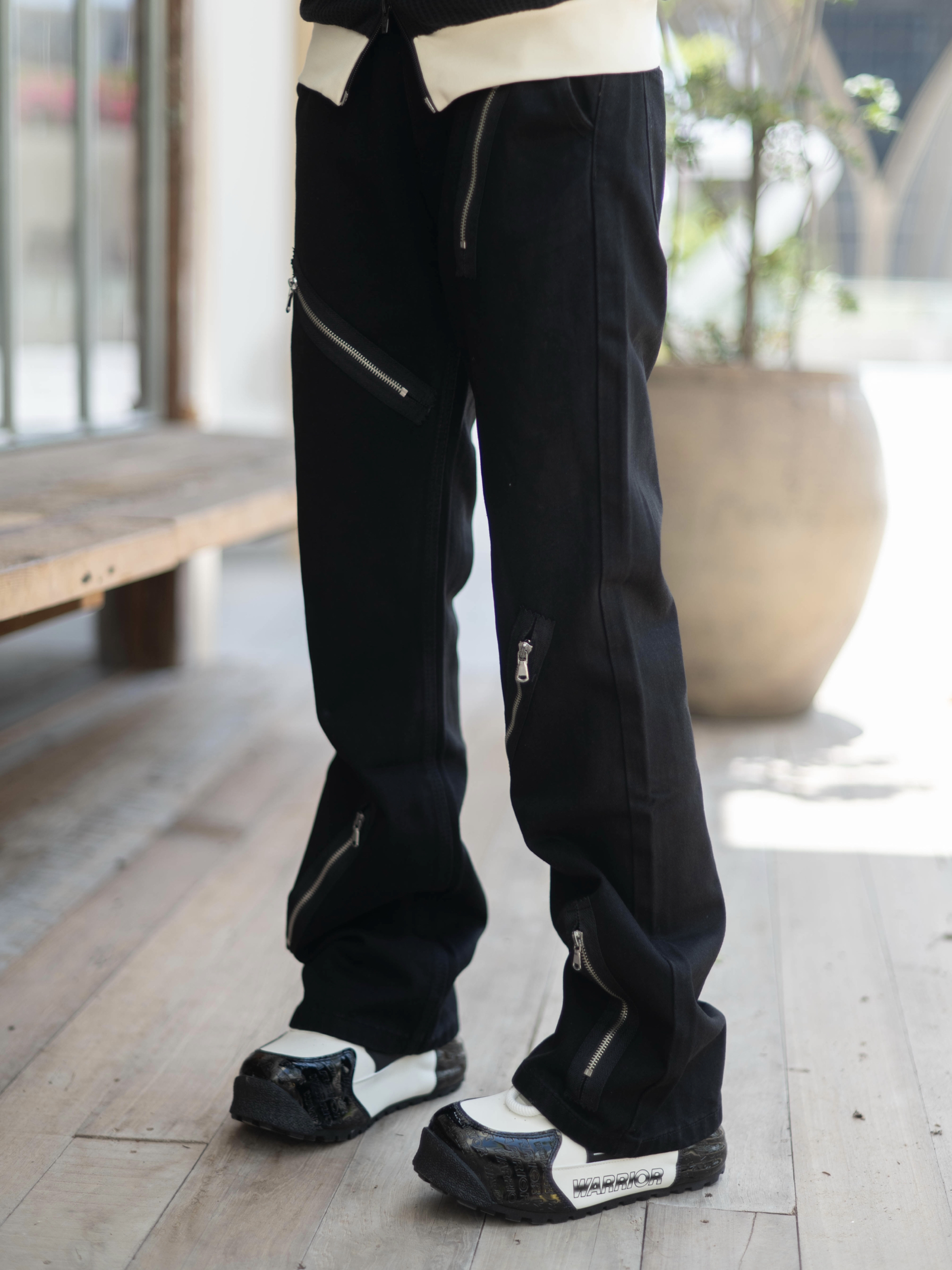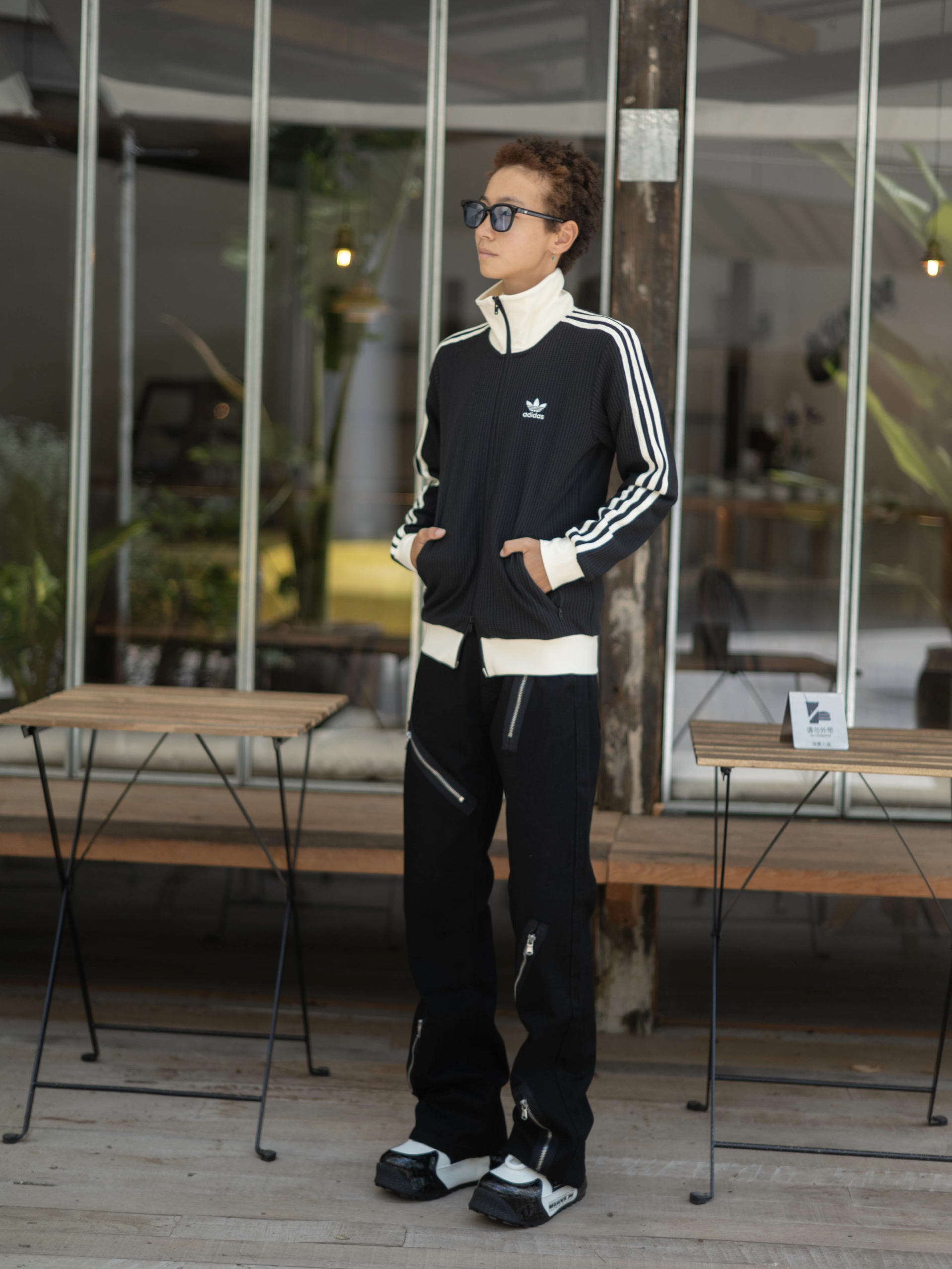 欢迎进入无敌小圆哇子的穿搭分享频道 172CM|55KG 👔:m👖:m|👟:39码 暗黑系穿搭控看过来! 今天上身Voguo Relay多拉链牛仔裤 果然没让人失望~ 微喇叭裤型搭配老爹鞋 视觉上直接拉长比例 上身搭配adidas黑色外套 街头感拉满
