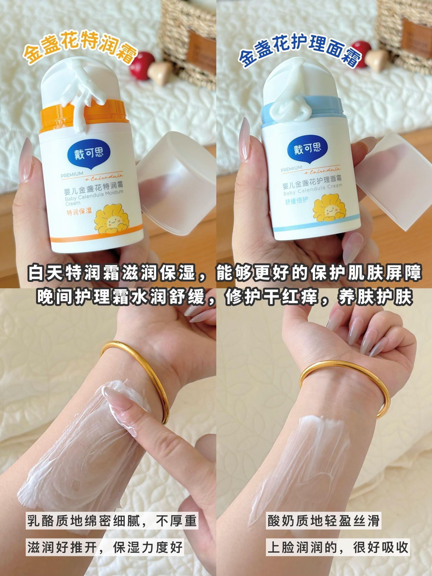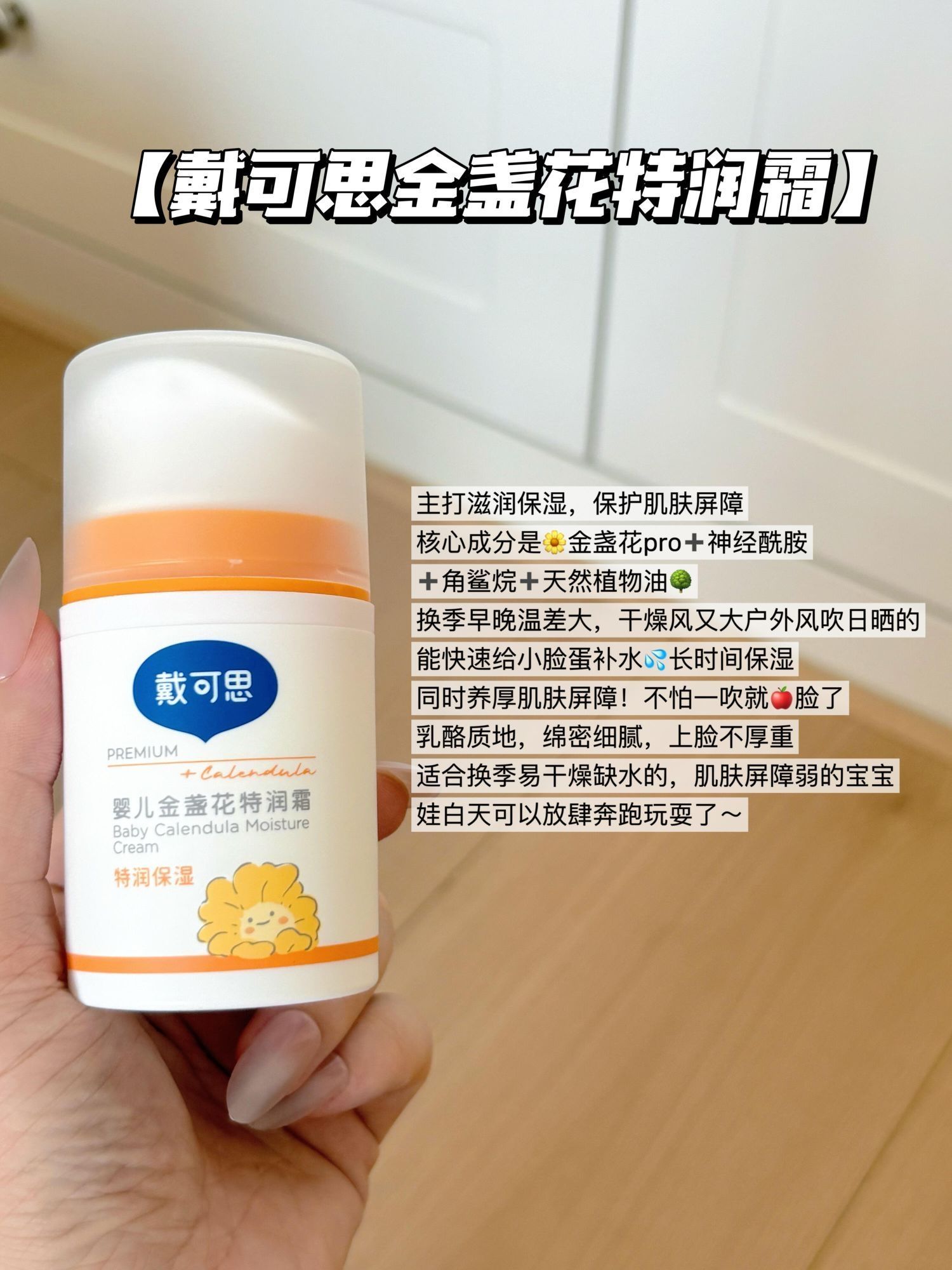 夏天护肤能“偷懒”,但换季必须重视!宝宝肌肤娇嫩,稍不注意就会干、敏、痒找上门。作为二胎宝妈,我在选宝宝面霜上积累了不少经验,今天就分享4款亲测好用的面霜,宝妈们可按需挑选。 1. 戴可思金盏花特润霜(日间专用) - 核心成分:金盏花Pro、神经酰胺、角鲨烷、天然植物油 - 主打功效:滋润保湿,强化肌肤屏障 - 质地肤感:乳酪质地,涂抹后不厚重,吸收无负担 - 适配宝宝:换季皮肤容易干燥缺...