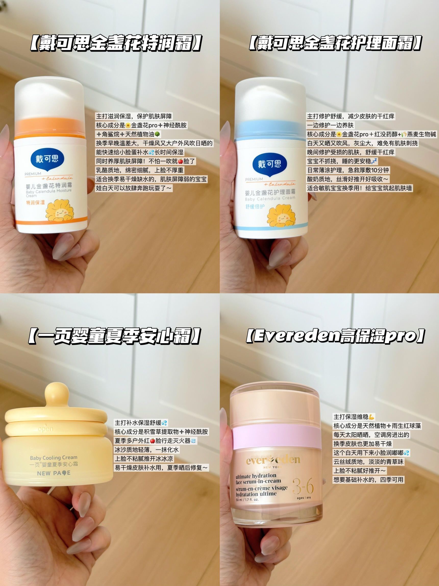 本篇笔记关联了戴可思/Dexter 婴儿金盏花护理宝宝舒缓保湿面霜清爽防干裂擦脸特润保湿补水 50g、Dexter/戴可思 新生婴儿滋润补水金盏花特润宝宝面霜高保湿擦脸防干裂 50g、一页/NEW PAGE 婴童安心霜保湿霜 滋润补水缓解干痒晒后修护 夏季30g等商品,为用户提供真实的使用体验和购买参考。