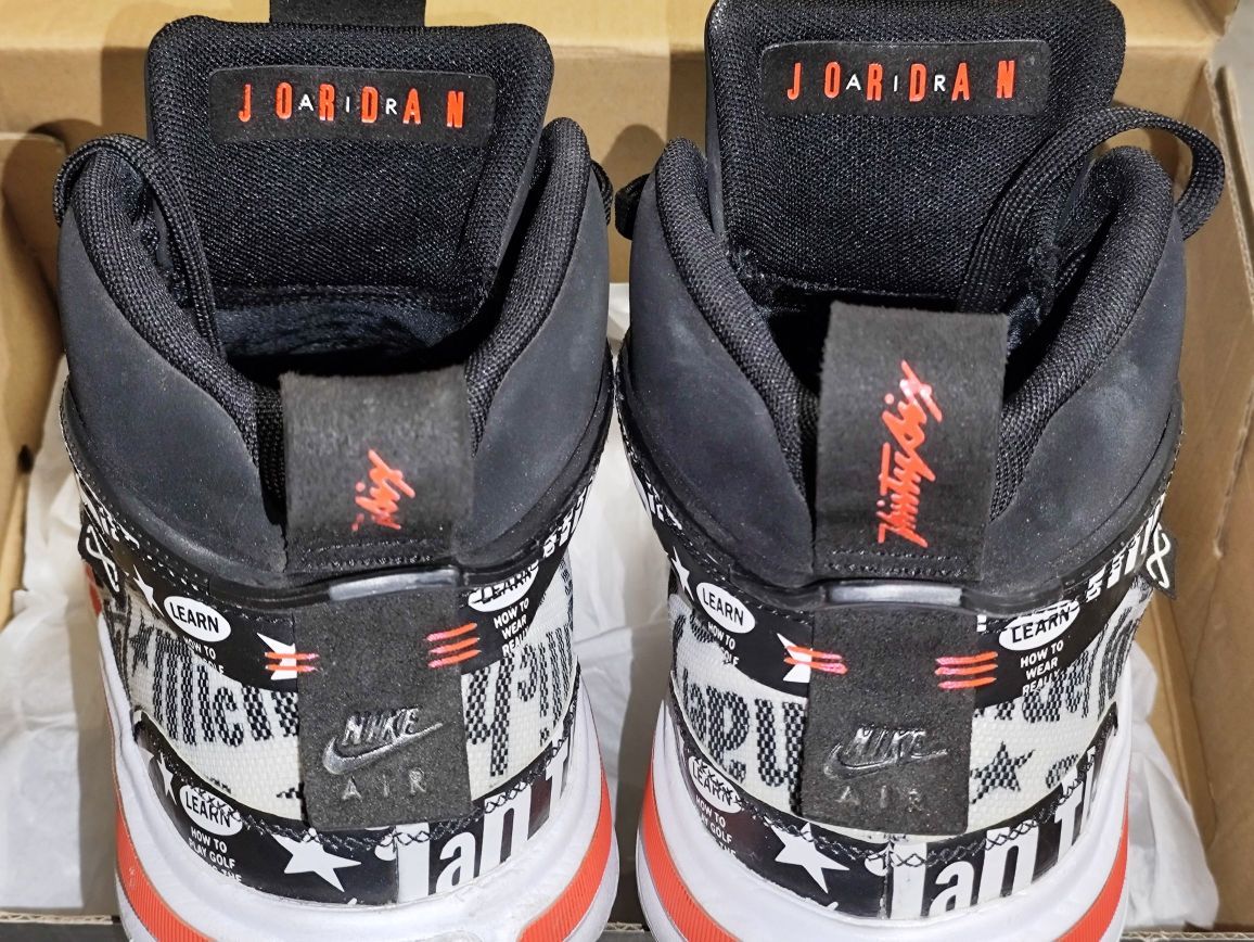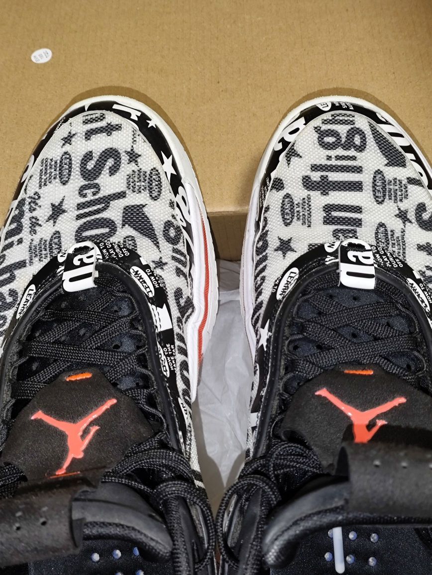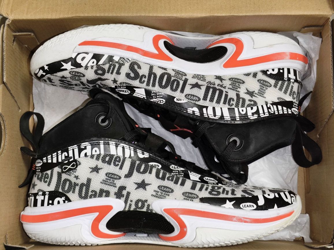 5.细节:鞋面和压胶有很多涂鸦,鞋带孔的压胶上有摩斯密码。飞人logo遍布鞋面,tpu,鞋舌,后跟。鞋舌上方和提还都是翻毛皮,鞋口手感像是麂皮,不过应该是人造革。