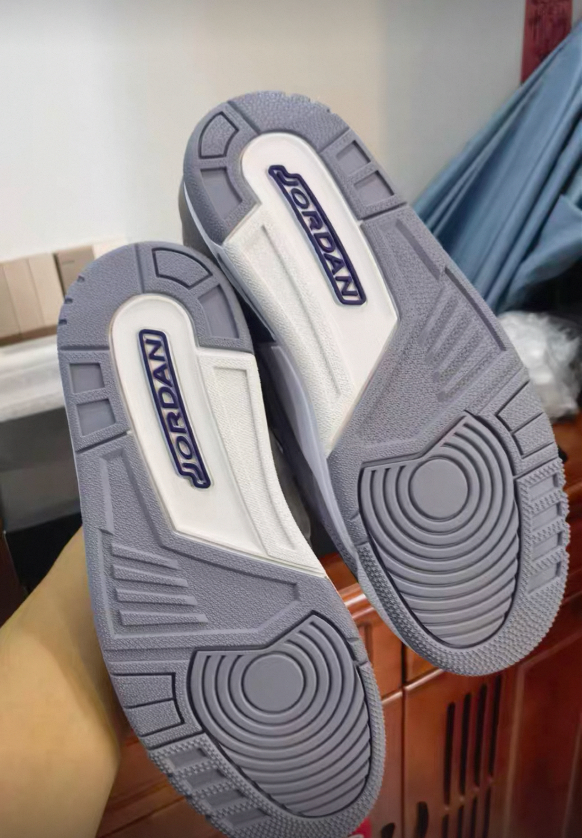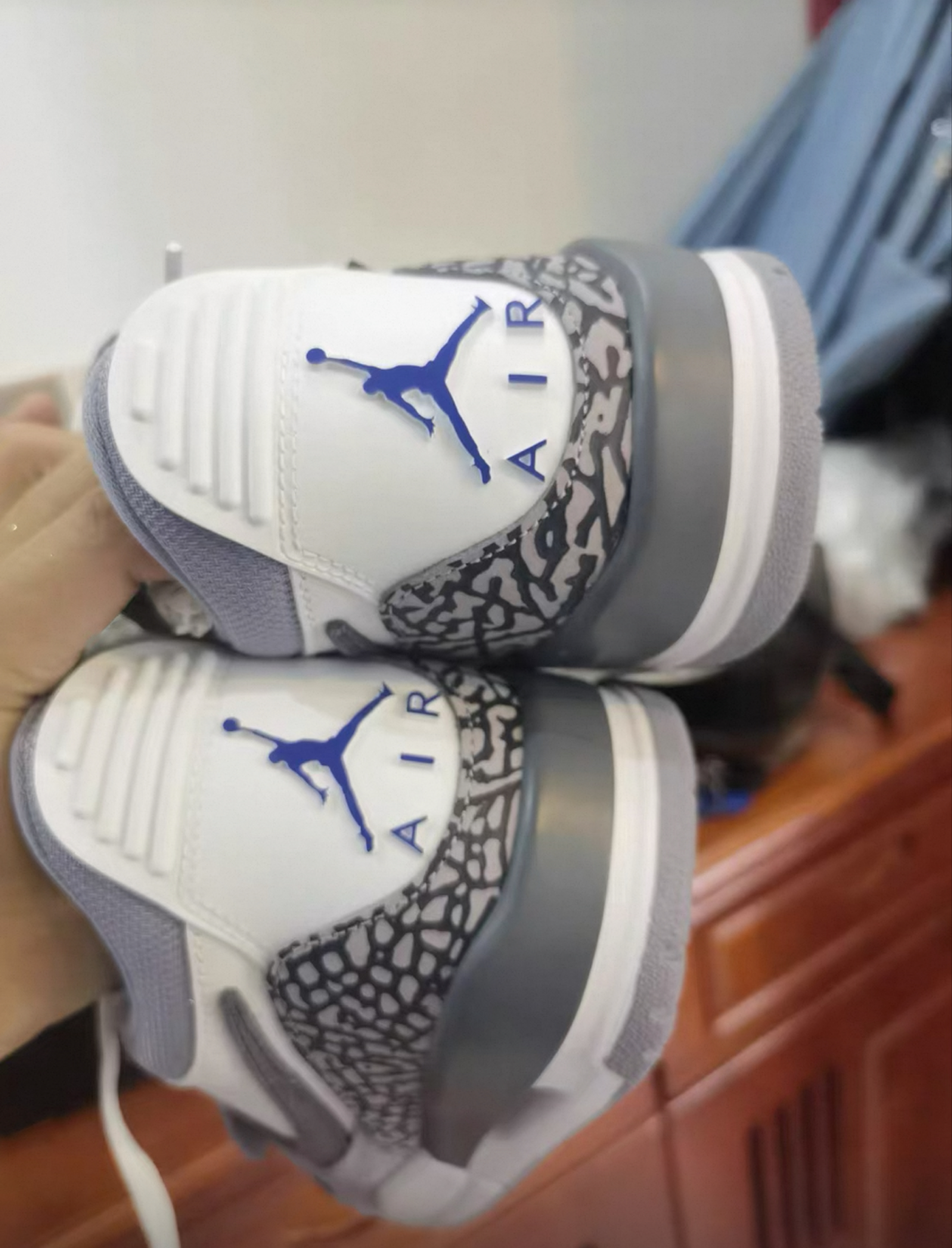 鞋面结构:鞋款主要采用优质皮革和荔枝皮材质打造,鞋头及鞋身设计与AJ1极为相似,但增加了魔术贴和气垫设计。后跟处则加入了AJ3标志性的爆裂纹元素和AIR标志,增强了视觉辨识度。