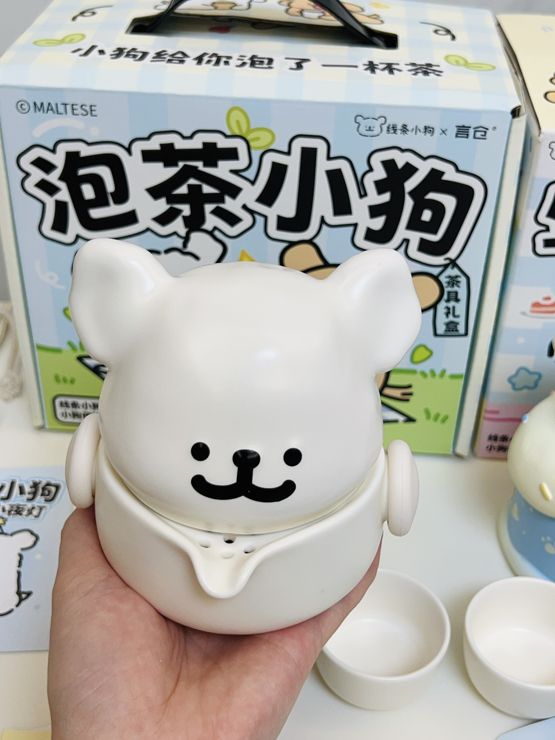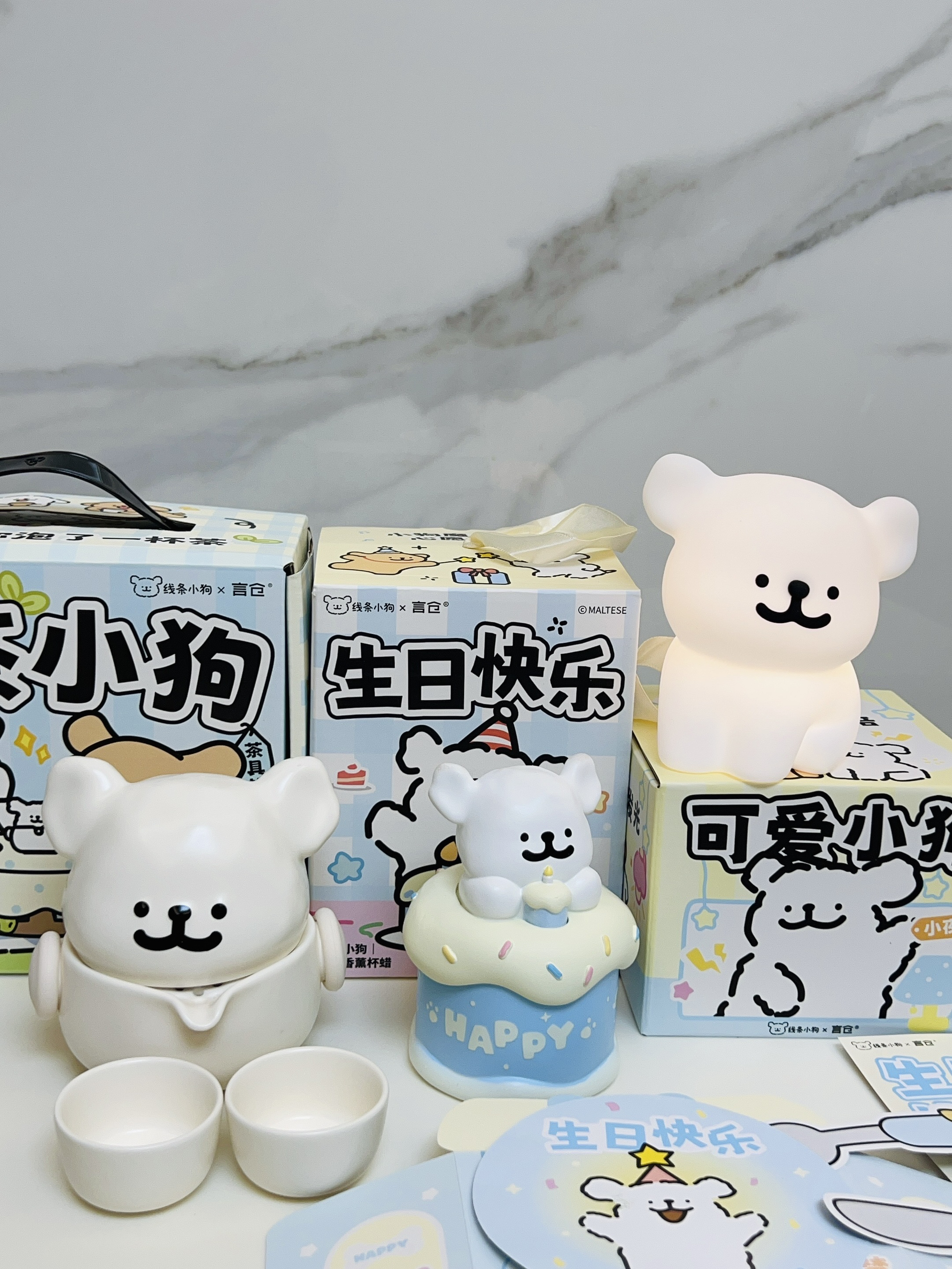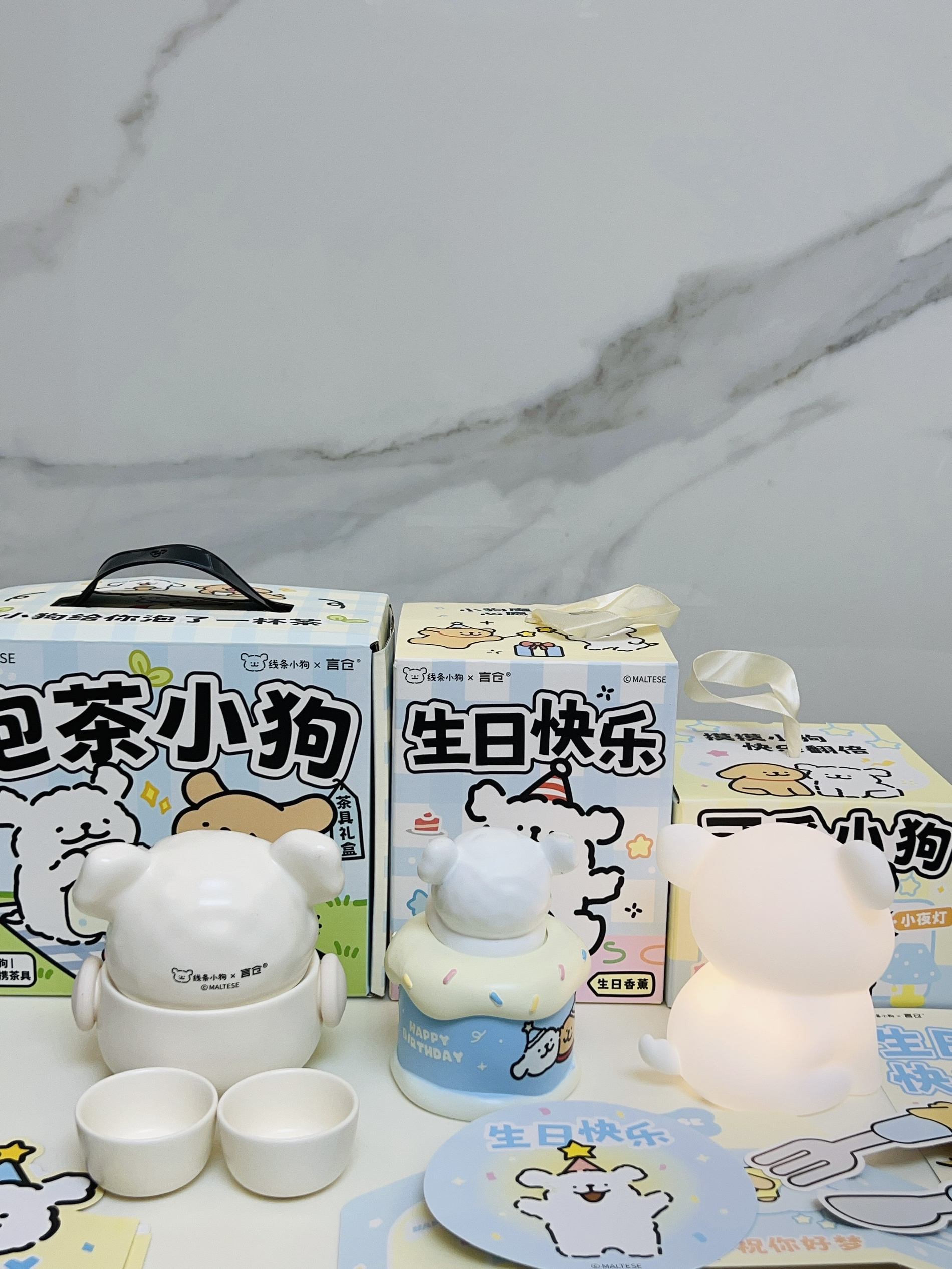 是我喜欢的言仓×线条小狗联名礼盒 有一个泡茶的茶具:茶壶和两个小茶杯 还有拍拍灯:轻轻一拍就会亮灯 半夜起来上厕所方便 最后还有一个香薰蜡烛🕯️:味道小清新我感觉蛮好闻的 这些用来放在房间当摆饰都可以 礼盒包装精致 送人自用都可以的