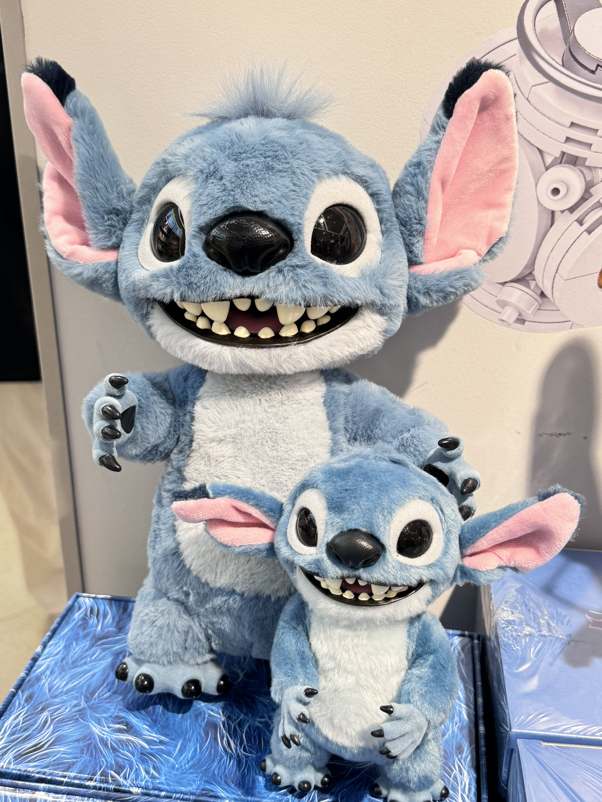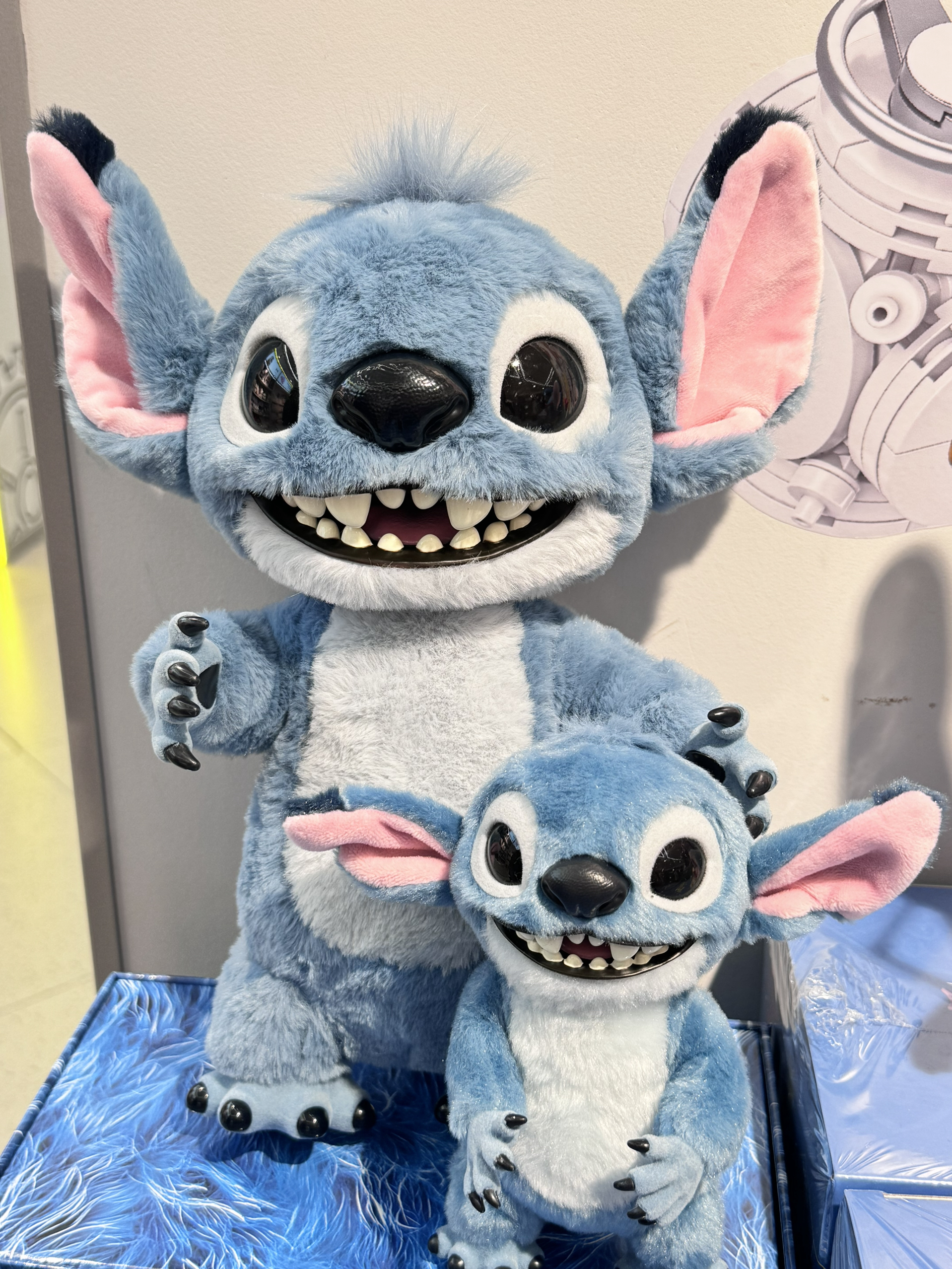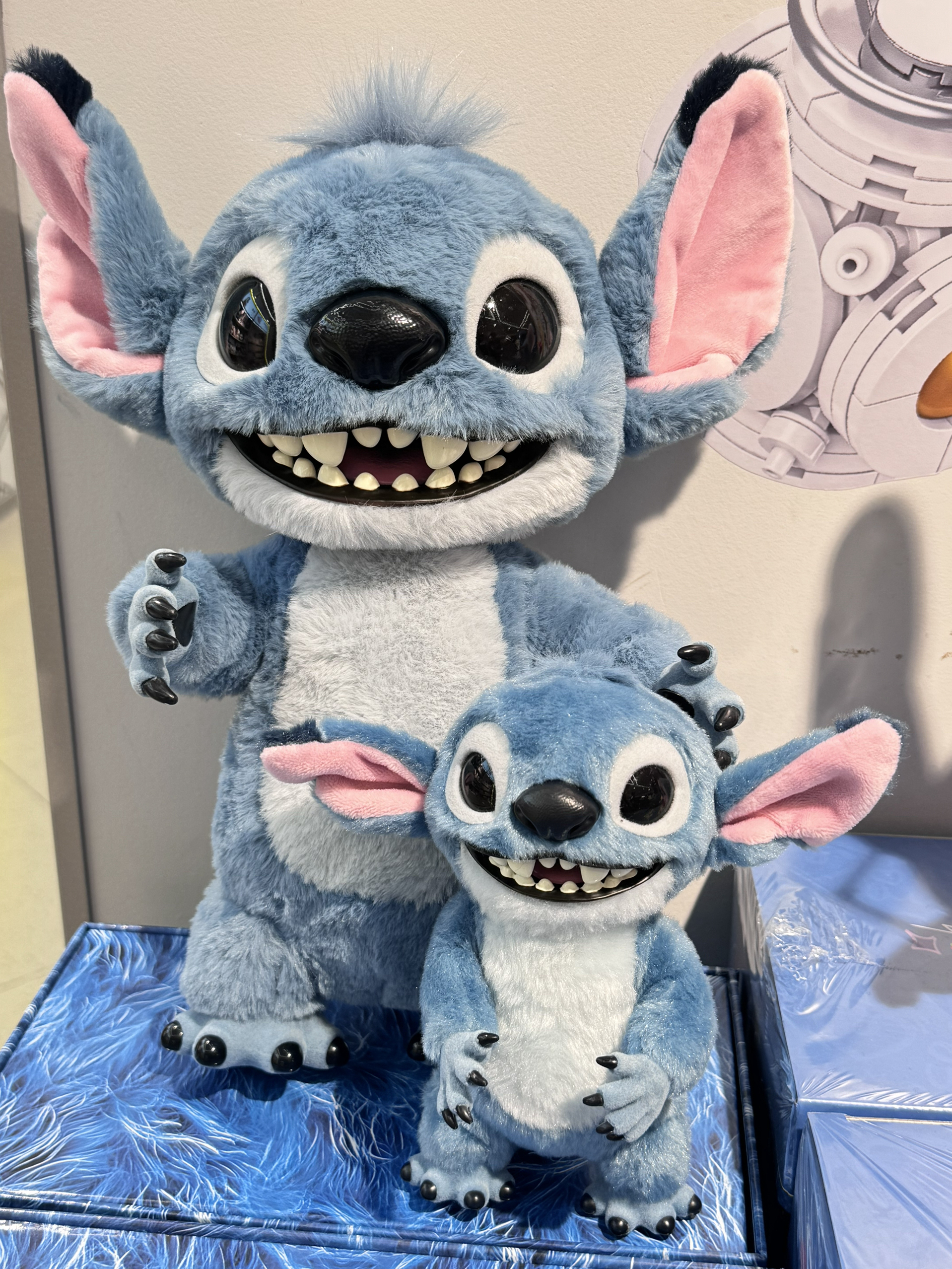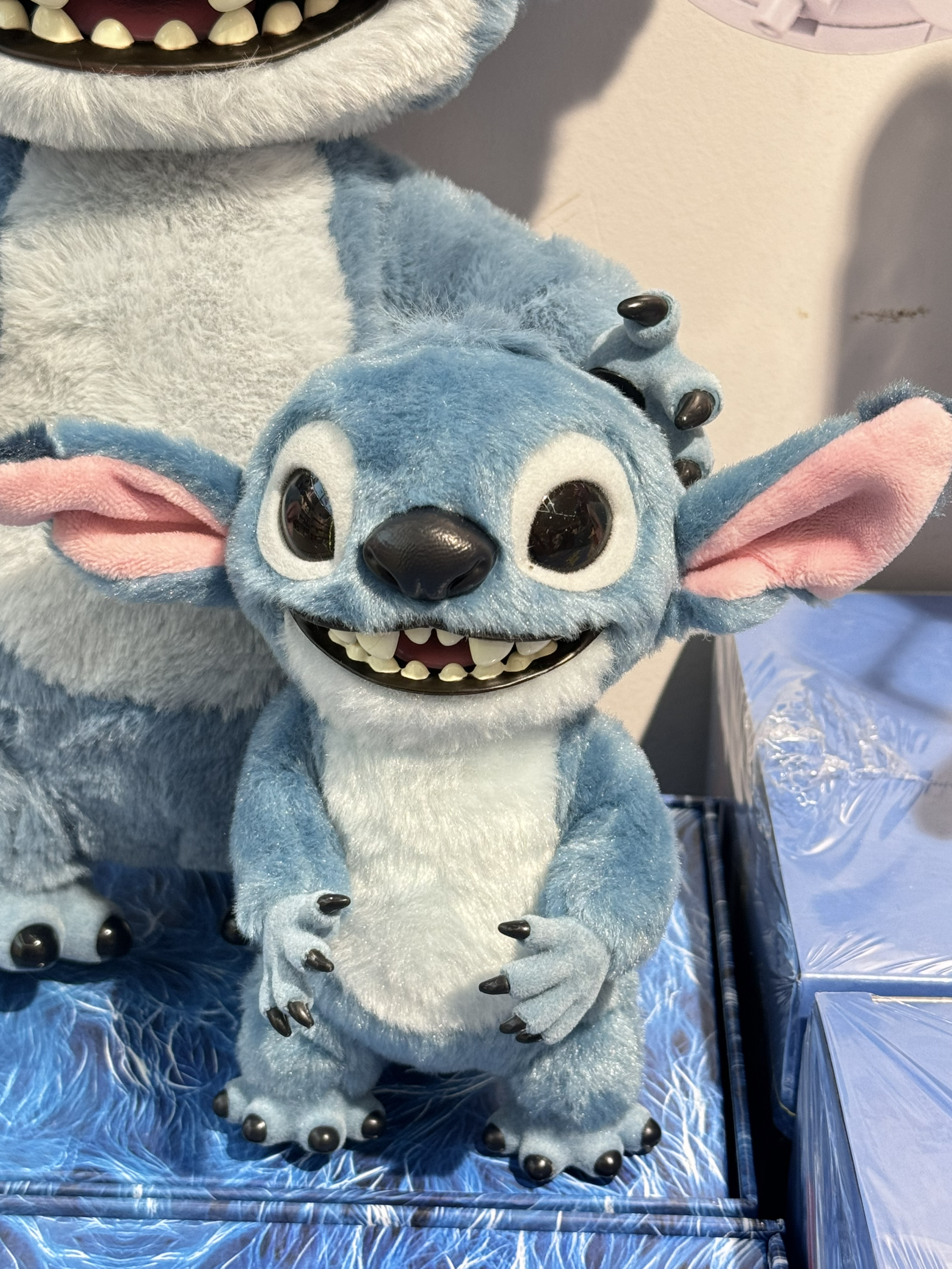 一大一小的史迪奇毛绒玩偶,蓝灰色的绒毛柔软,大大的耳朵、圆圆的眼睛,咧嘴笑的模样超萌,摆在一起特别治愈。