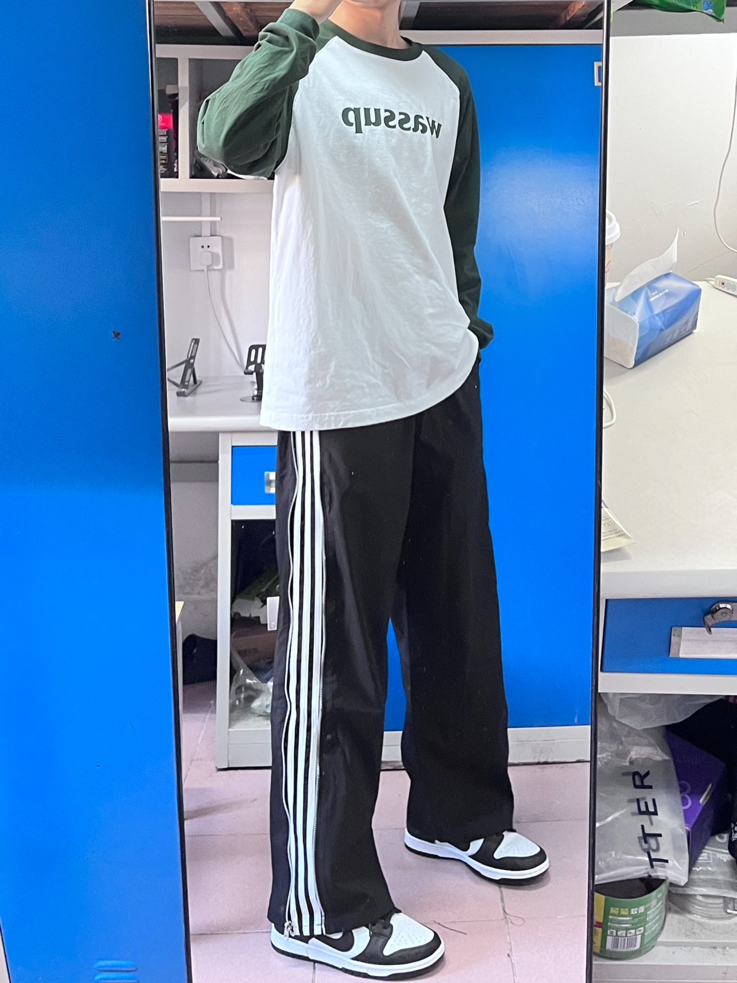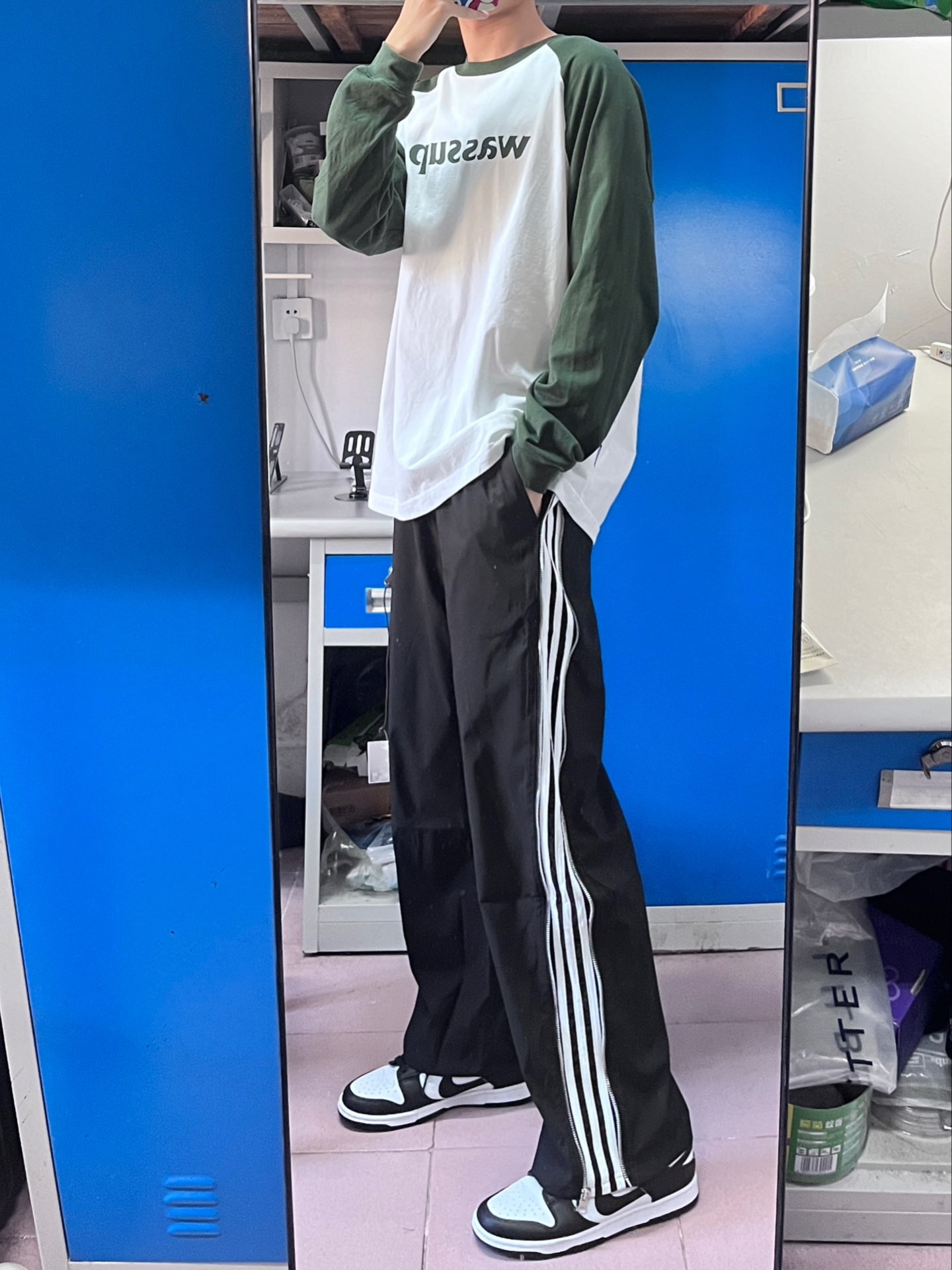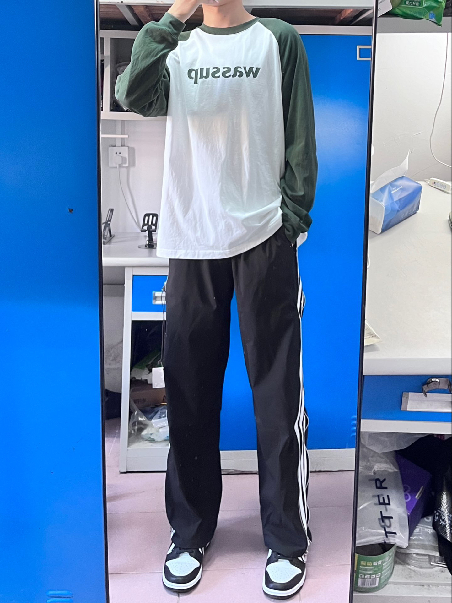本篇笔记关联了WASSUP logo系列纯棉字母印花撞色插肩内搭圆领长袖T恤 SS23T074 墨绿、传奇商行 侧边反光条纹休闲长裤 男女同款 黑等商品,为用户提供真实的使用体验和购买参考。