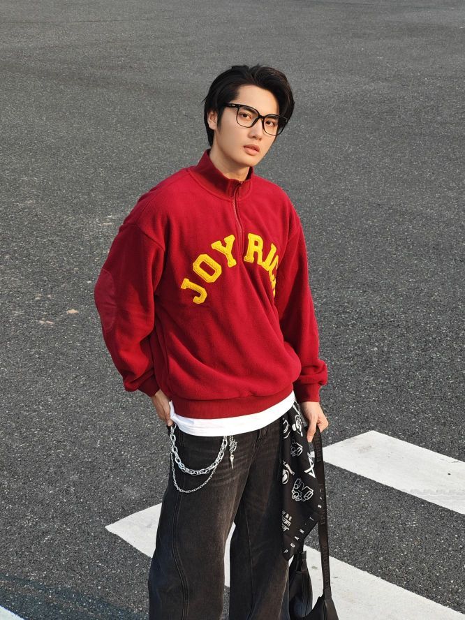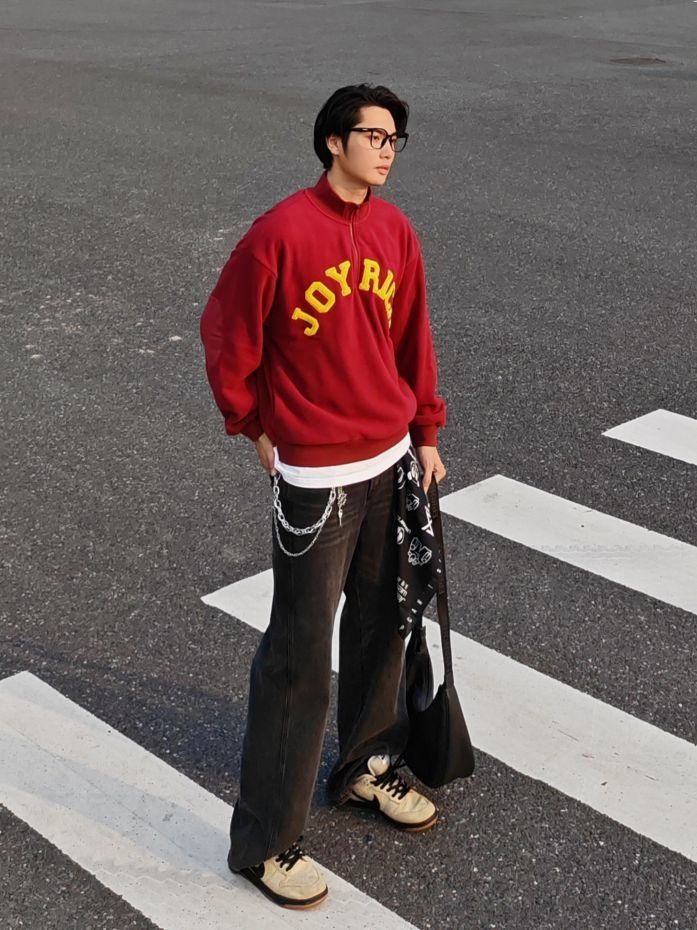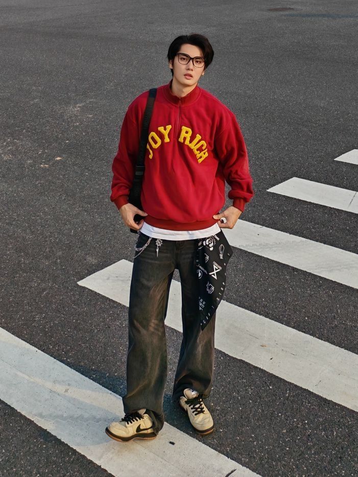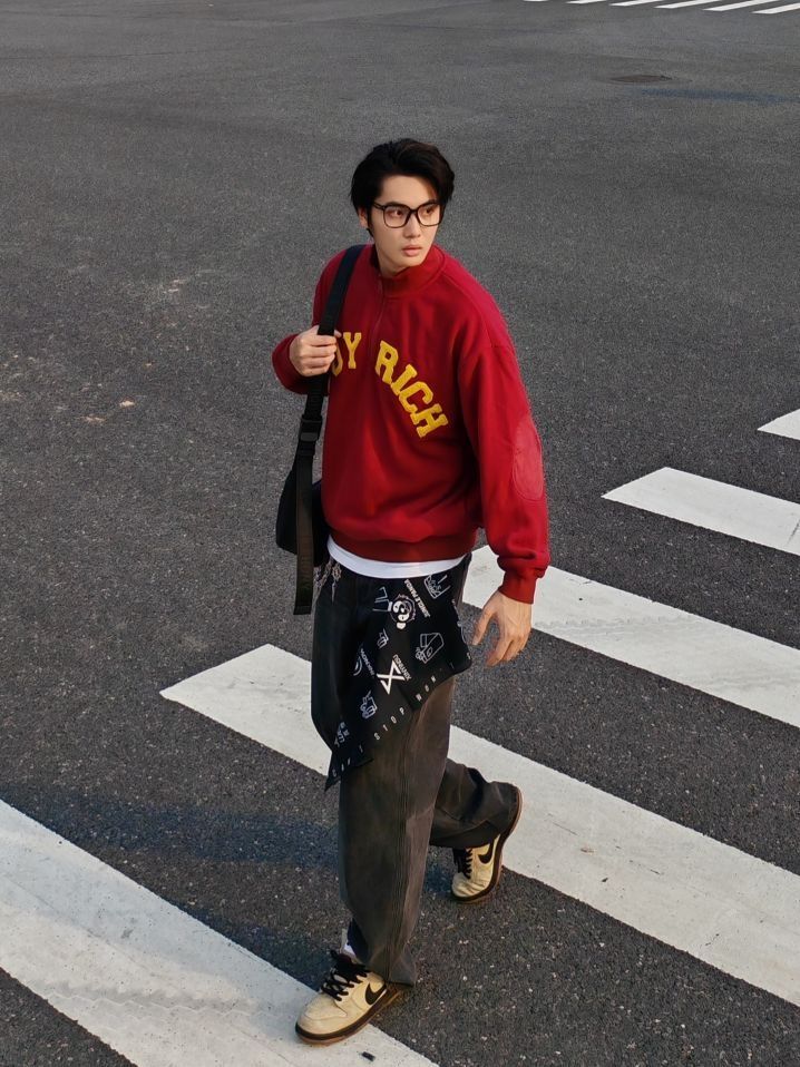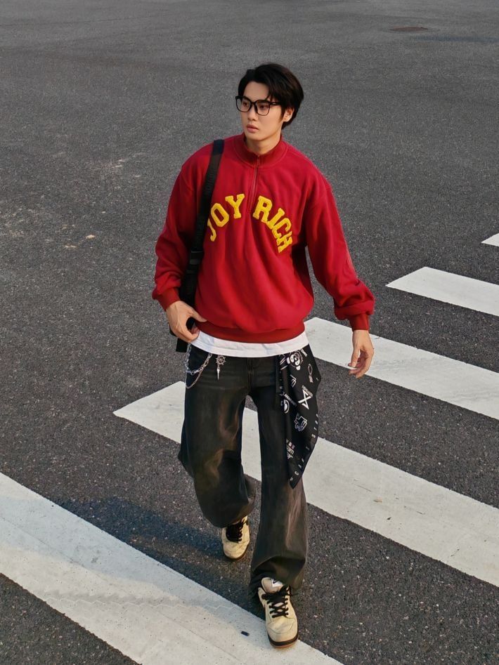 身高|体重:185 70kg 🧍♂️ 穿搭风格:美式复古风 👔 上衣:简约红色印花卫衣叠穿白T恤 👖 下装:宽松牛仔裤 👟 鞋子:复古板鞋 🎒配饰:裤链+方巾系腰间