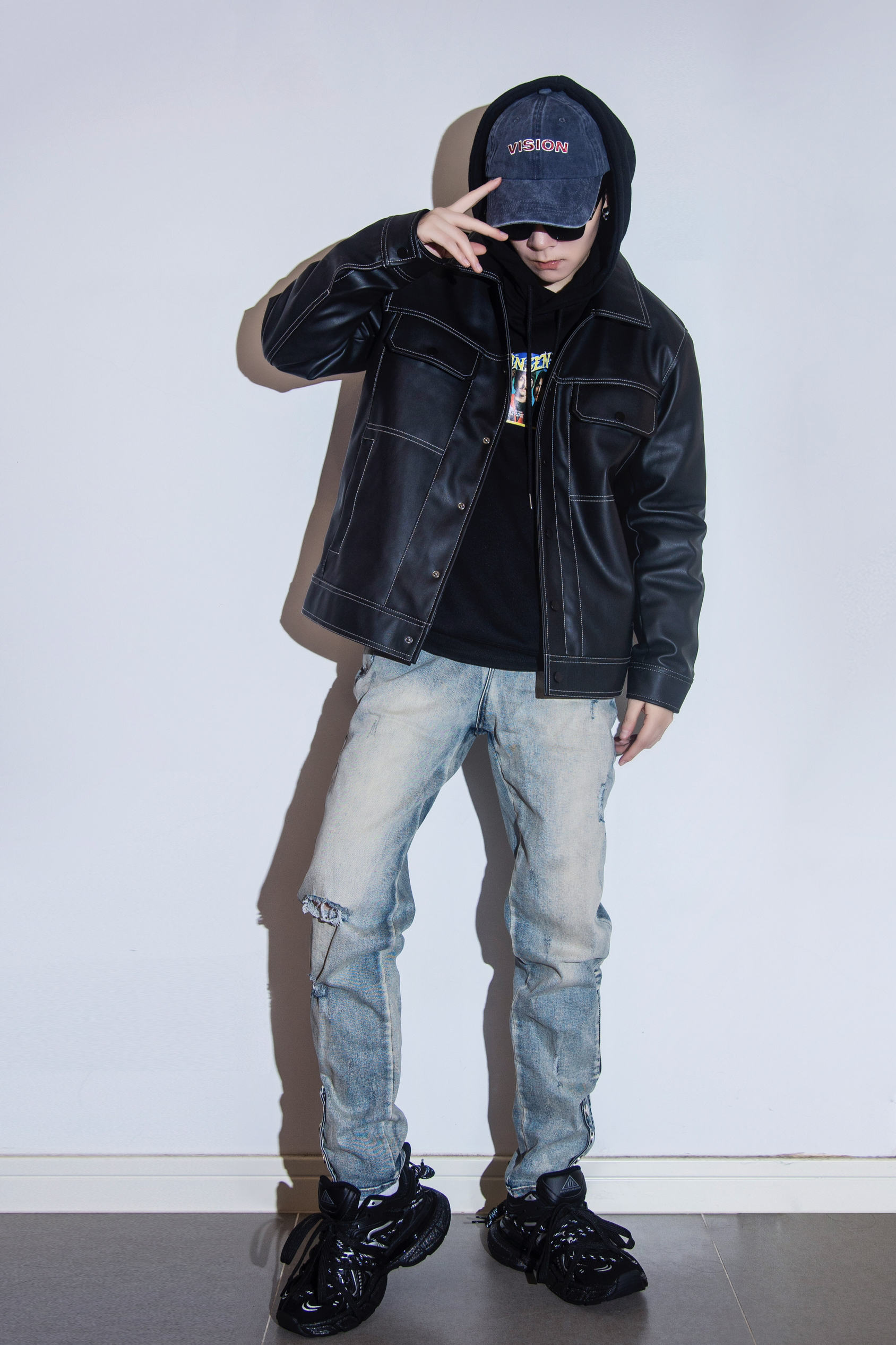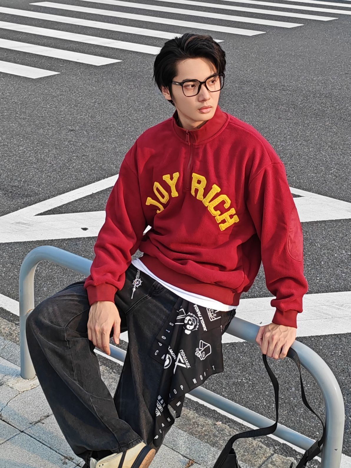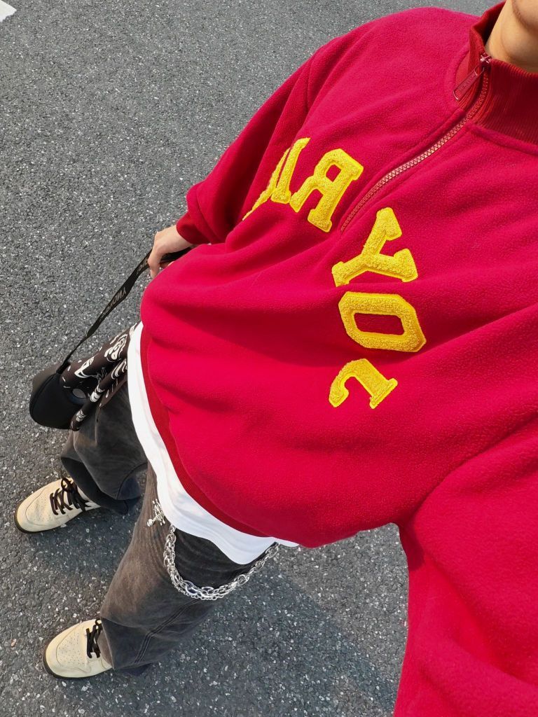 身高|体重:185 70kg 🧍♂️ 穿搭风格:美式复古风 👔 上衣:简约红色印花卫衣叠穿白T恤 👖 下装:宽松牛仔裤 👟 鞋子:复古板鞋 🎒配饰:裤链+方巾系腰间