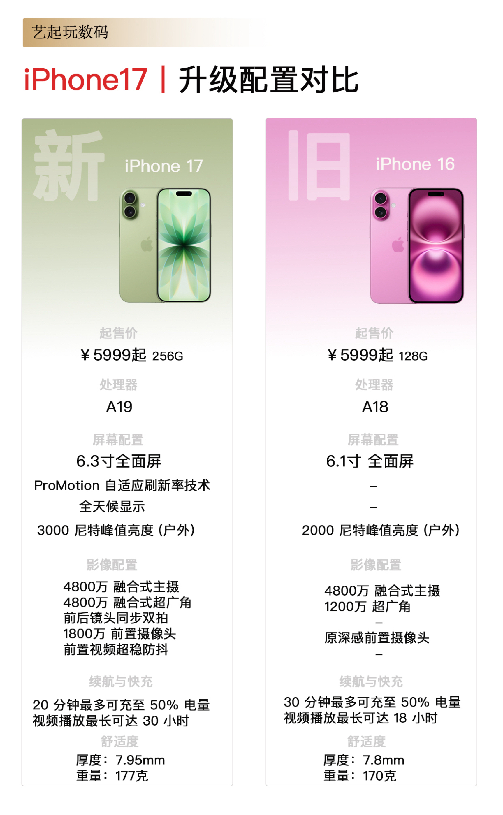 这是苹果第一次挤爆牙膏,iPhone17在我看来可谓是近些年苹果1次性给到最多升级的机型。我做了一个总结,一共有13个升级的地方, 1、起步容量,128G👉🏻256G,价格还是5999,加量不加价 2、A19处理器,补上了神经网络加速器 3、屏幕变大,6.1变6.3 4、ProMotion 自适应刷新率技术,这是大升级,更丝滑流畅 5、全天候显示 6、户外最高3000尼特亮度 7、4800万像素超...