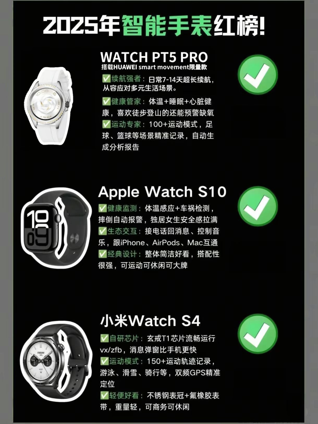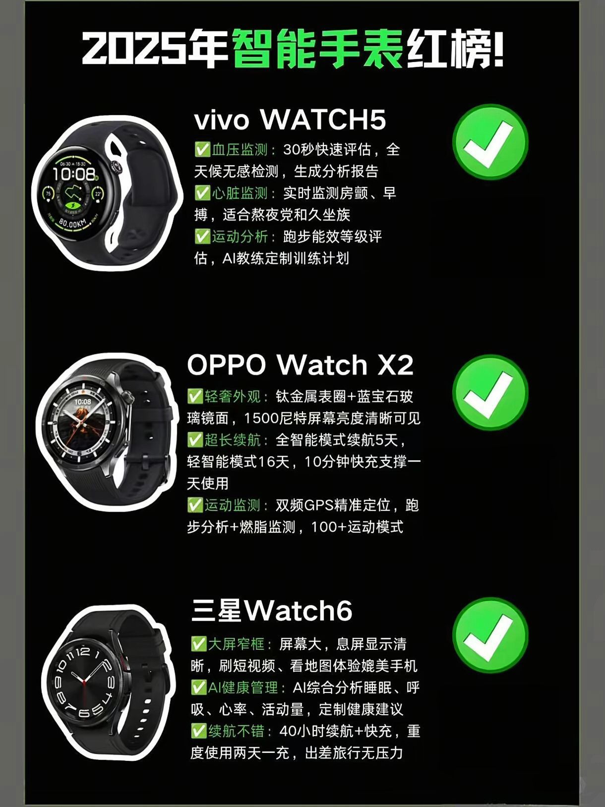 整理了一波今年值得关注的智能手表,给想入手的兄弟姐妹们参考💡 ▪️华为全家桶真的稳 GT4适合健康管理入门,草木绿配色超清新~GT4Pro适合户外党,潜水高原都能扛!FIT3轻到没感觉,熬夜党睡眠监测太实用了👌 ▪️安卓阵营各有绝活 vivo WATCH5的心脏监测对久坐族太友好了,OPPO Watch X2的蓝宝石屏质感拉满,续航直接顶到16天!三星Watch6的AI健康分析有点东西,屏...