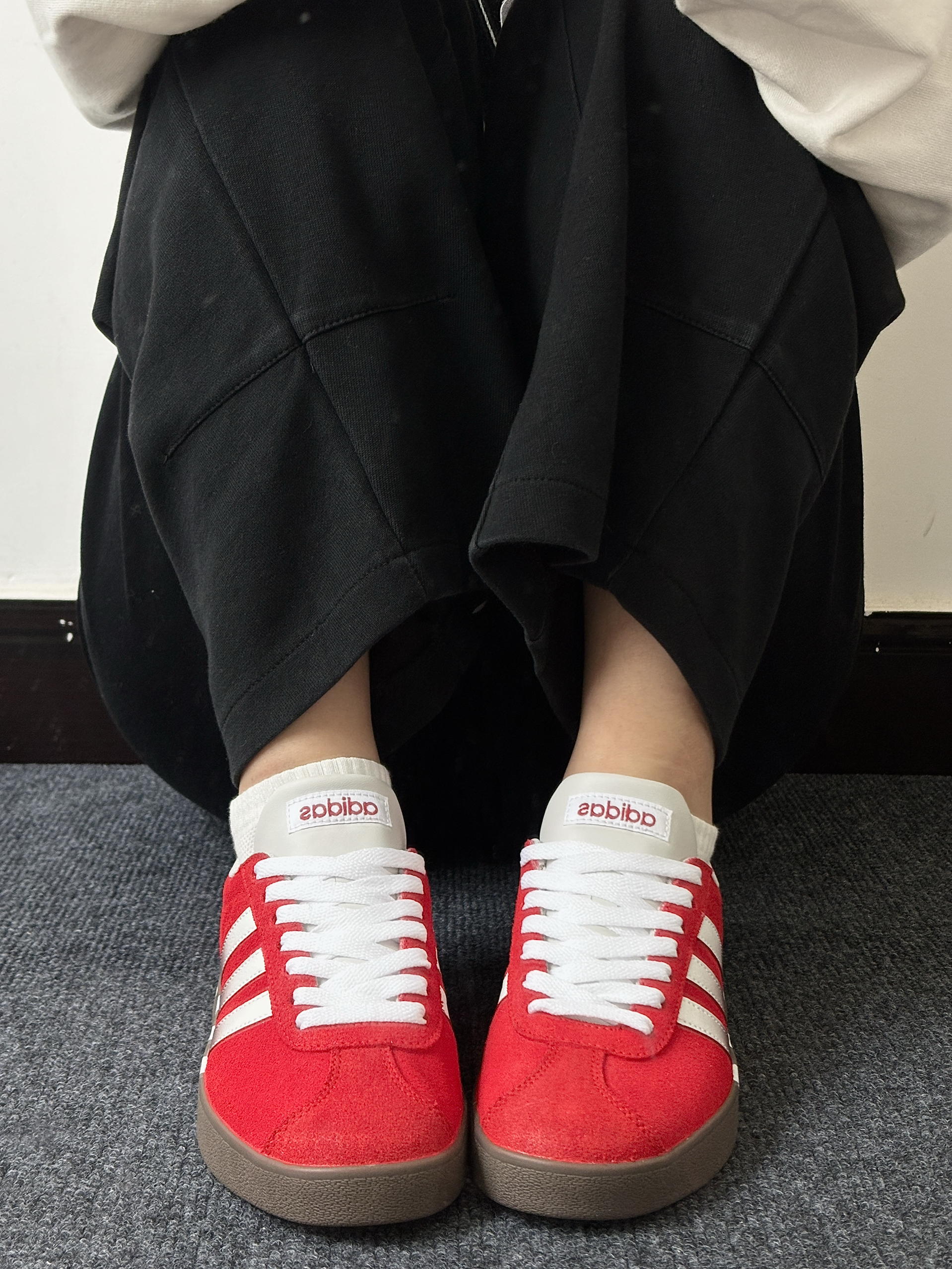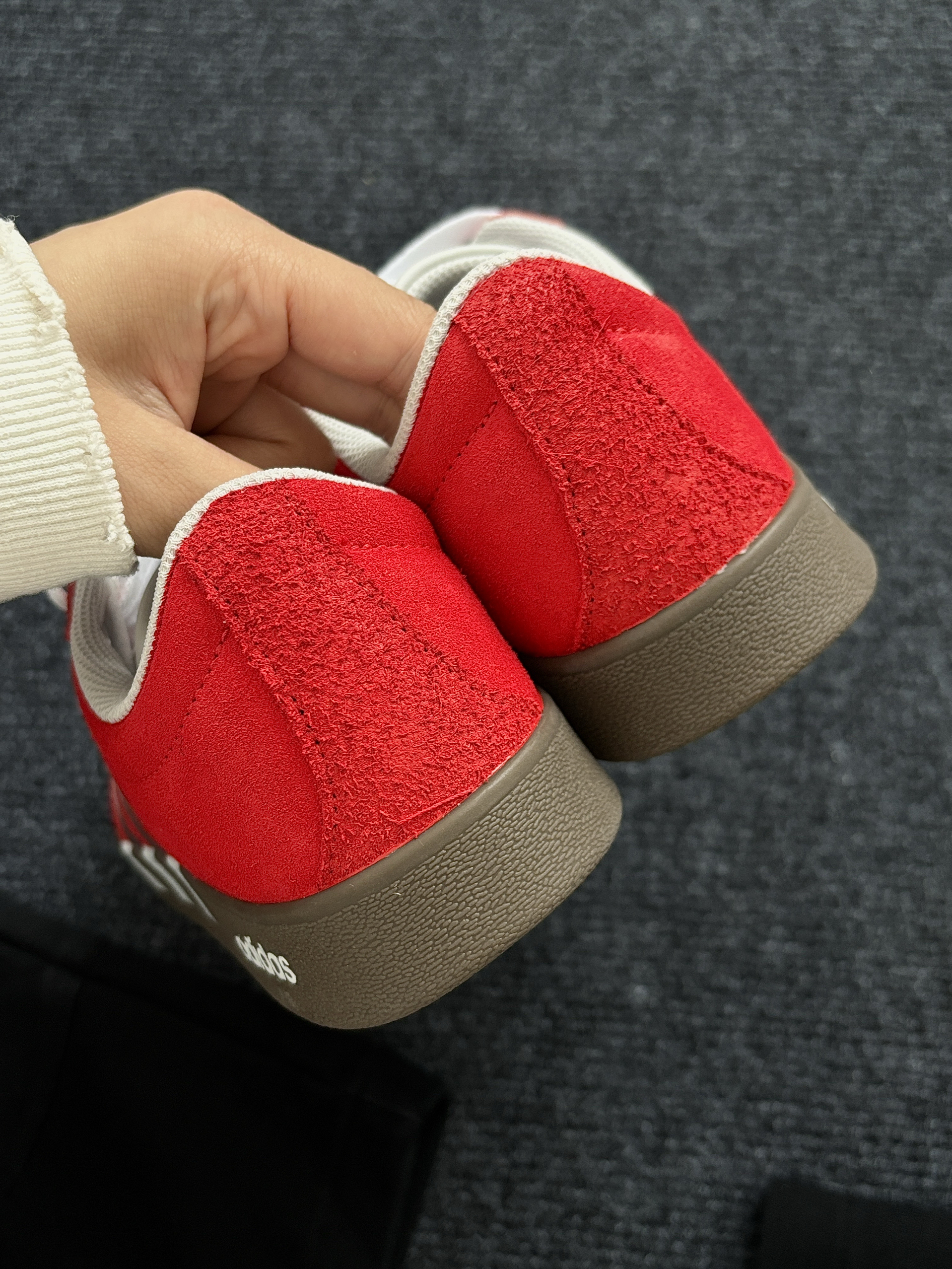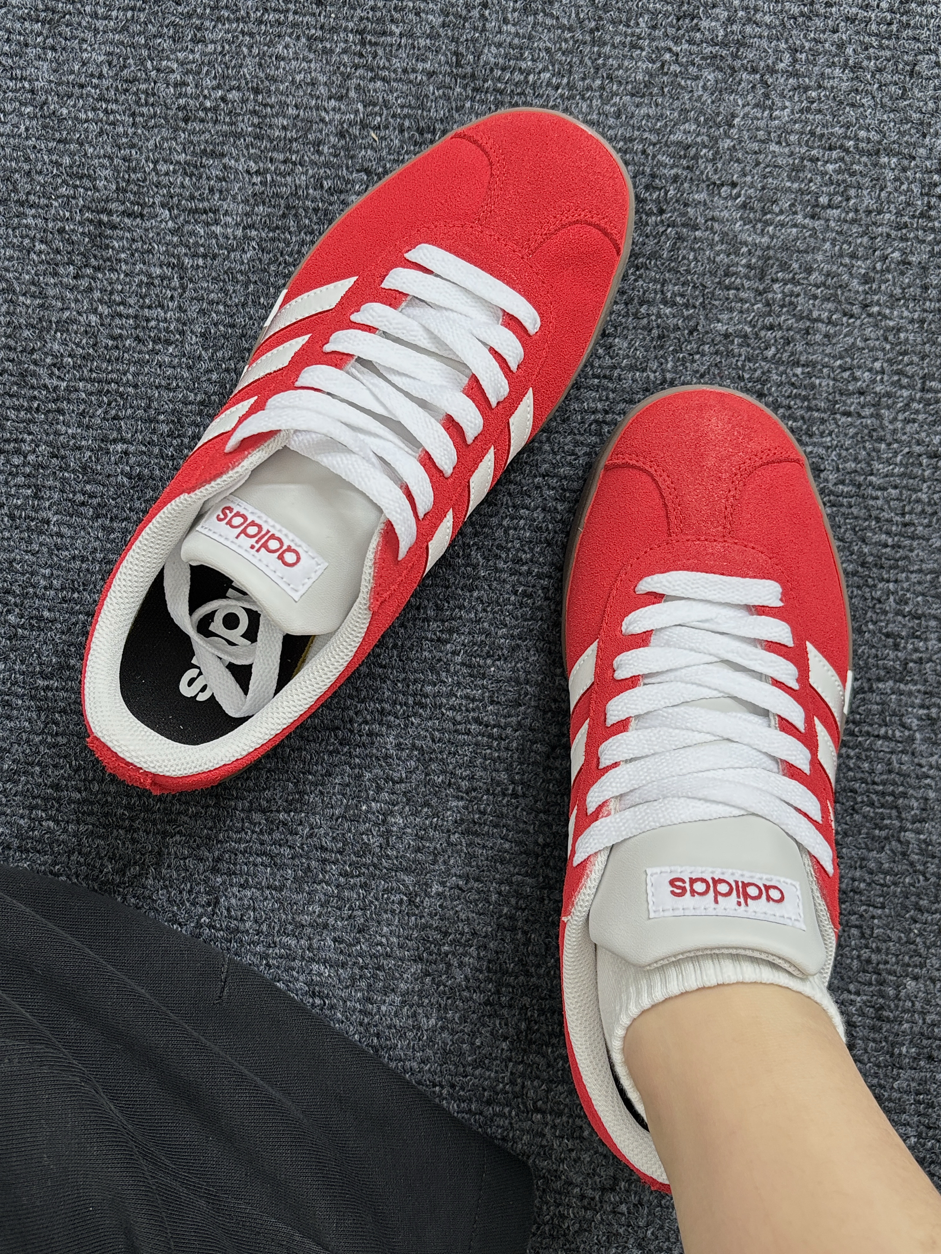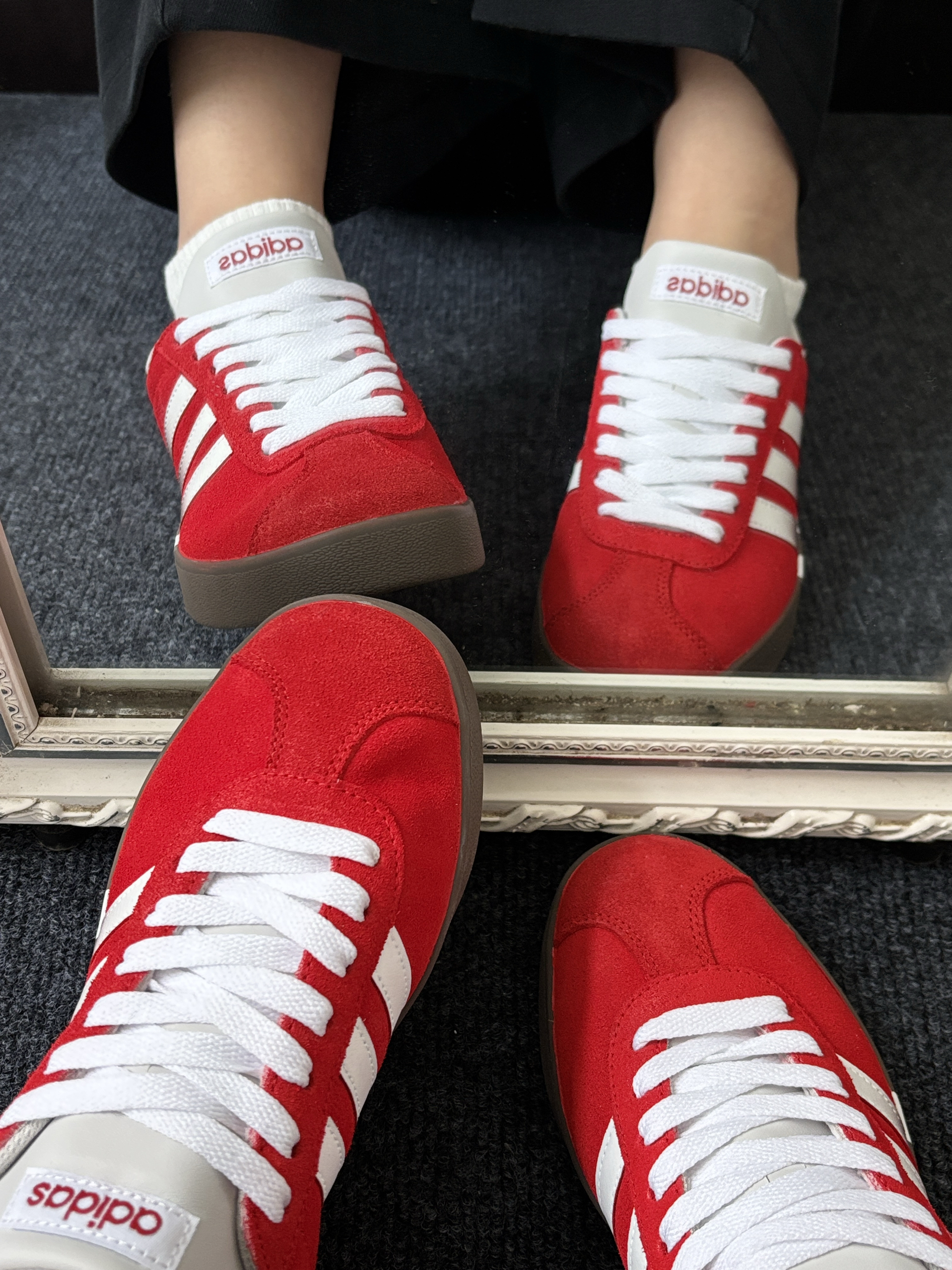 介个阿迪达斯的红鞋也忒显白忒吸睛啦! 红与白的配色very亮眼🫶🏻 经典简单三条纹设计logo很有辨识度 不管是鞋面的质感还是鞋底的纹路细节都很在线 鞋面采用柔软翻毛皮材质上脚轻便舒适 可能会不太好清洁但很有质感 穿搭搭配衣服吼吼看的我可以接受 棕色橡胶大底脚感软软的那种舒服😌 鞋底有纹路可以防滑👌🏻 从不同角度看都能感受到它的好看 芭蕾风可爱风甜酷风时尚休闲风拿捏了 搭配起来也很百搭爱了爱了~