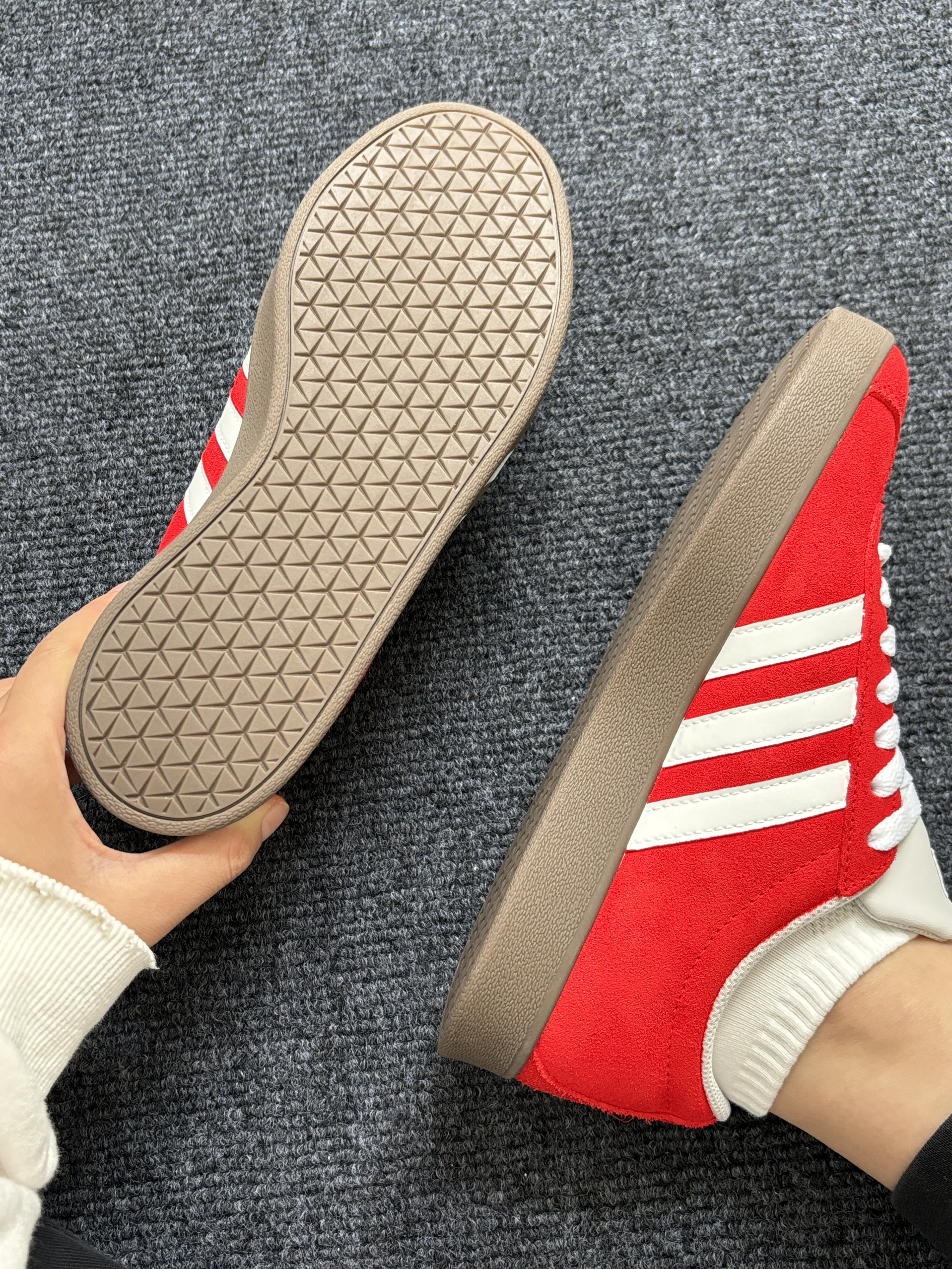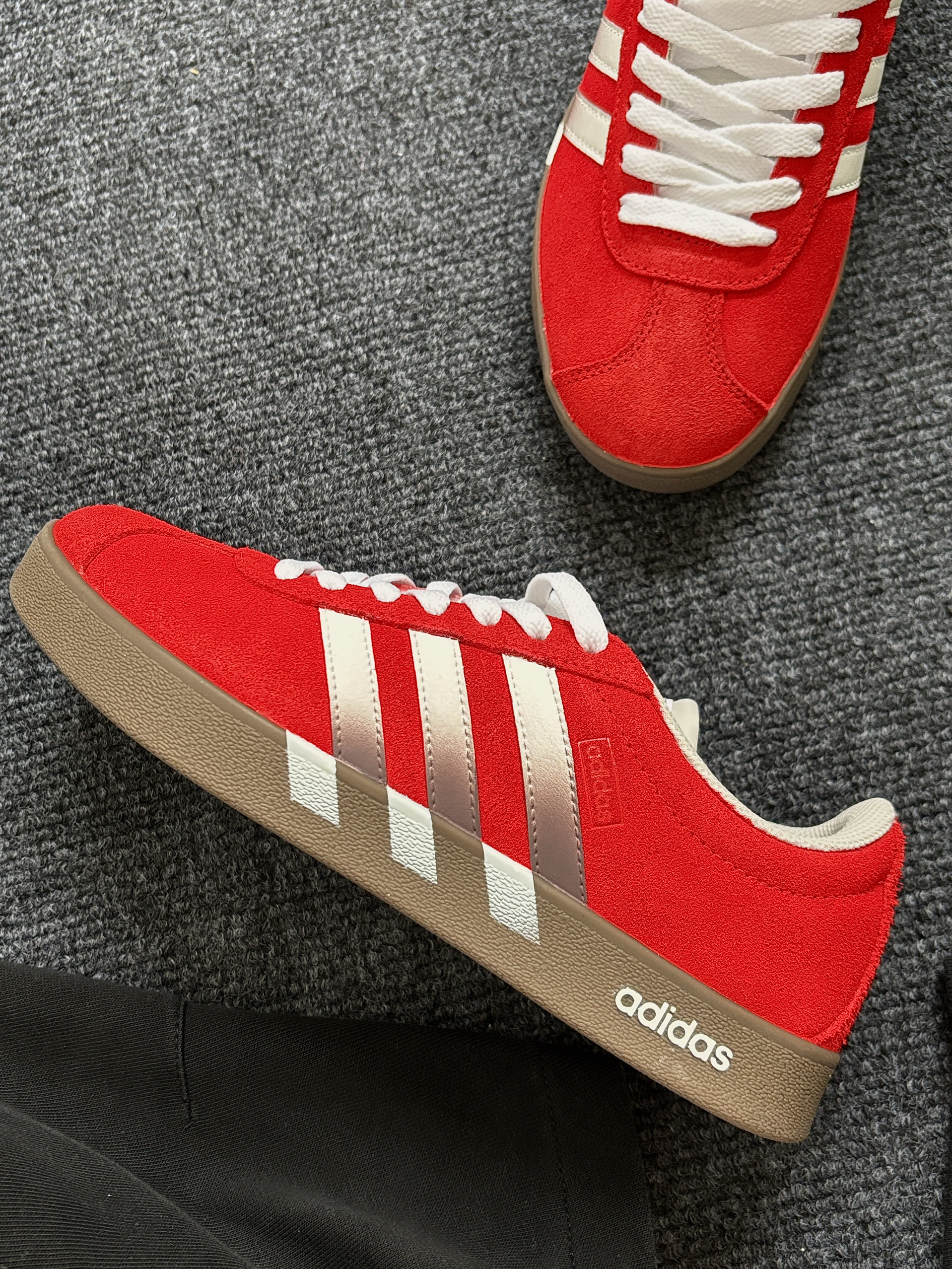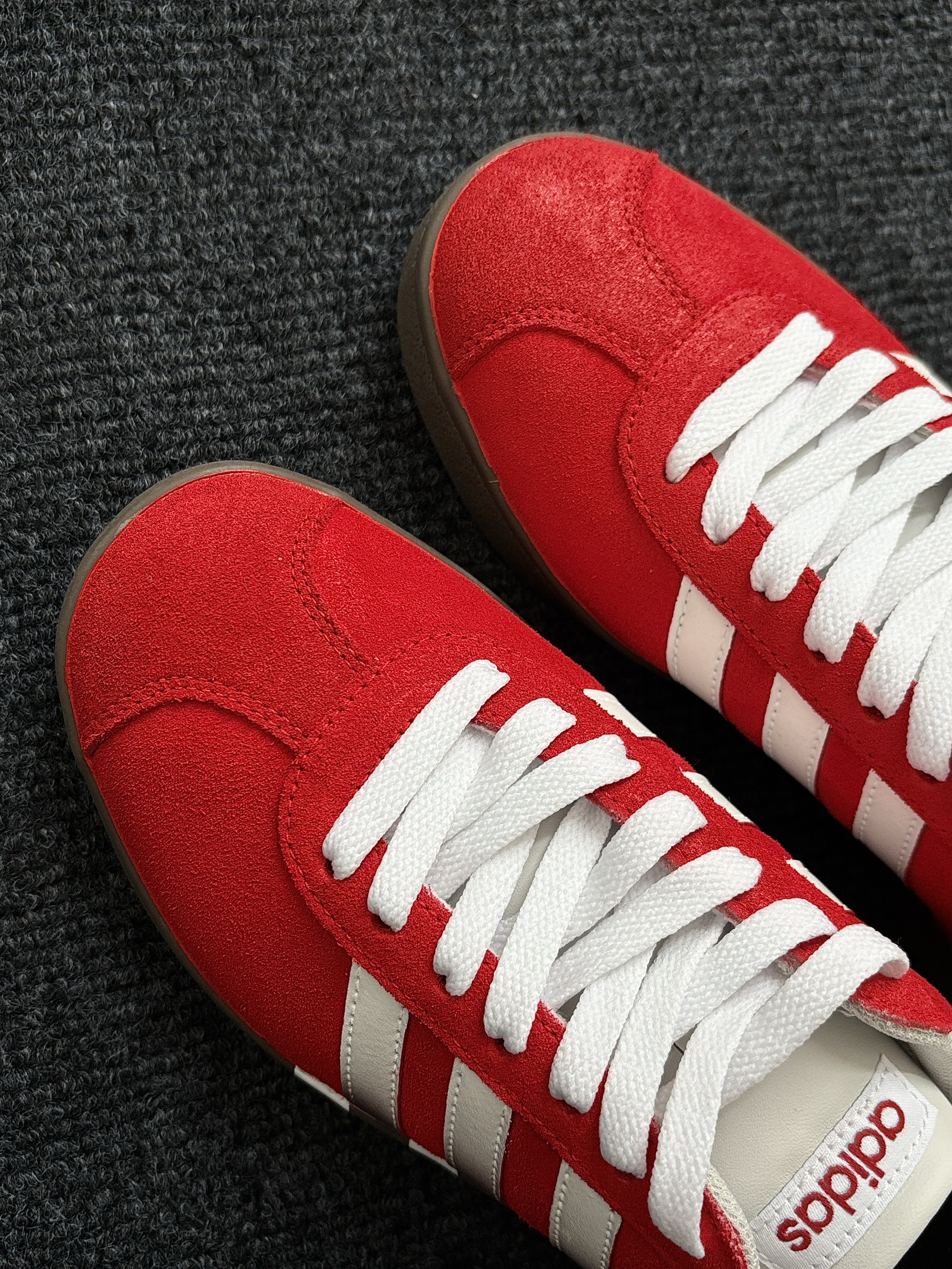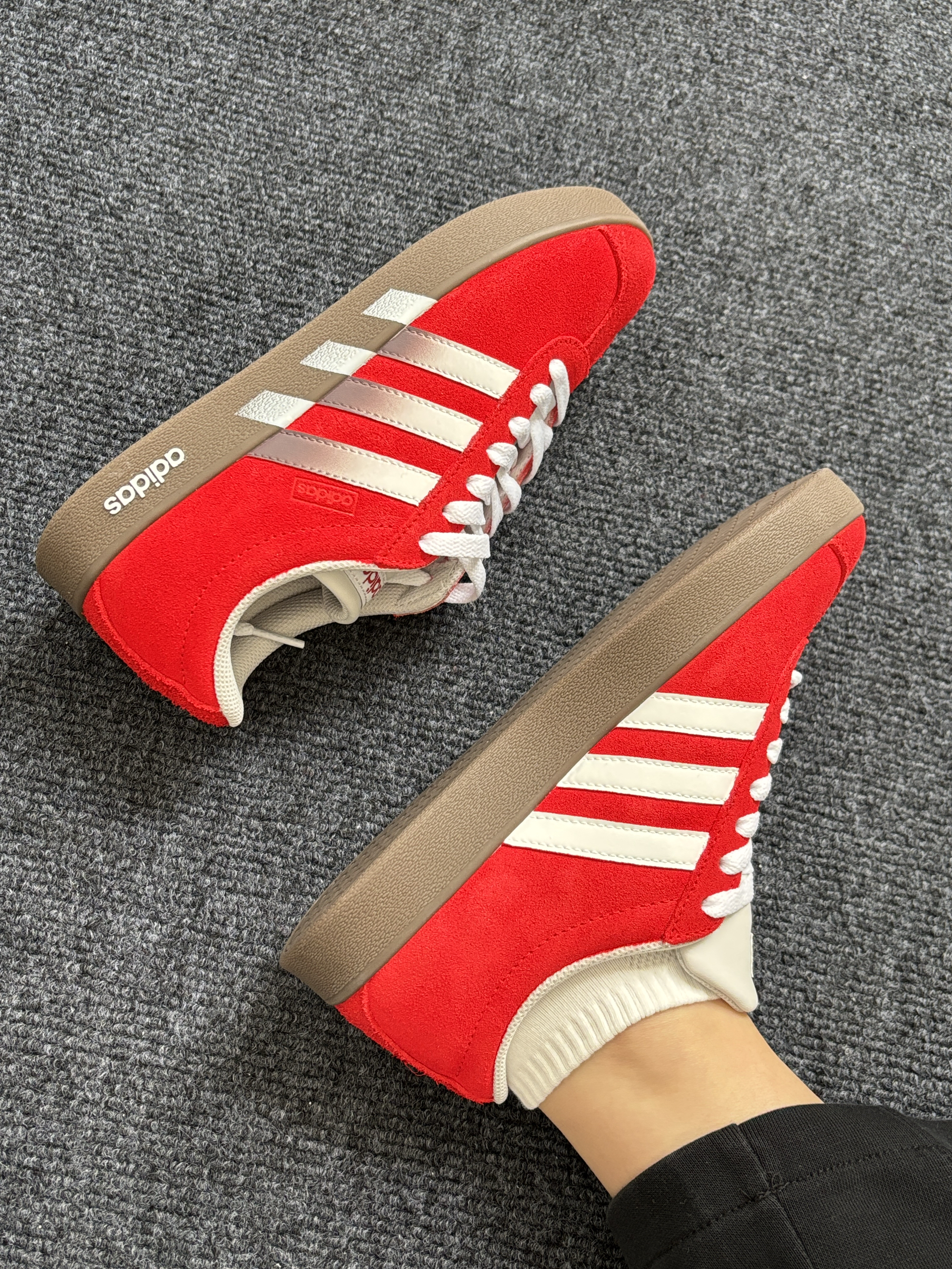 介个阿迪达斯的红鞋也忒显白忒吸睛啦! 红与白的配色very亮眼🫶🏻 经典简单三条纹设计logo很有辨识度 不管是鞋面的质感还是鞋底的纹路细节都很在线 鞋面采用柔软翻毛皮材质上脚轻便舒适 可能会不太好清洁但很有质感 穿搭搭配衣服吼吼看的我可以接受 棕色橡胶大底脚感软软的那种舒服😌 鞋底有纹路可以防滑👌🏻 从不同角度看都能感受到它的好看 芭蕾风可爱风甜酷风时尚休闲风拿捏了 搭配起来也很百搭爱了爱了~