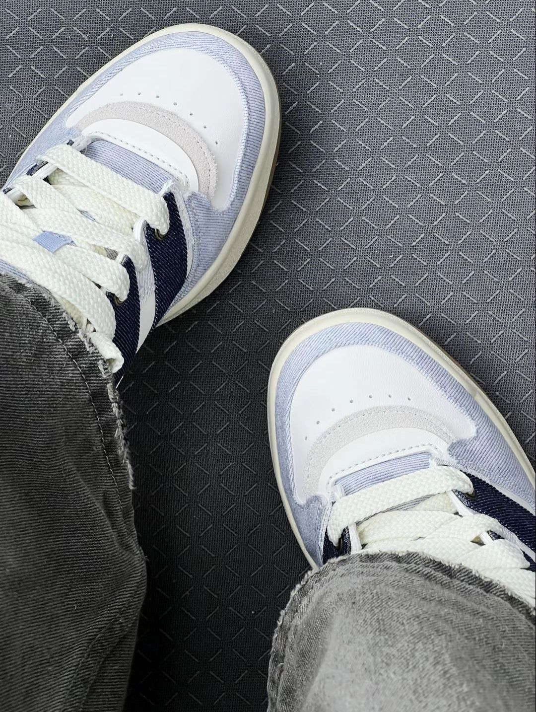 浅蓝牛仔拼接设计是真好看,复古又清新,配牛仔裤、休闲裤都很和谐1鞋面材质混搭,牛仔布部分透气,但也容易沾灰,得经常打理。 上脚第一感觉,鞋底不算软,长时间走路会有点累脚,好在支撑性还不错。鞋码我穿着刚好,不过鞋型偏窄,脚宽的朋友可能得选大半码,不然挤脚 做工细节有优点也有槽点,车线工整,但鞋舌上的皮质标有点硬,偶尔会磨脚踝。整体来说,颜值和搭配性是我留下它的理由,要是追求极致脚感和耐脏,得再考虑考...