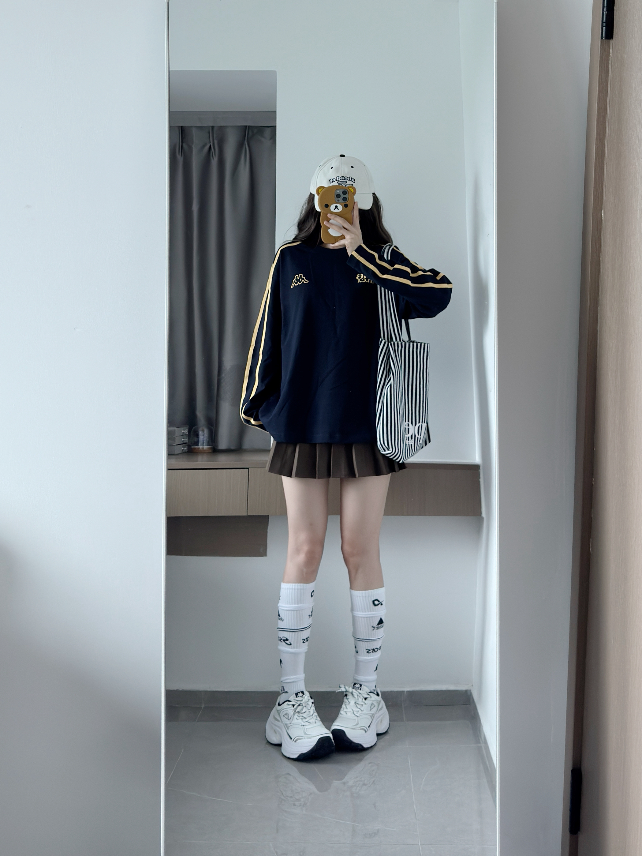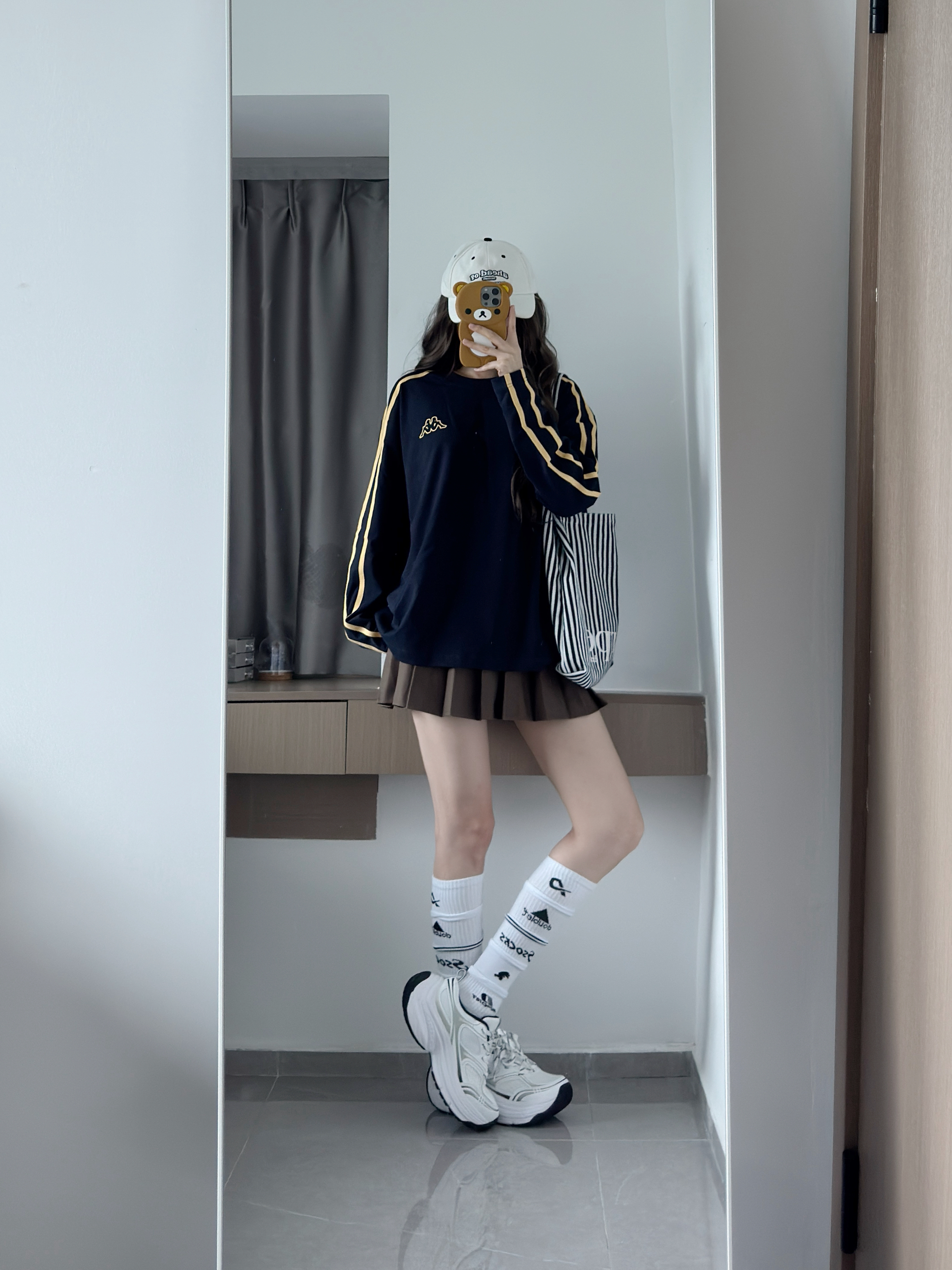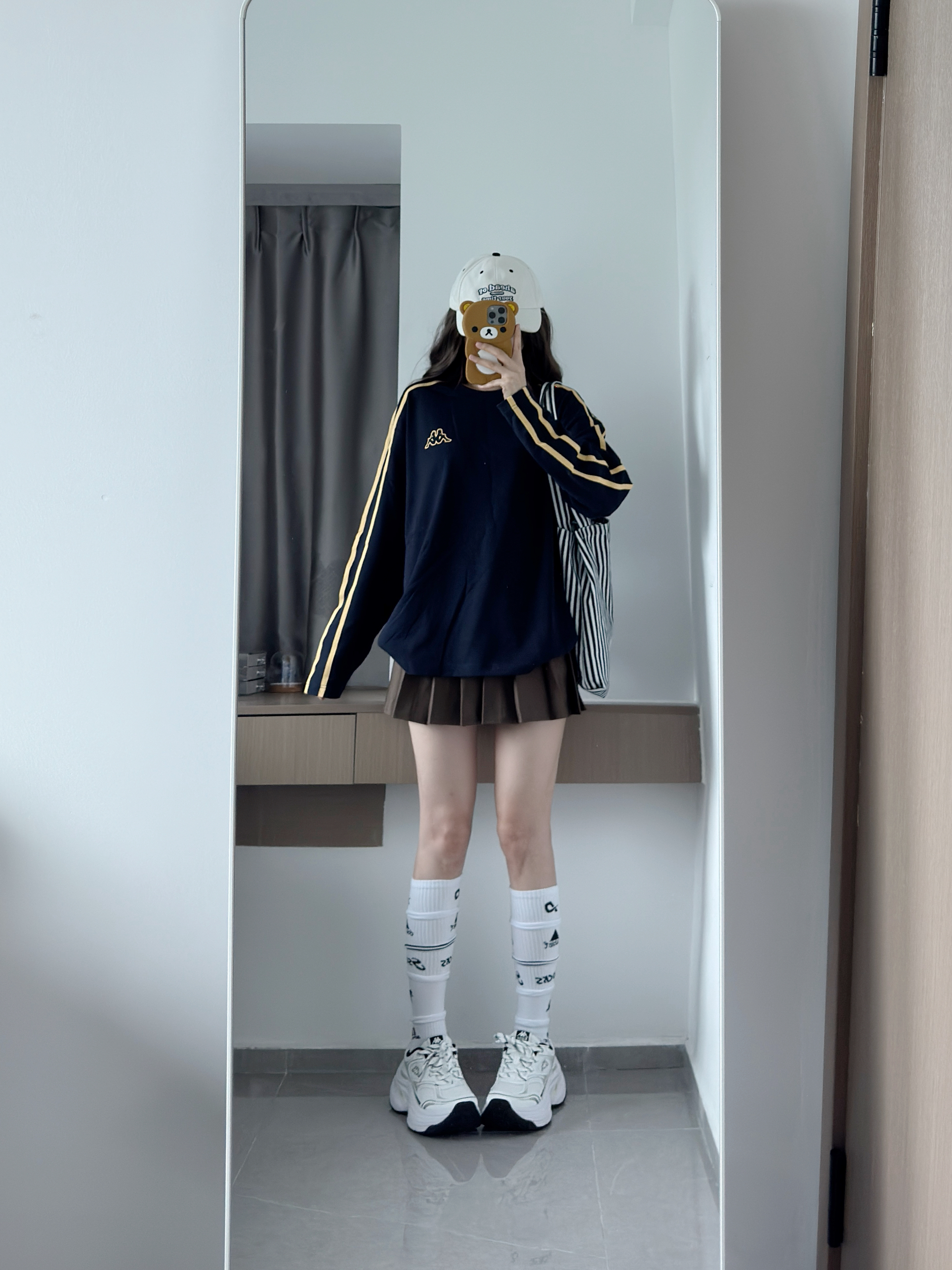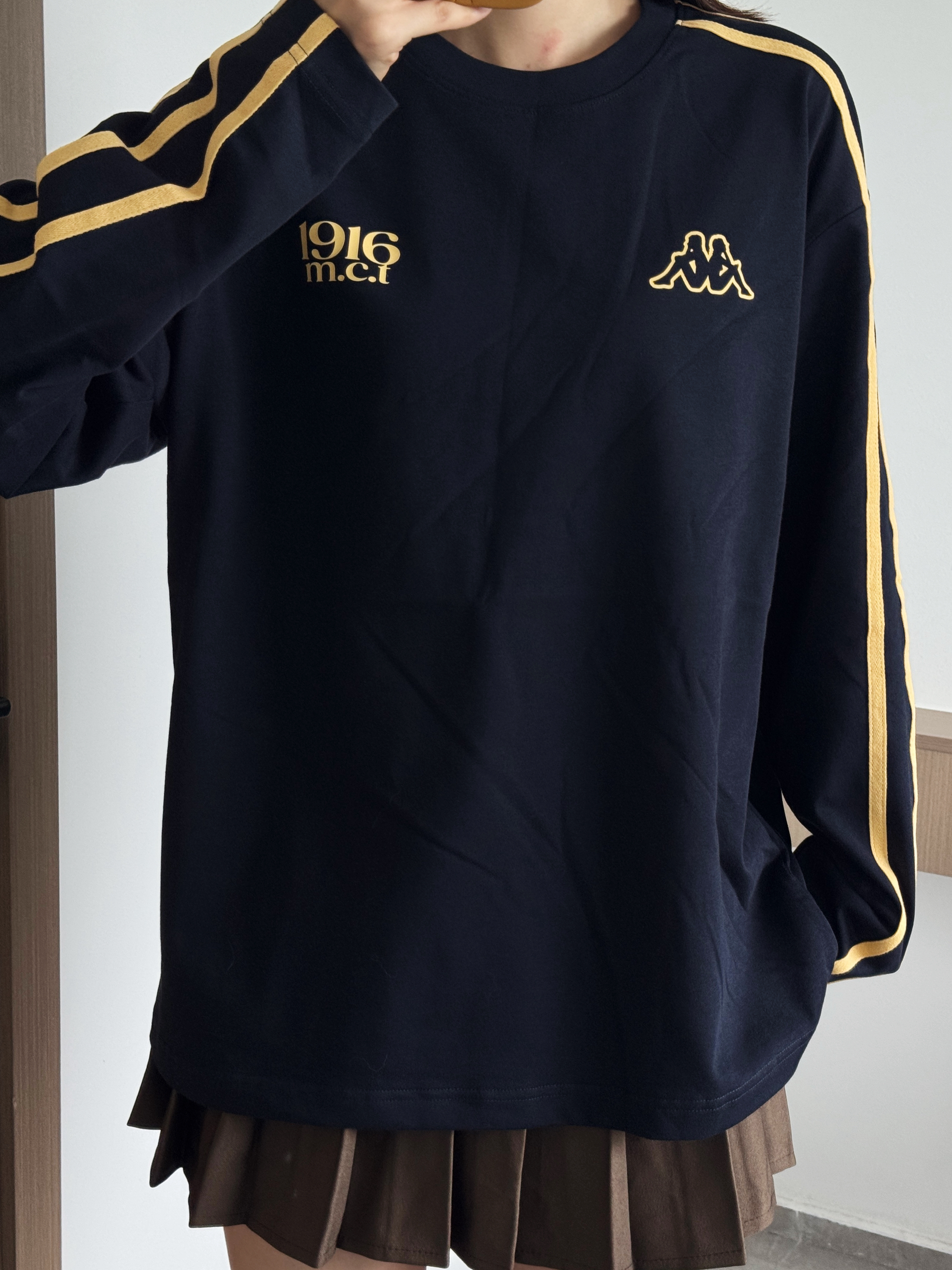 藏青色卫衣也泰显白啦~ 黄色条纹撞色好复古 慵懒版型好有ins那味呀 搭配百褶裙和老爹鞋一套又韩又松弛🥰