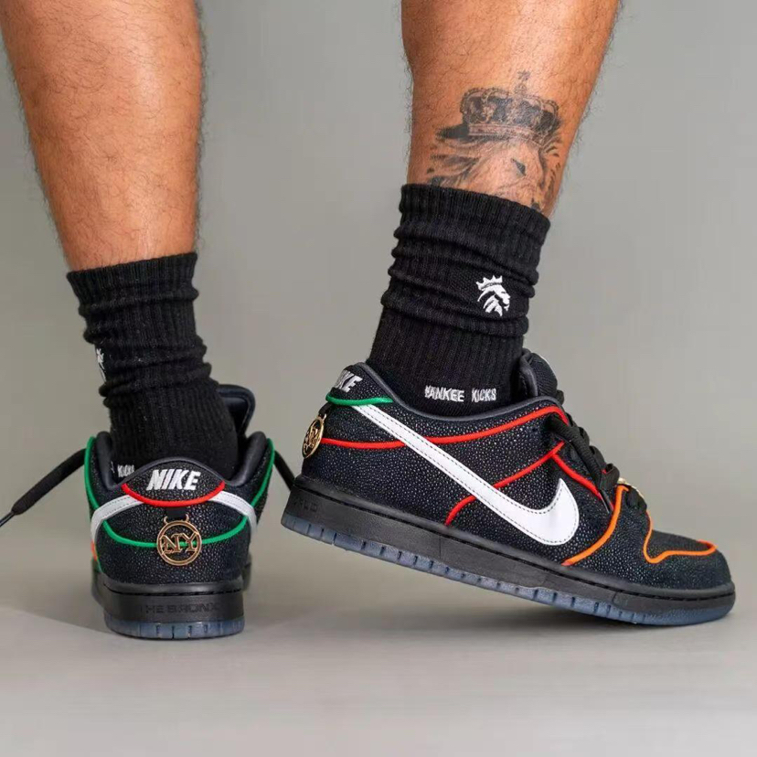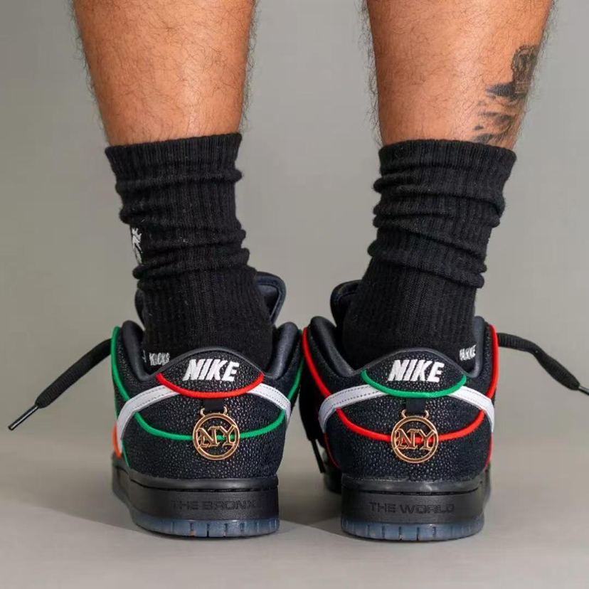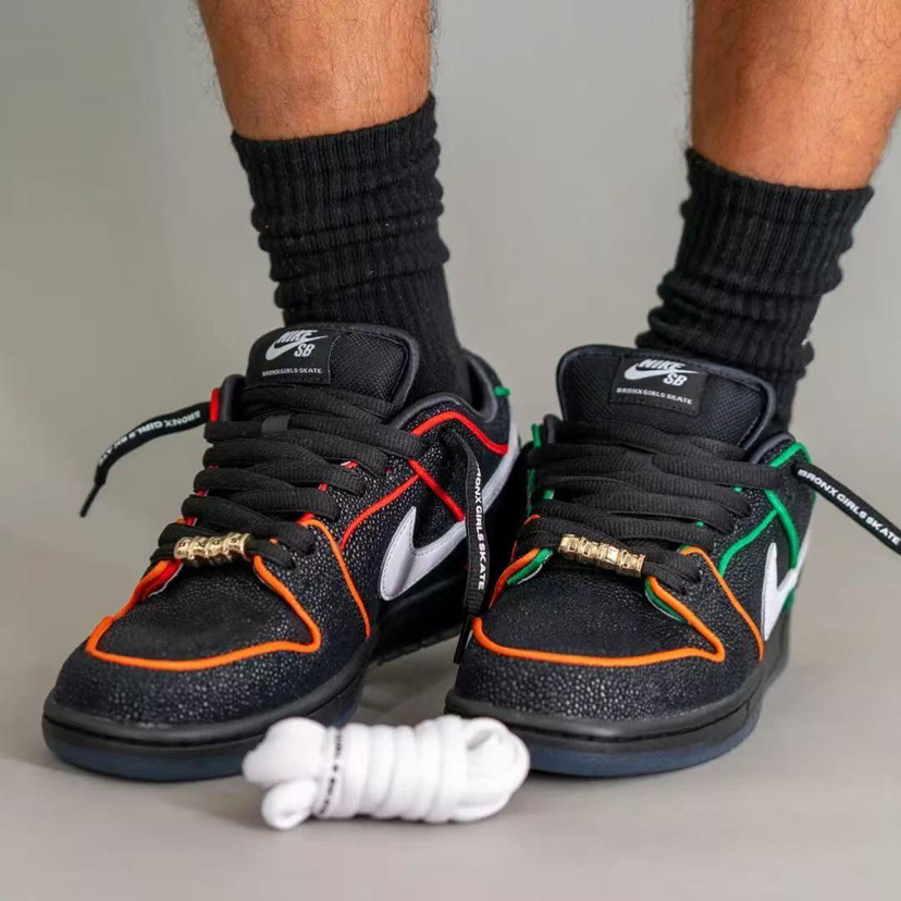 Nike SB与纽约布朗克斯滑板社团Bronx Girls Skate的合作款SB Dunk Low终于揭晓神秘面纱。 这款联名鞋以其超高规格和丰富细节,在正式发售前就已引发鞋圈热议。鞋面采用罕见的魔鬼鱼皮纹理皮革覆盖,辅以橙绿双色勾勒出鸳鸯装扮,质感与辨识度同时在线。鞋头、后跟甚至中底都安排了全新设计。后跟压印有“THE BRONX”与“THE WORLD”字样,分别代表品牌精神。鞋带扣上配有金...