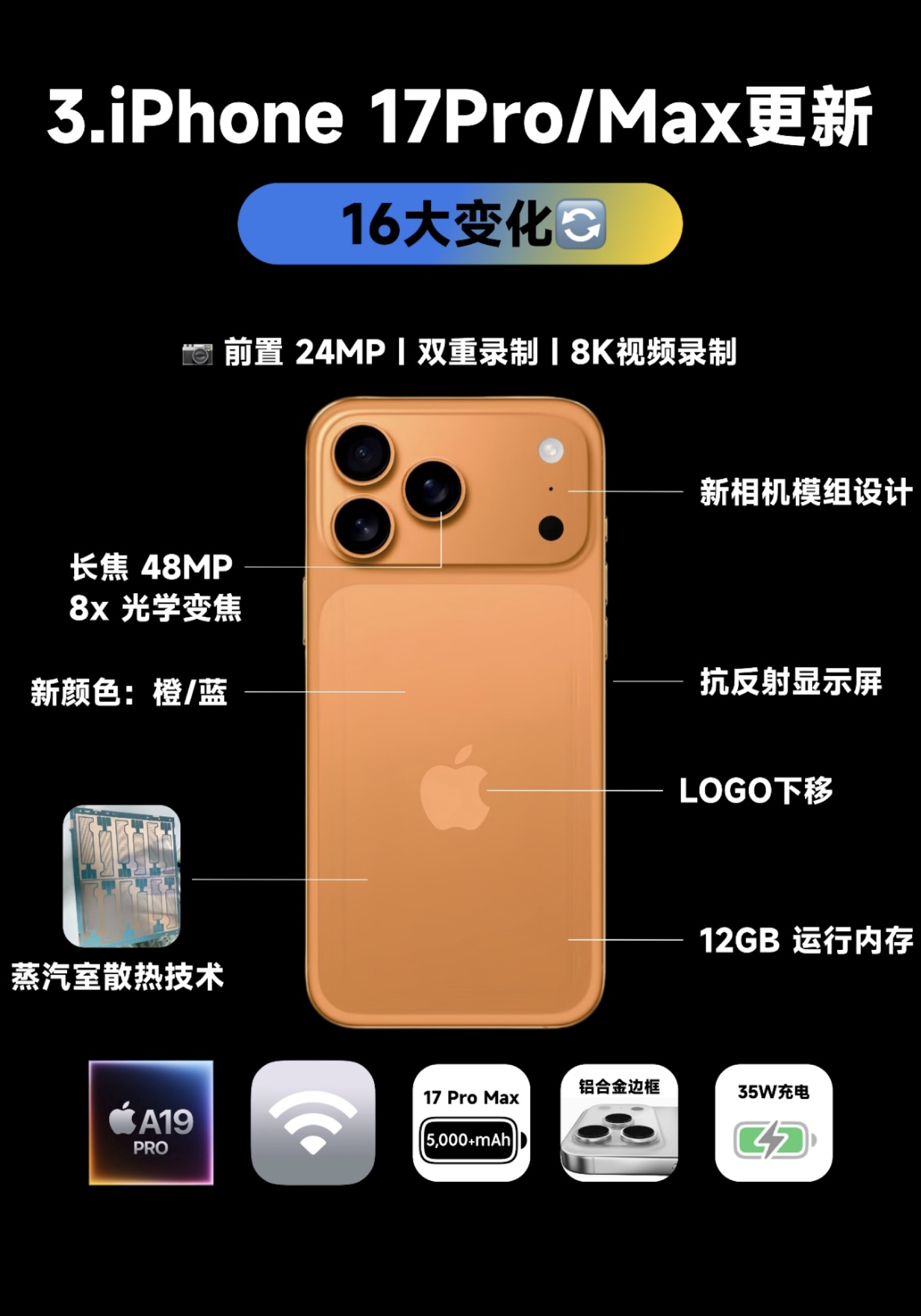 本篇笔记关联了Apple/苹果 iPhone17 Pro Max 5G 手机 抗反射显示屏 全新散热系统 4800万像素镜头全模组 8K视频录制 8倍变焦 支持WIFI7 全网通 双卡 视网膜屏 星宇橙色等商品,为用户提供真实的使用体验和购买参考。